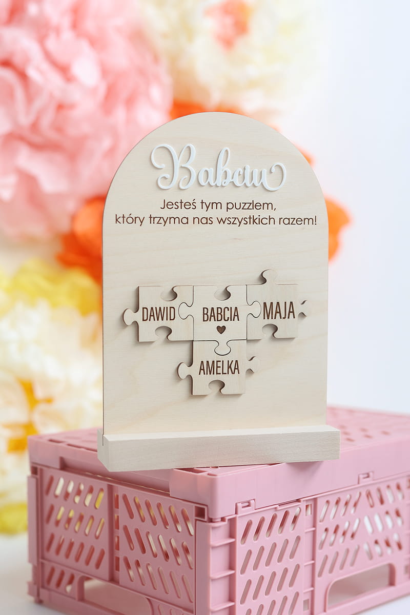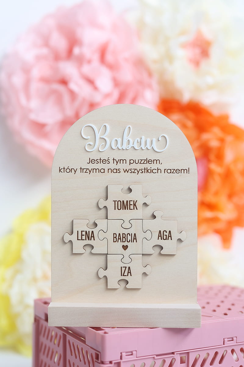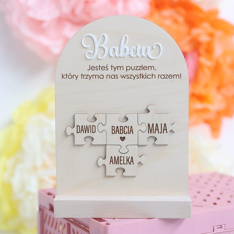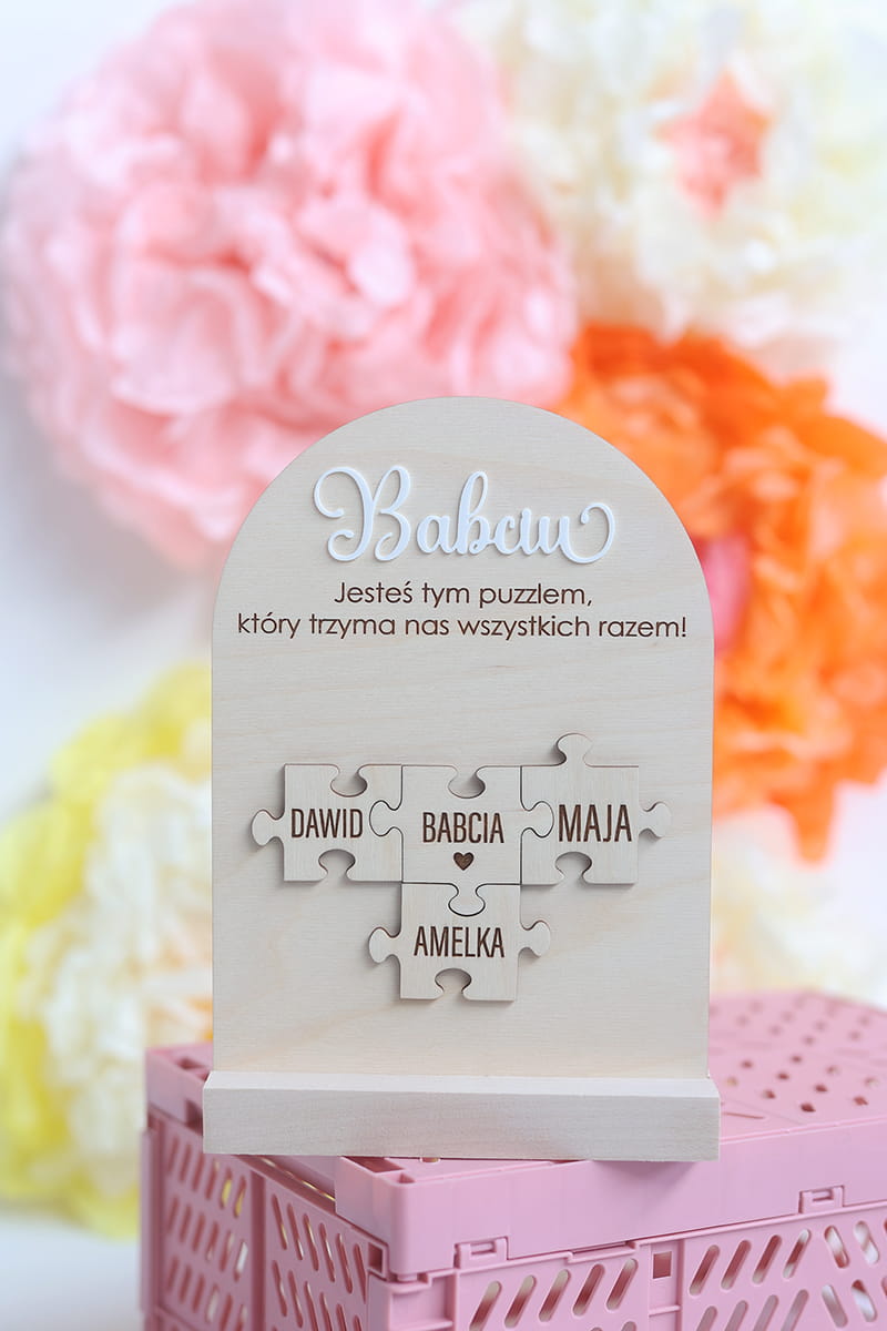 Wzruszająca tabliczka z motywem puzzli. Dedykowana Babci, Dziadkowi lub obojgu. Do tabliczki dołączona jest solidna, bukowa podstawka.