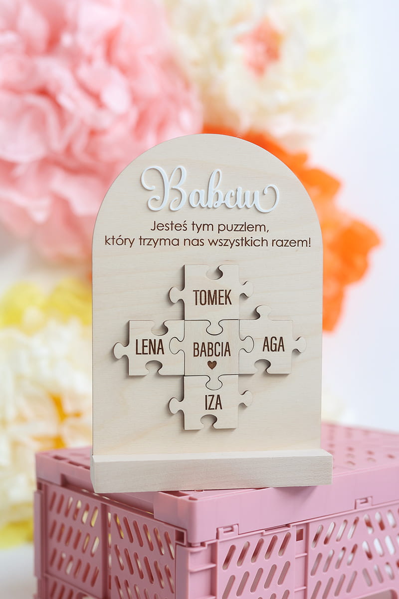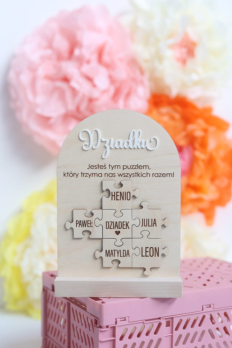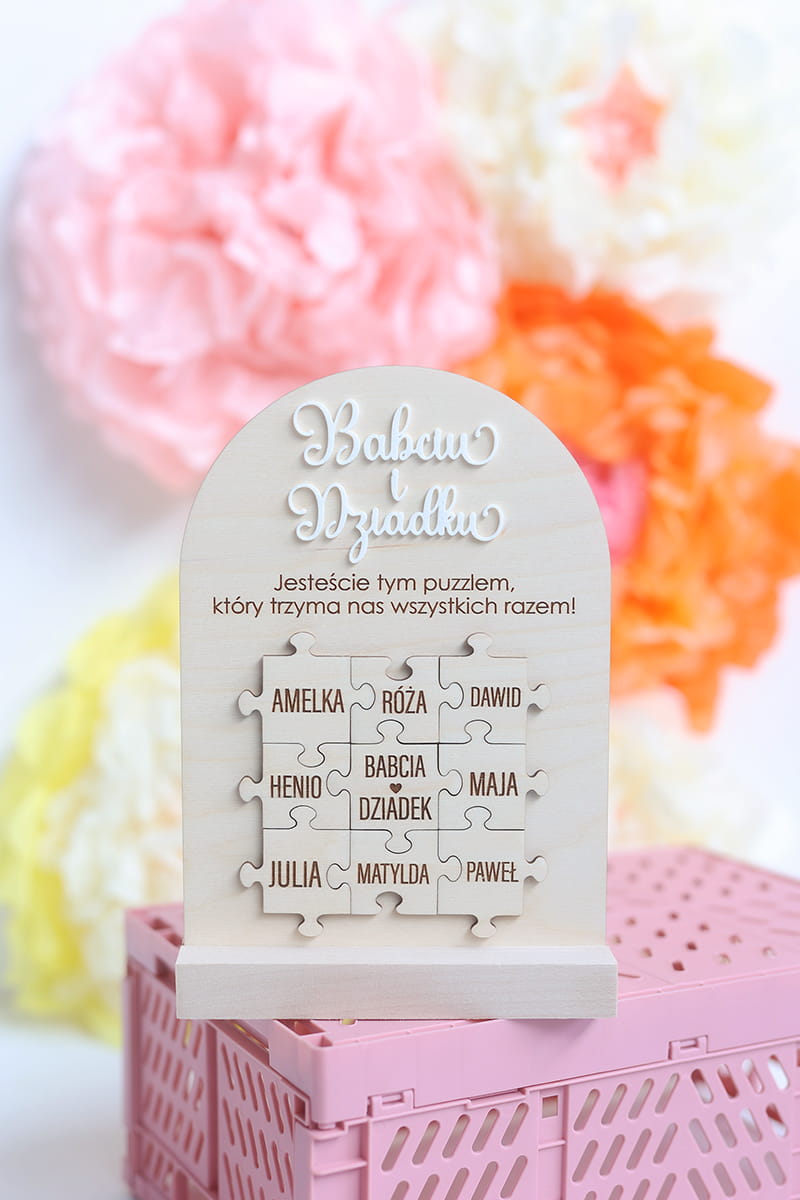 Tabliczka, oprócz głównego puzzla, pomieści od 2 do 8 dodatkowych elementów z imionami wnuków lub innych członków rodziny.