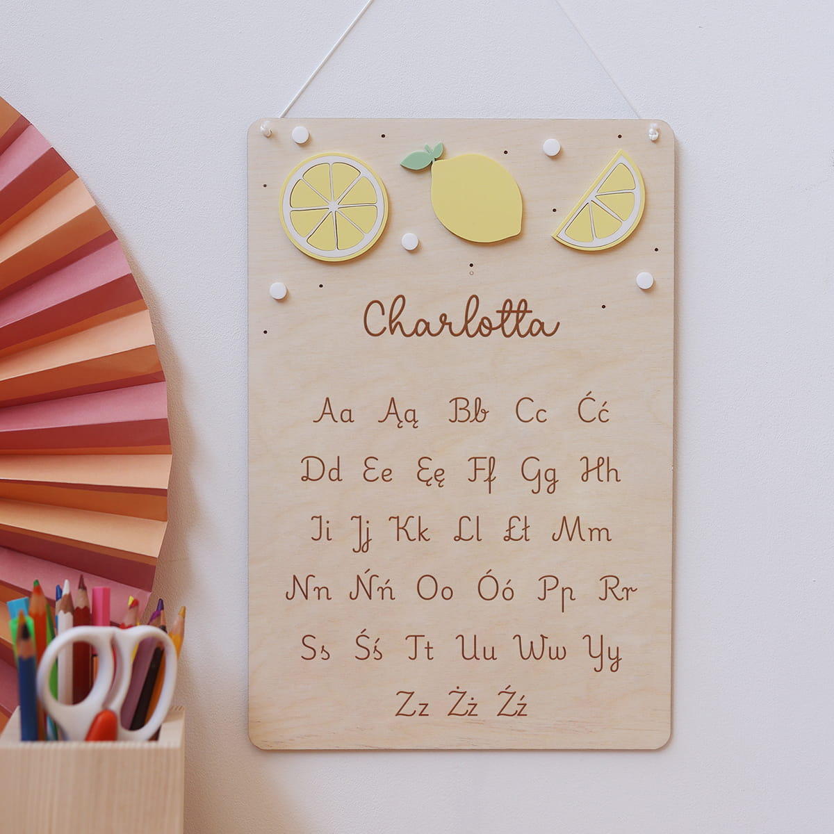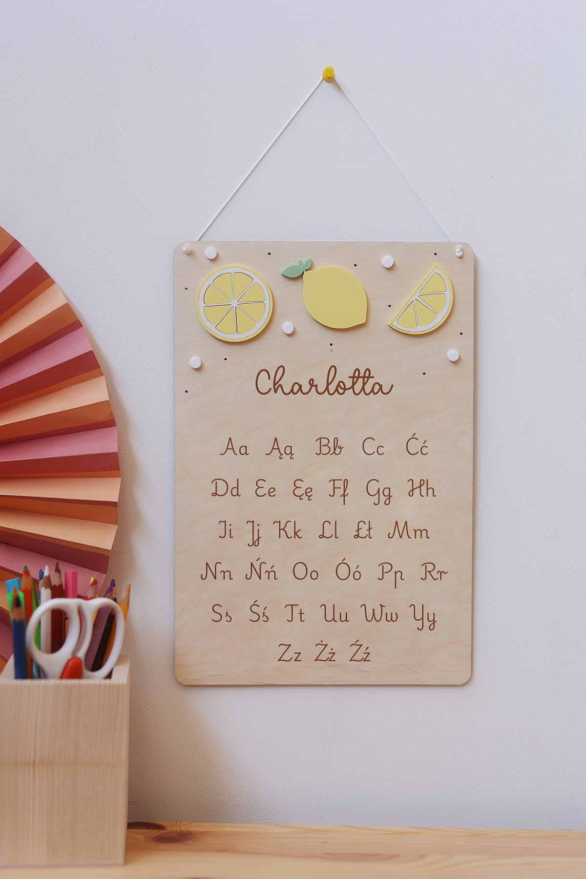 Drewniana tabliczka edukacyjna z alfabetem to idealna pomoc do nauki pisania i poznawania liter. Stanowi również niezwykłą dekorację pokoju dziecięcego. Tabliczkę możesz spersonalizować dowolnym słowem/imieniem.