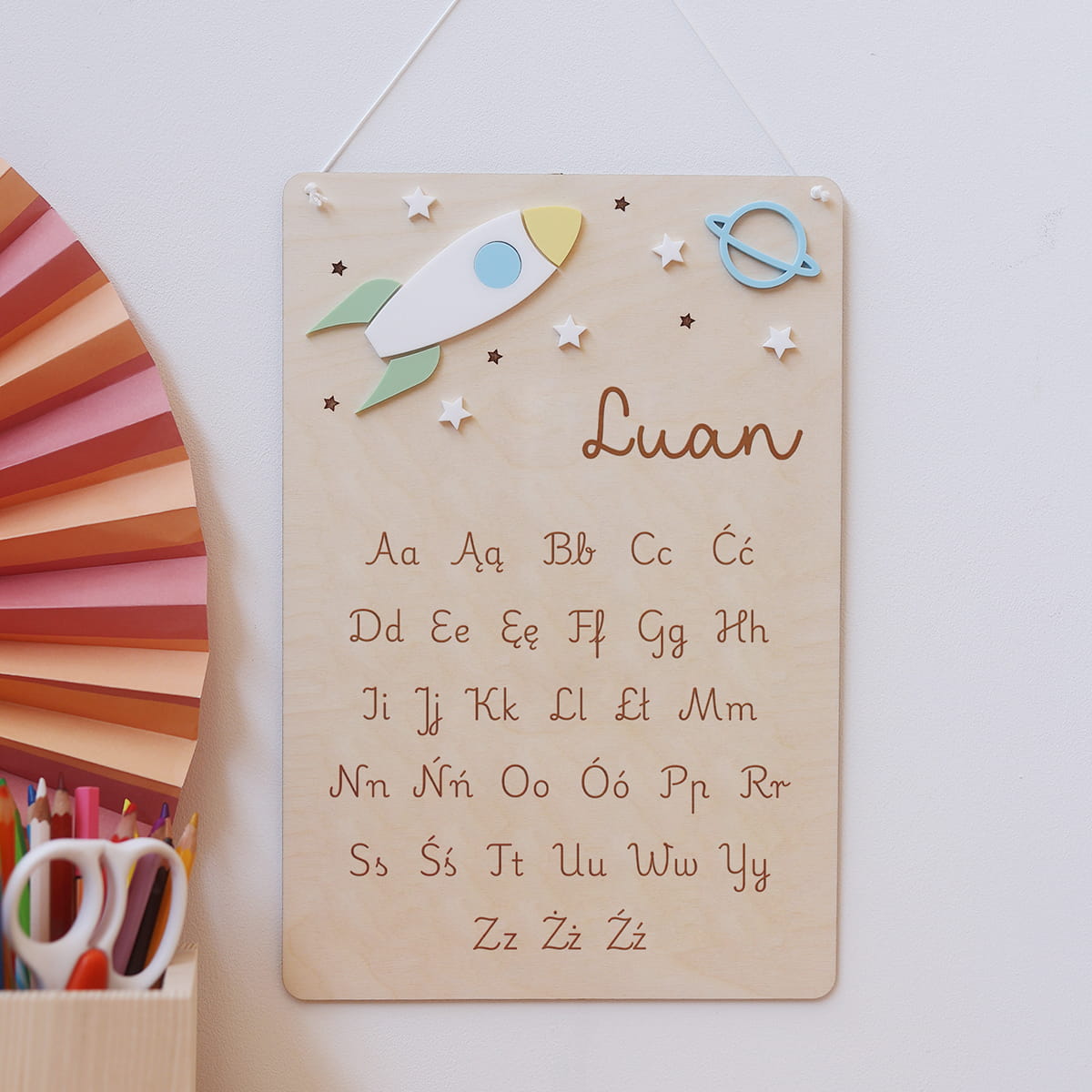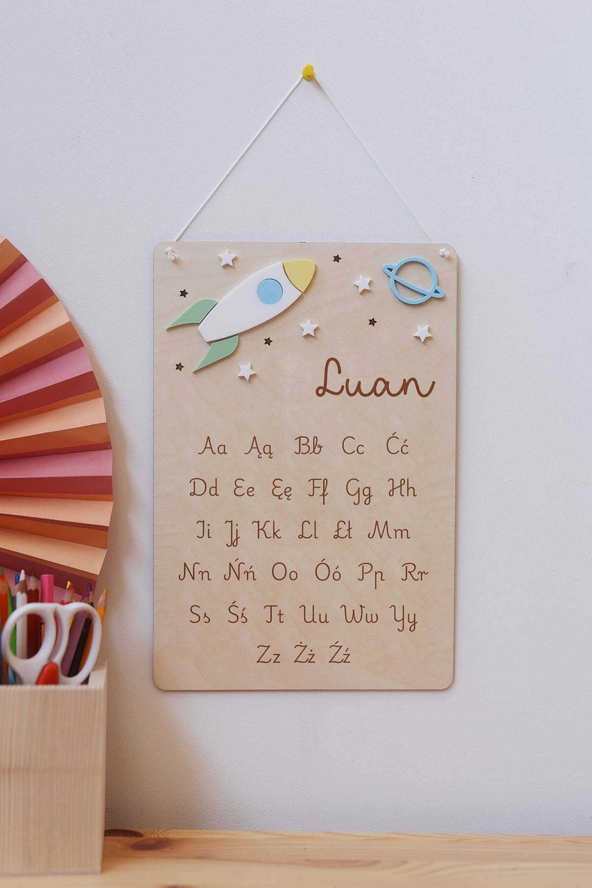 Drewniana tabliczka edukacyjna z alfabetem to idealna pomoc do nauki pisania i poznawania liter. Stanowi również niezwykłą dekorację pokoju dziecięcego. Tabliczkę możesz spersonalizować dowolnym słowem/imieniem.