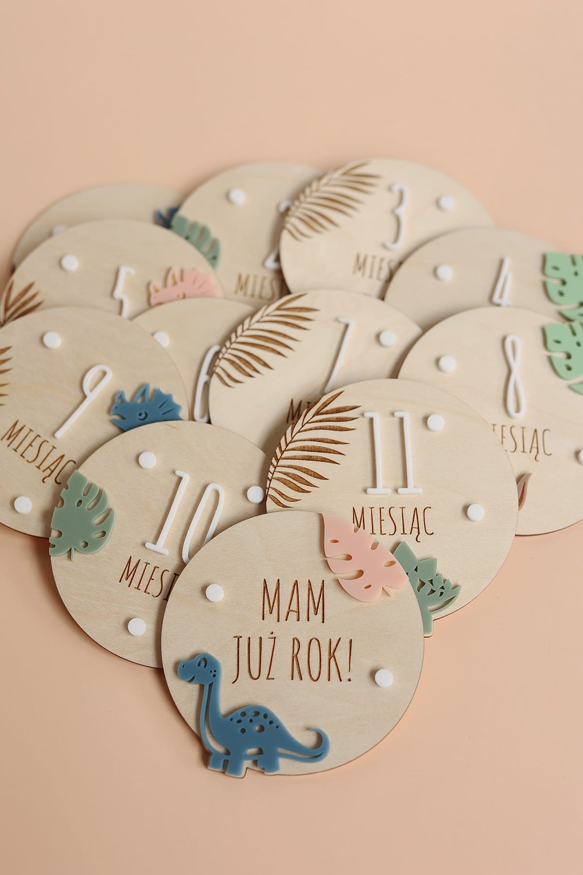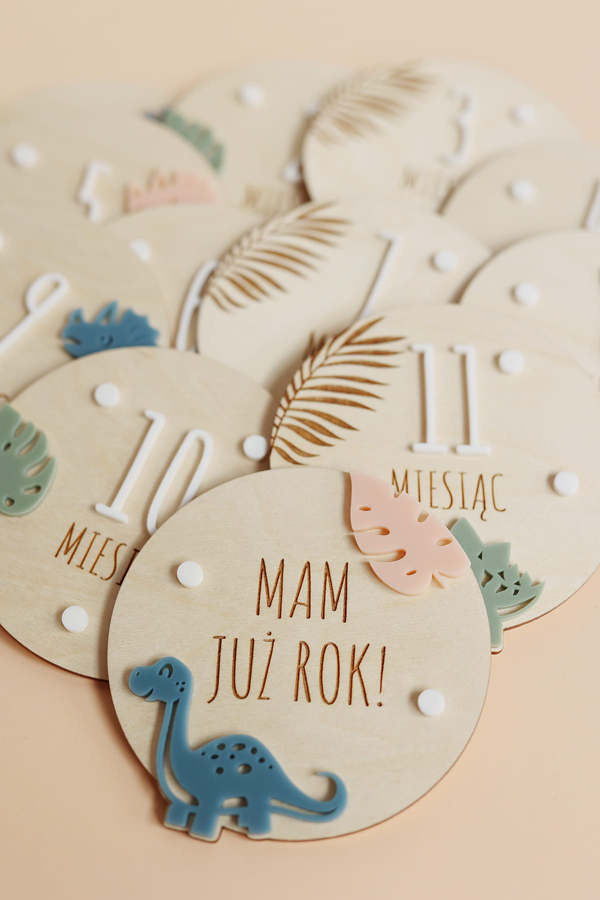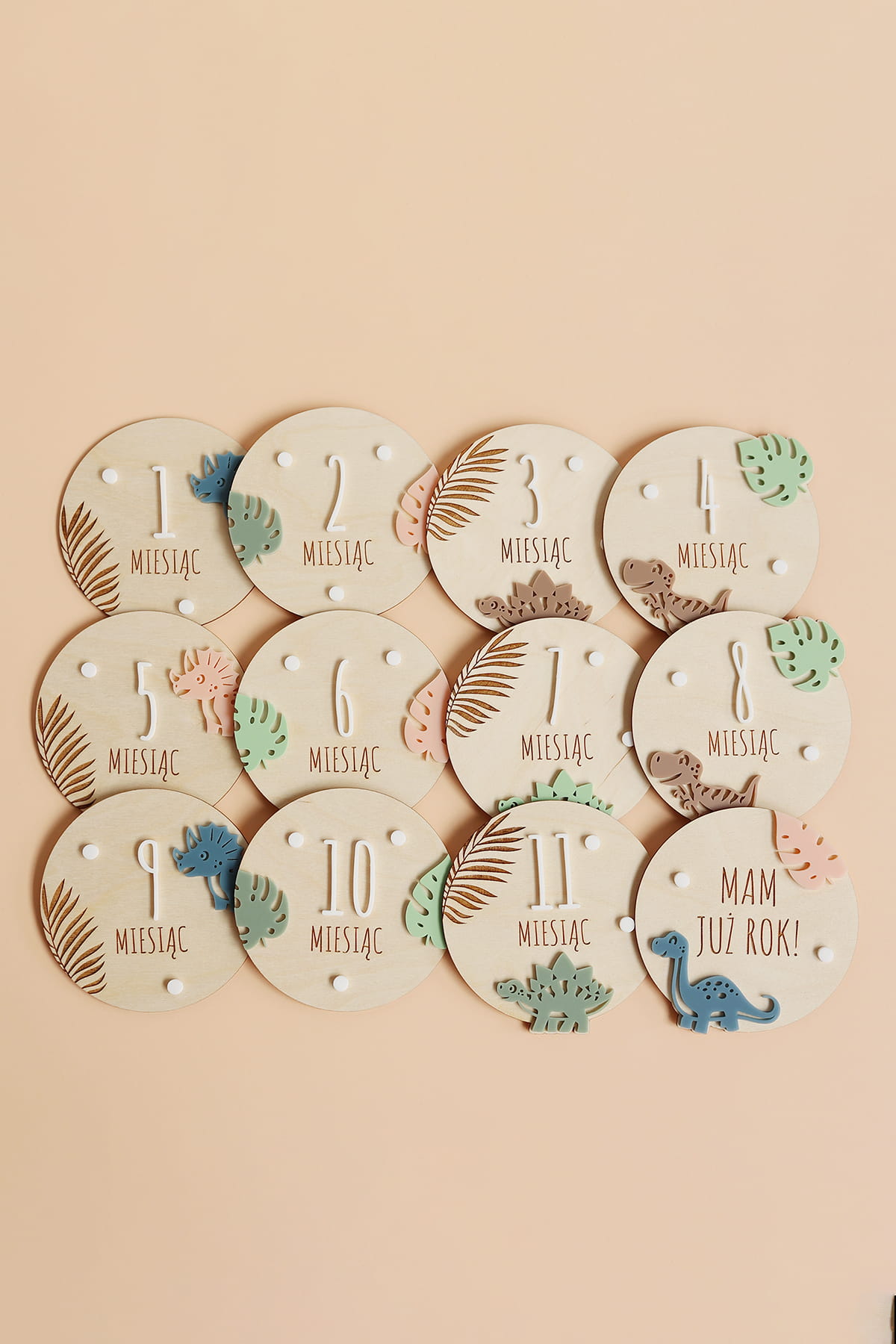 Uchwyć wyjątkowe chwile pierwszego roku życia Twojego maluszka! Zestaw 12 drewnianych tabliczek, każda oznaczona innym miesiącem i ozdobiona motywem dinozaurów, to idealny sposób na dokumentowanie comiesięcznych zmian. Perfekcyjny prezent dla świeżo upieczonych rodziców lub dekoracja do rodzinnego albumu!