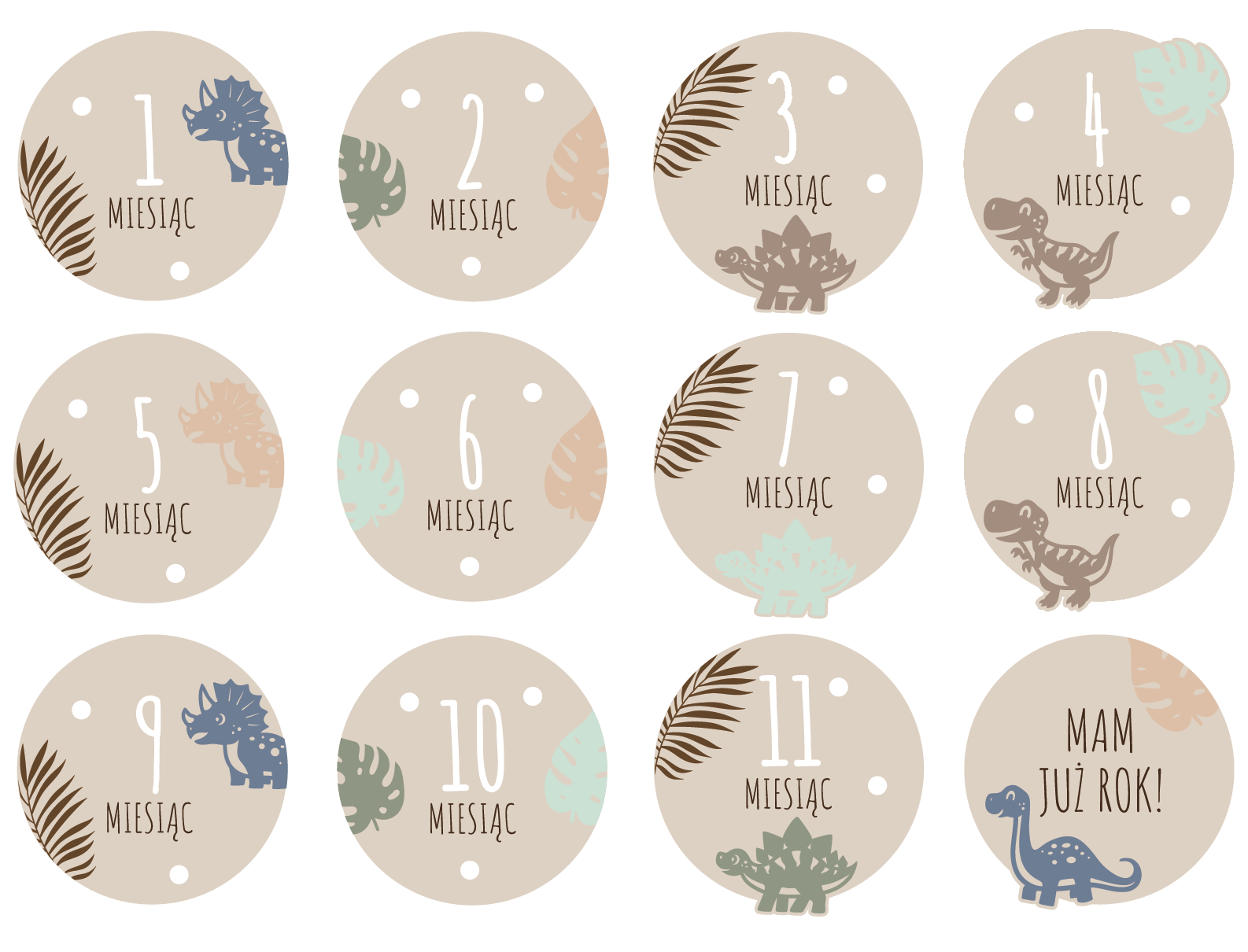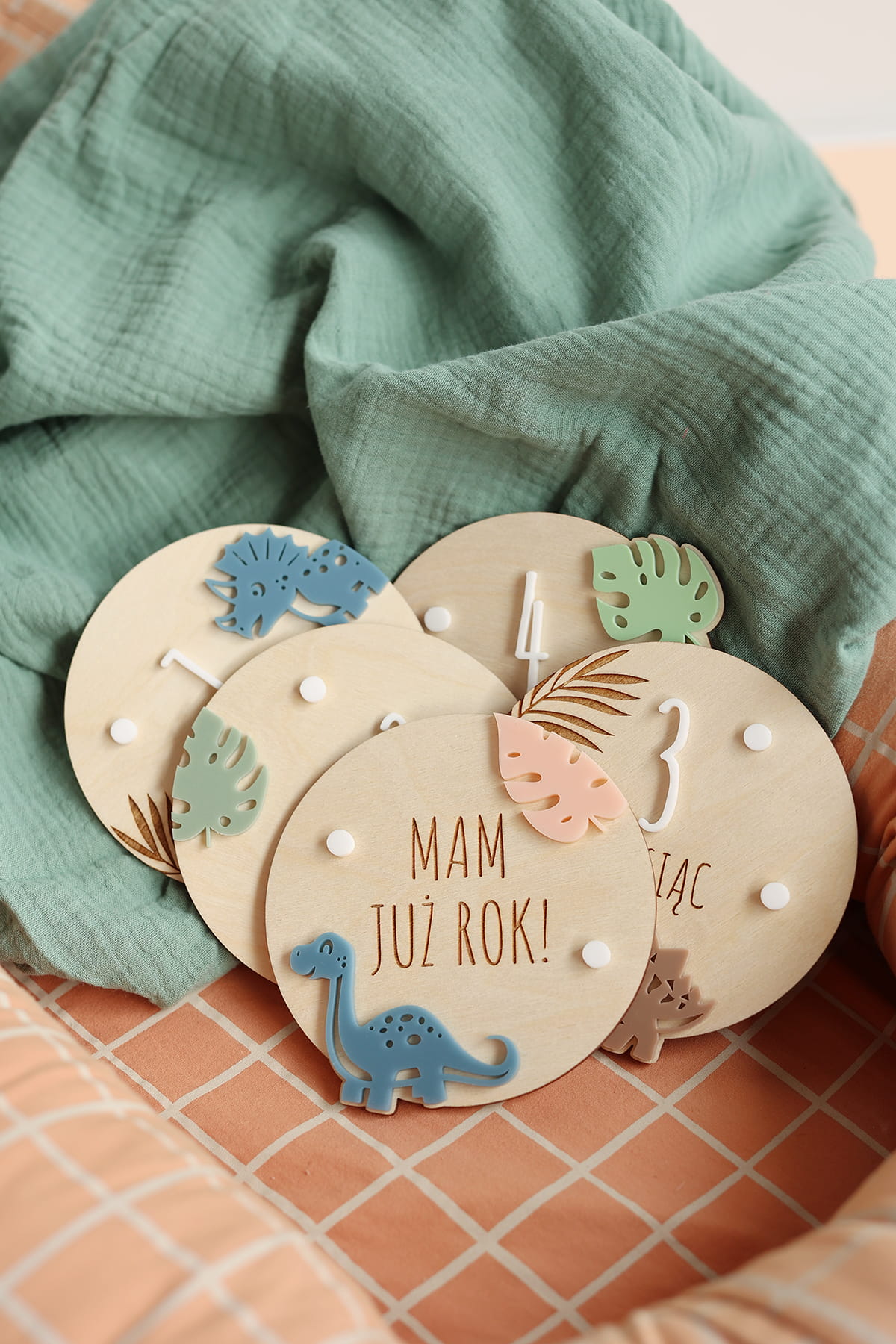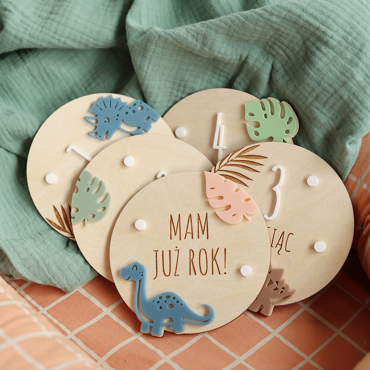 Uchwyć wyjątkowe chwile pierwszego roku życia Twojego maluszka! Zestaw 12 drewnianych tabliczek, każda oznaczona innym miesiącem i ozdobiona motywem dinozaurów, to idealny sposób na dokumentowanie comiesięcznych zmian. Perfekcyjny prezent dla świeżo upieczonych rodziców lub dekoracja do rodzinnego albumu!