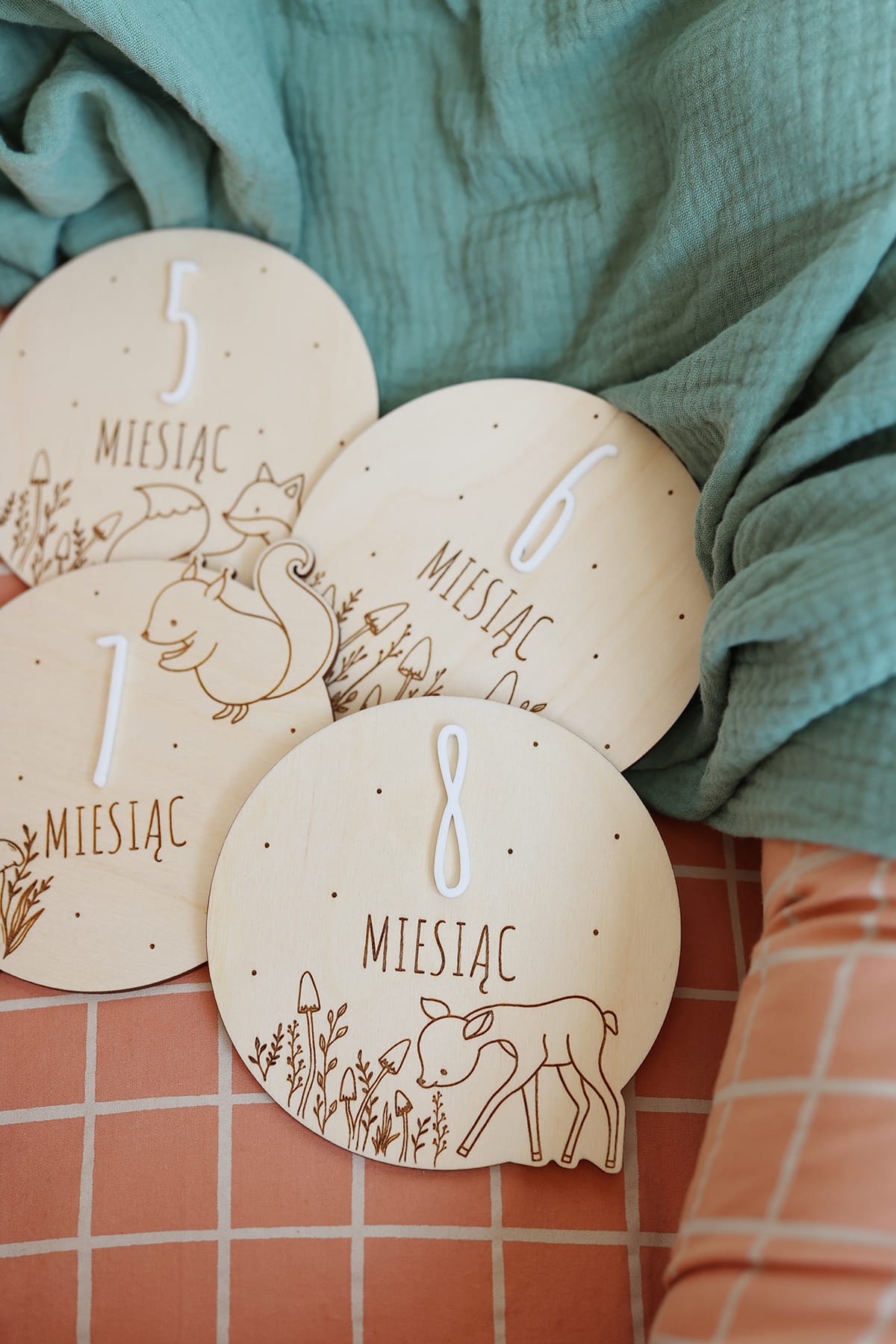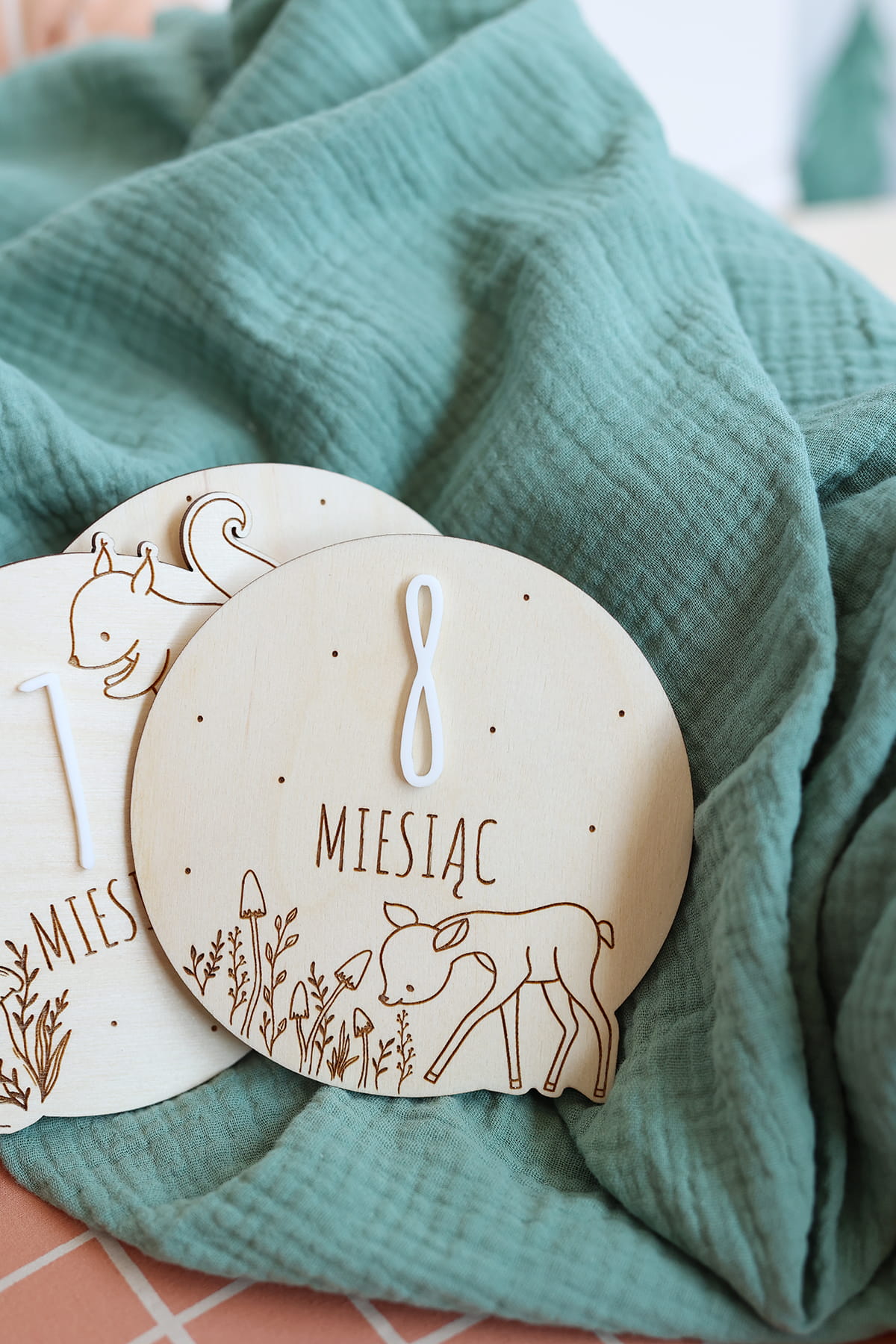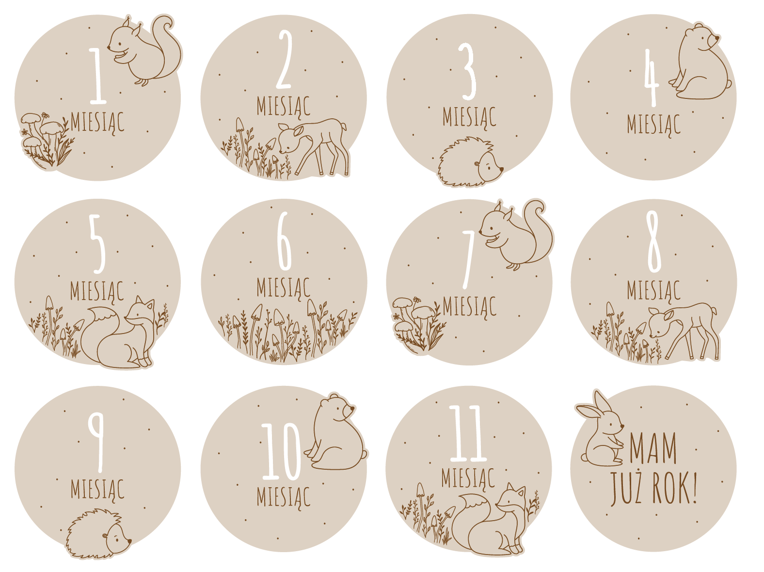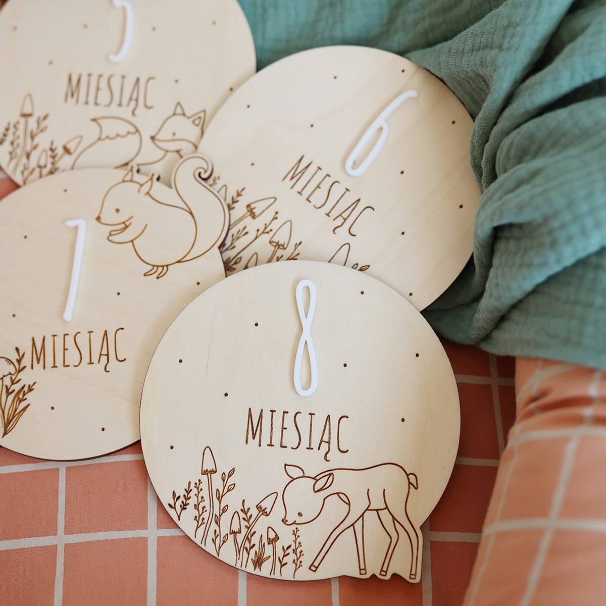 Uchwyć wyjątkowe chwile pierwszego roku życia Twojego maluszka! Zestaw 12 drewnianych tabliczek, każda oznaczona innym miesiącem i ozdobiona motywem lasu i leśnych zwierzątek, to idealny sposób na dokumentowanie comiesięcznych zmian. Perfekcyjny prezent dla świeżo upieczonych rodziców lub dekoracja do rodzinnego albumu!