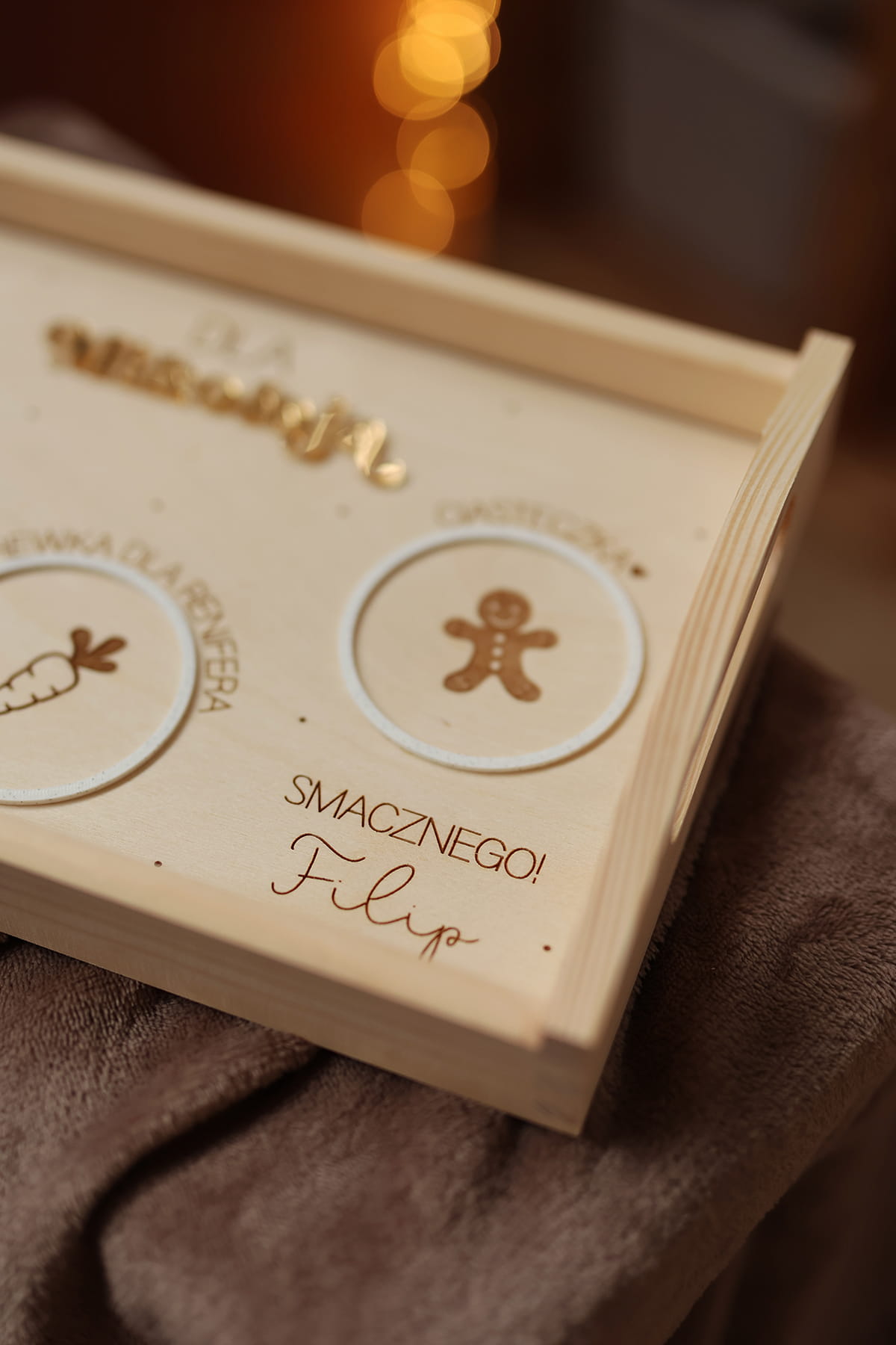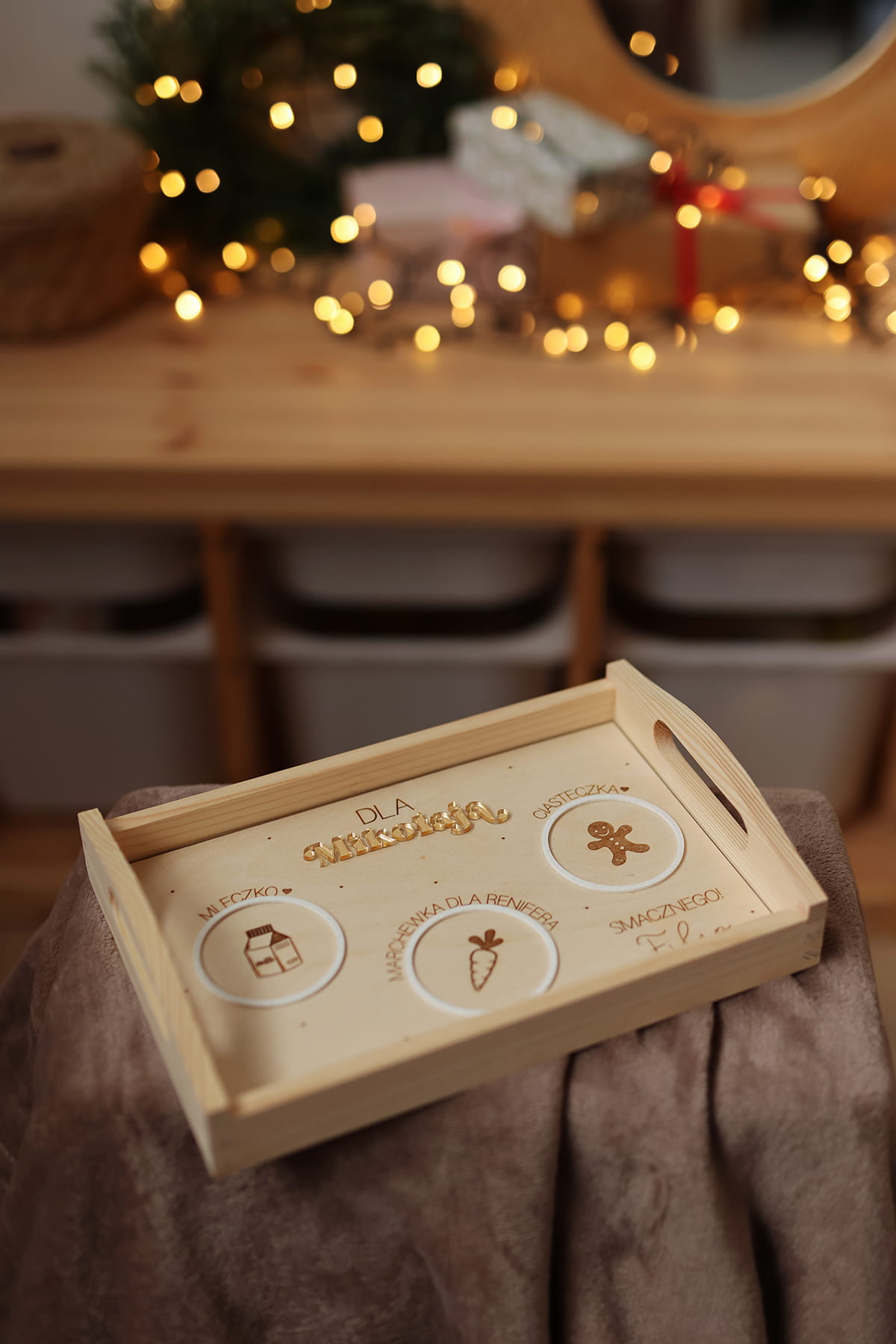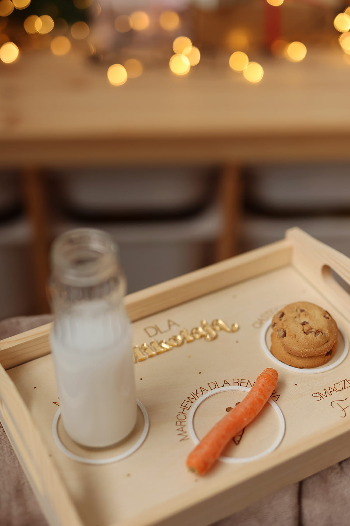 Niezwykła, drewniana tacka, która doda magii oczekiwaniu na przyjście świętego Mikołaja. Na tacy znajduje się miejsce na szklankę mleka, ciasteczka oraz marchewkę dla renifera.