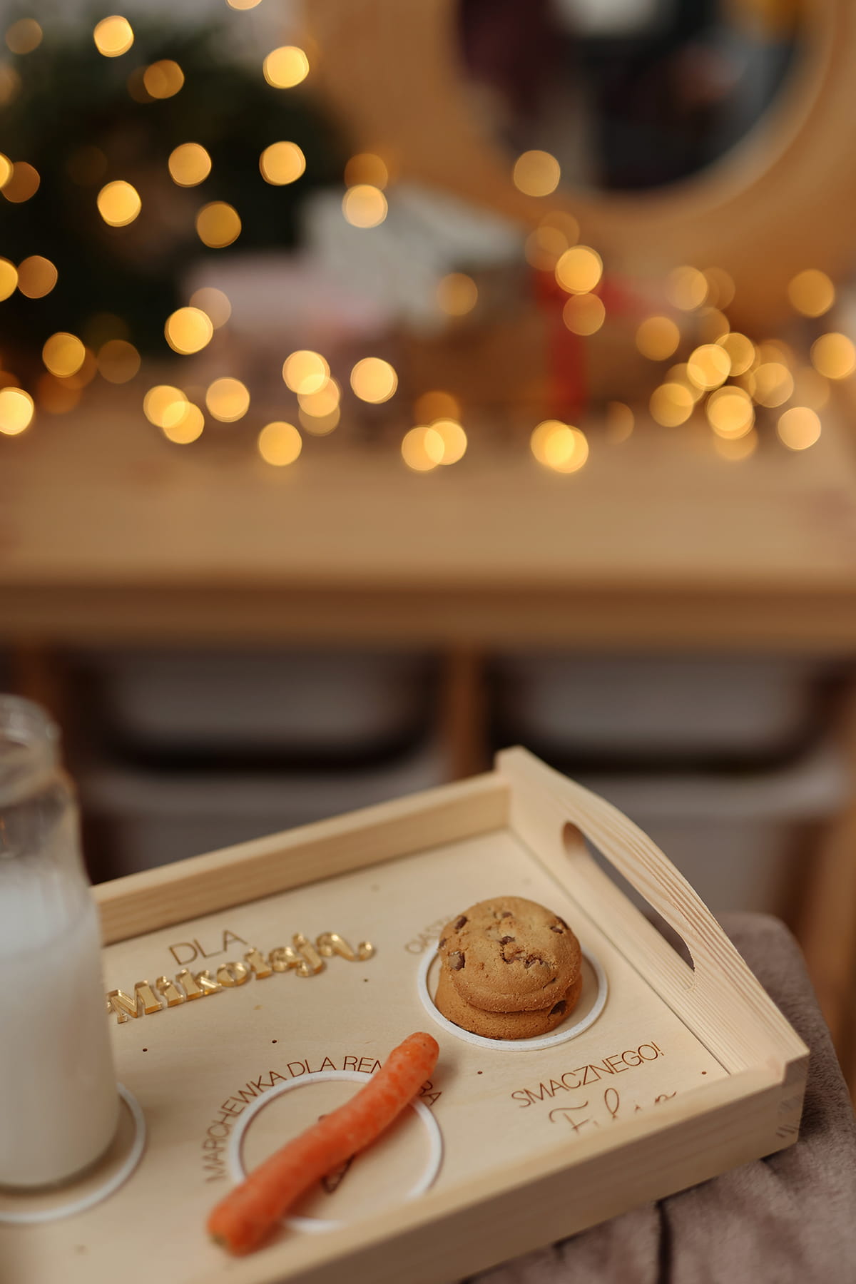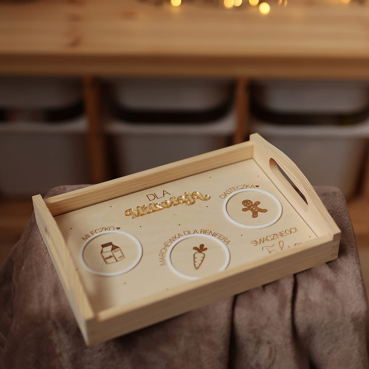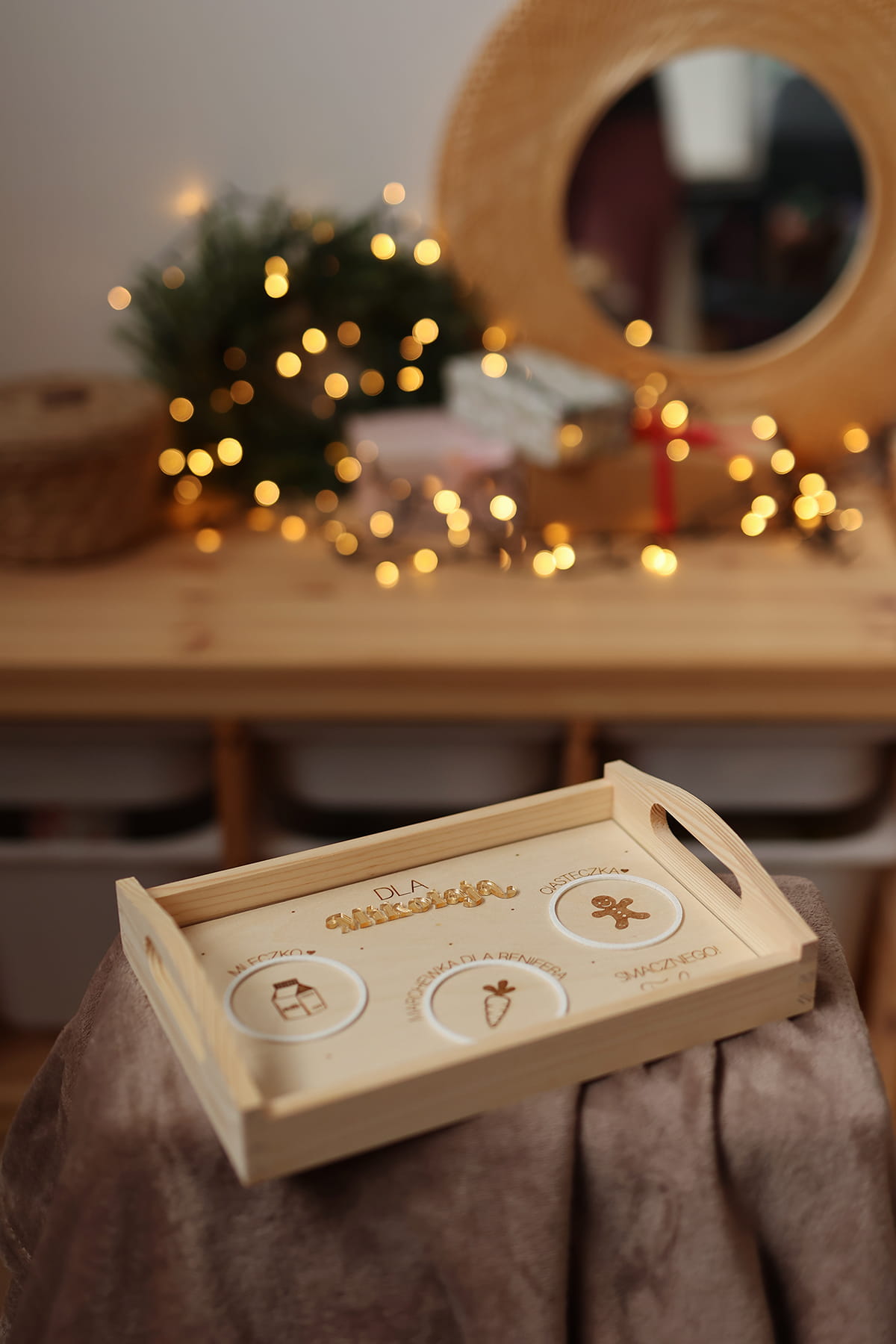 Niezwykła, drewniana tacka, która doda magii oczekiwaniu na przyjście świętego Mikołaja. Na tacy znajduje się miejsce na szklankę mleka, ciasteczka oraz marchewkę dla renifera.