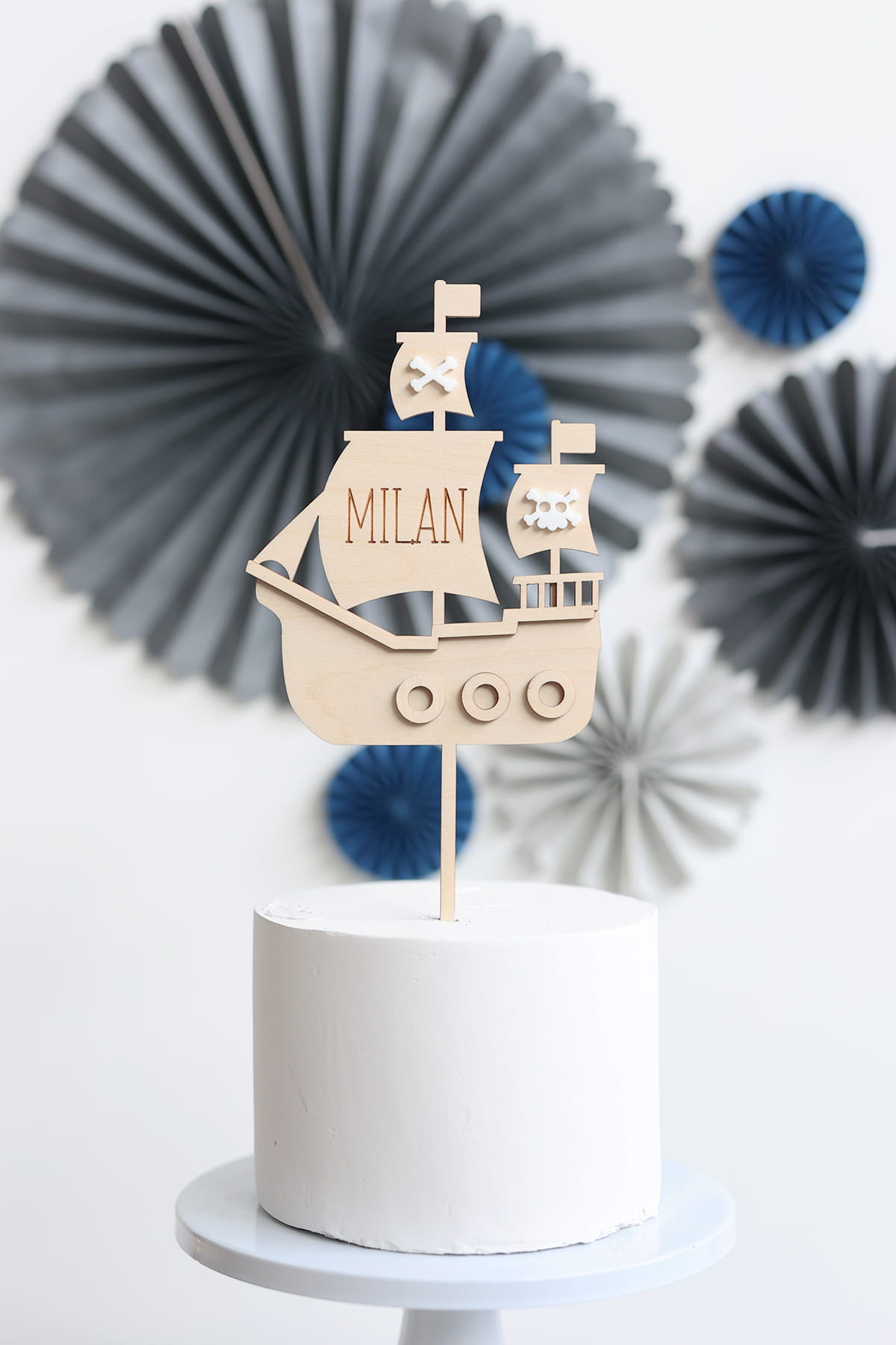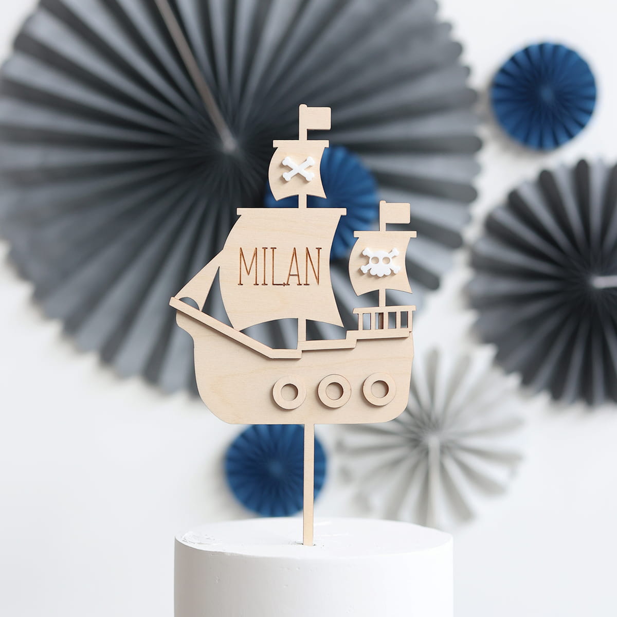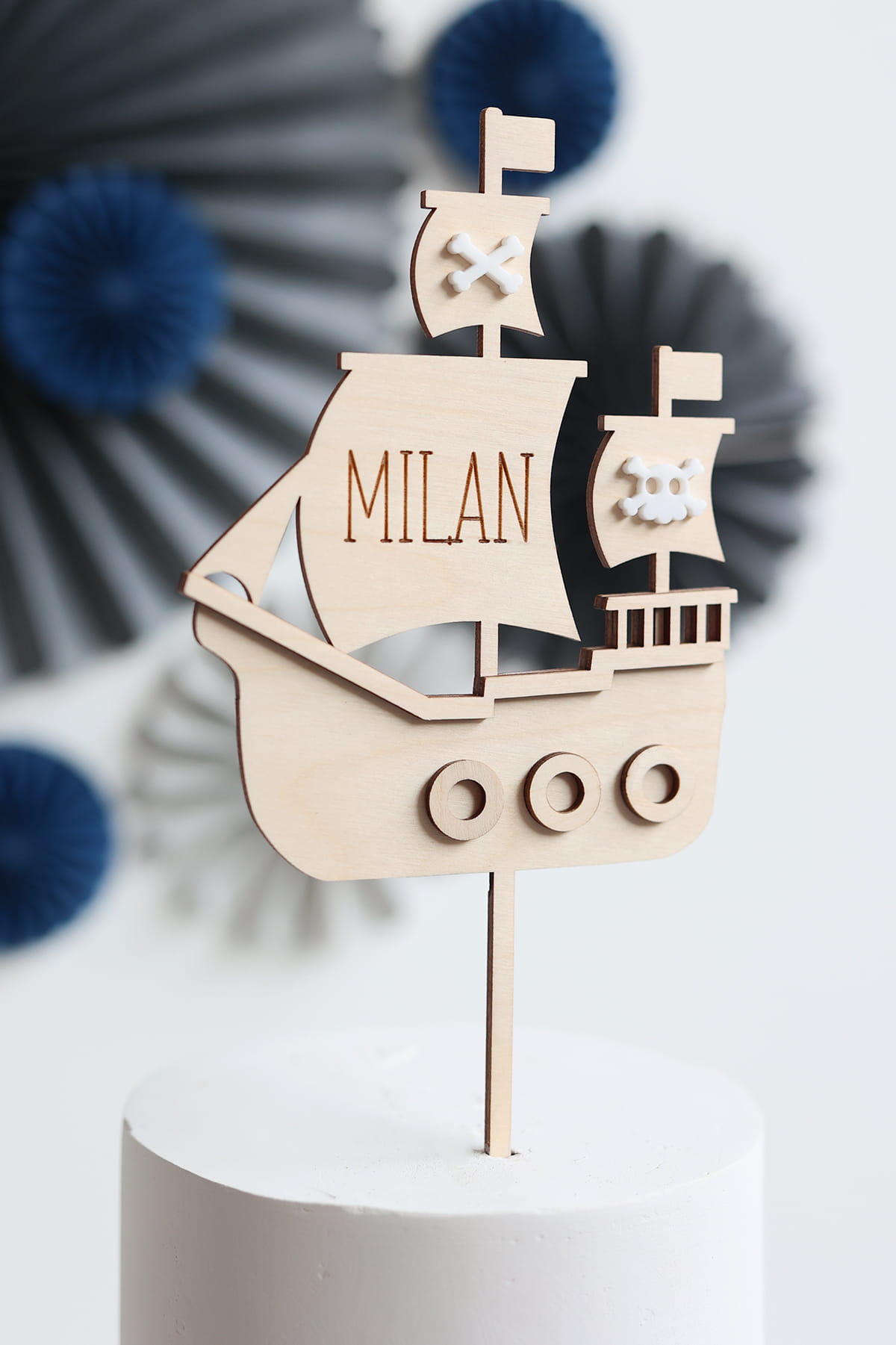 Drewniany, warstwowy topper na tort z motywem pirackiego statku i grawerowanym imieniem.