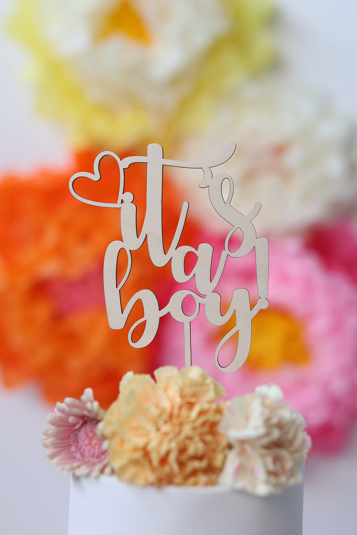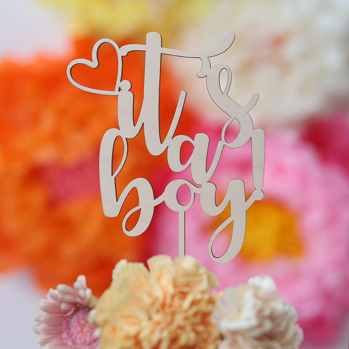 Klasyczny, drewniany topper na tort z napisem "It's a boy!".