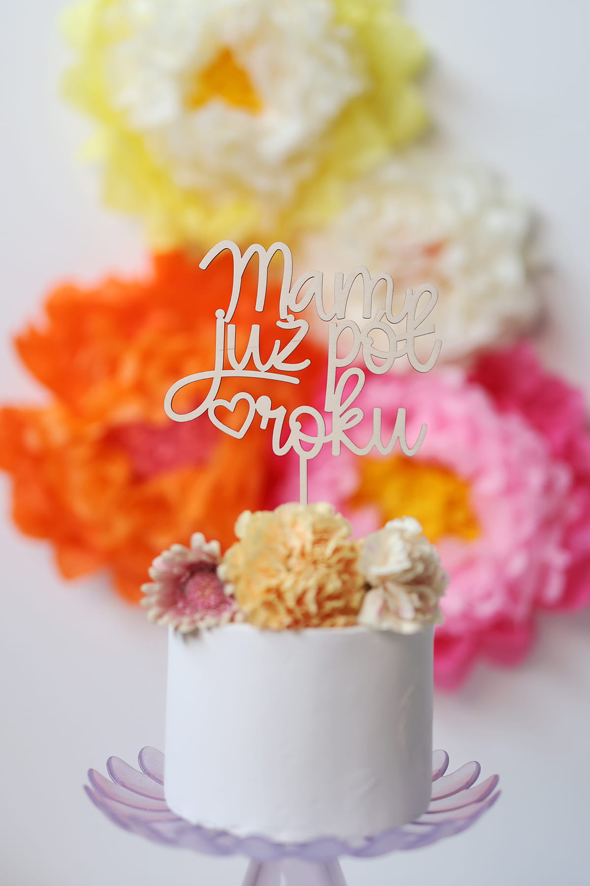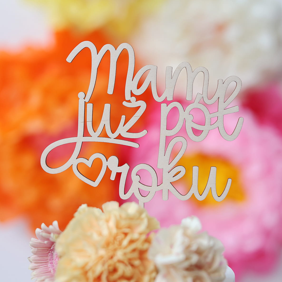 Klasyczny, drewniany topper na tort z napisem "Mam już pół roku".