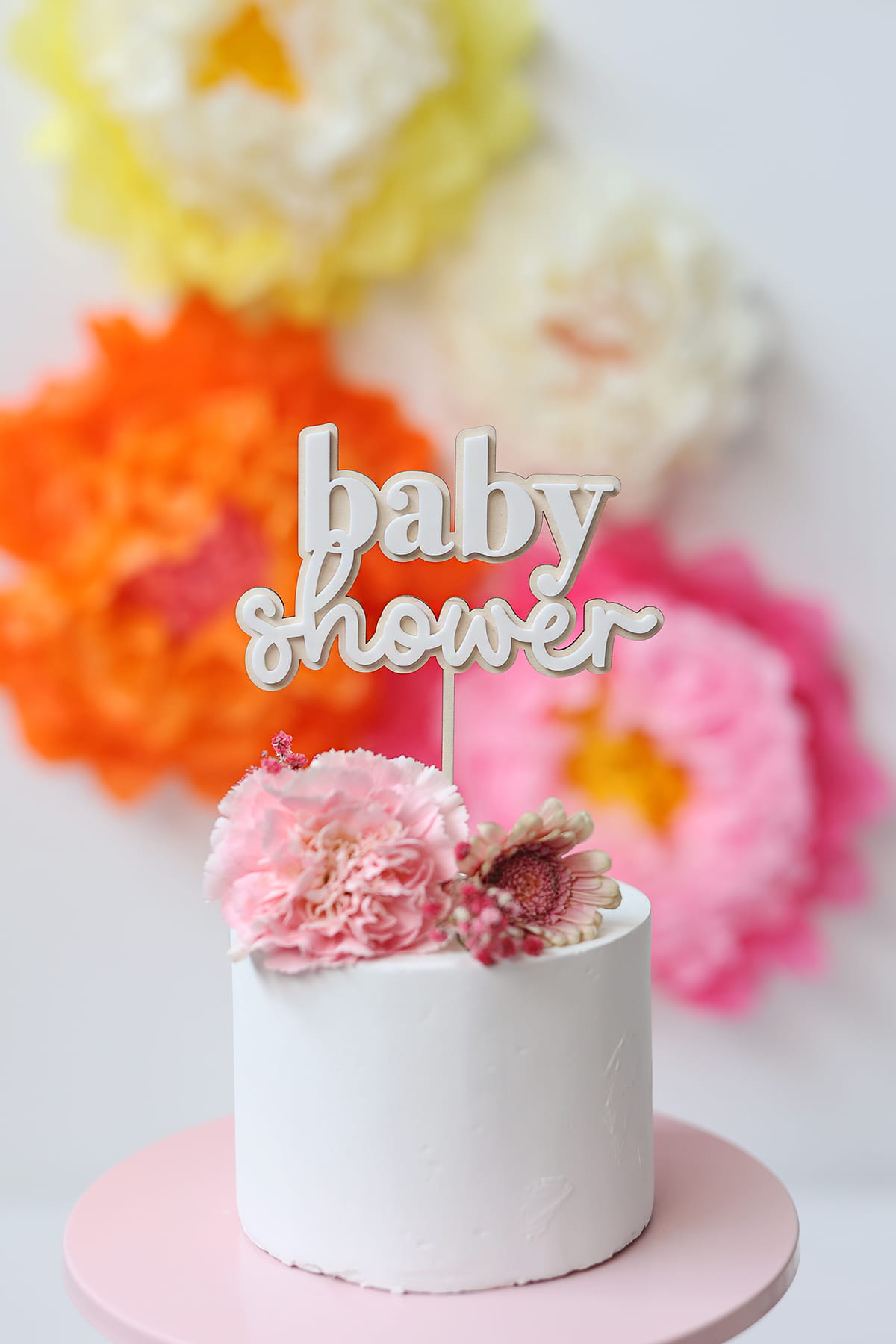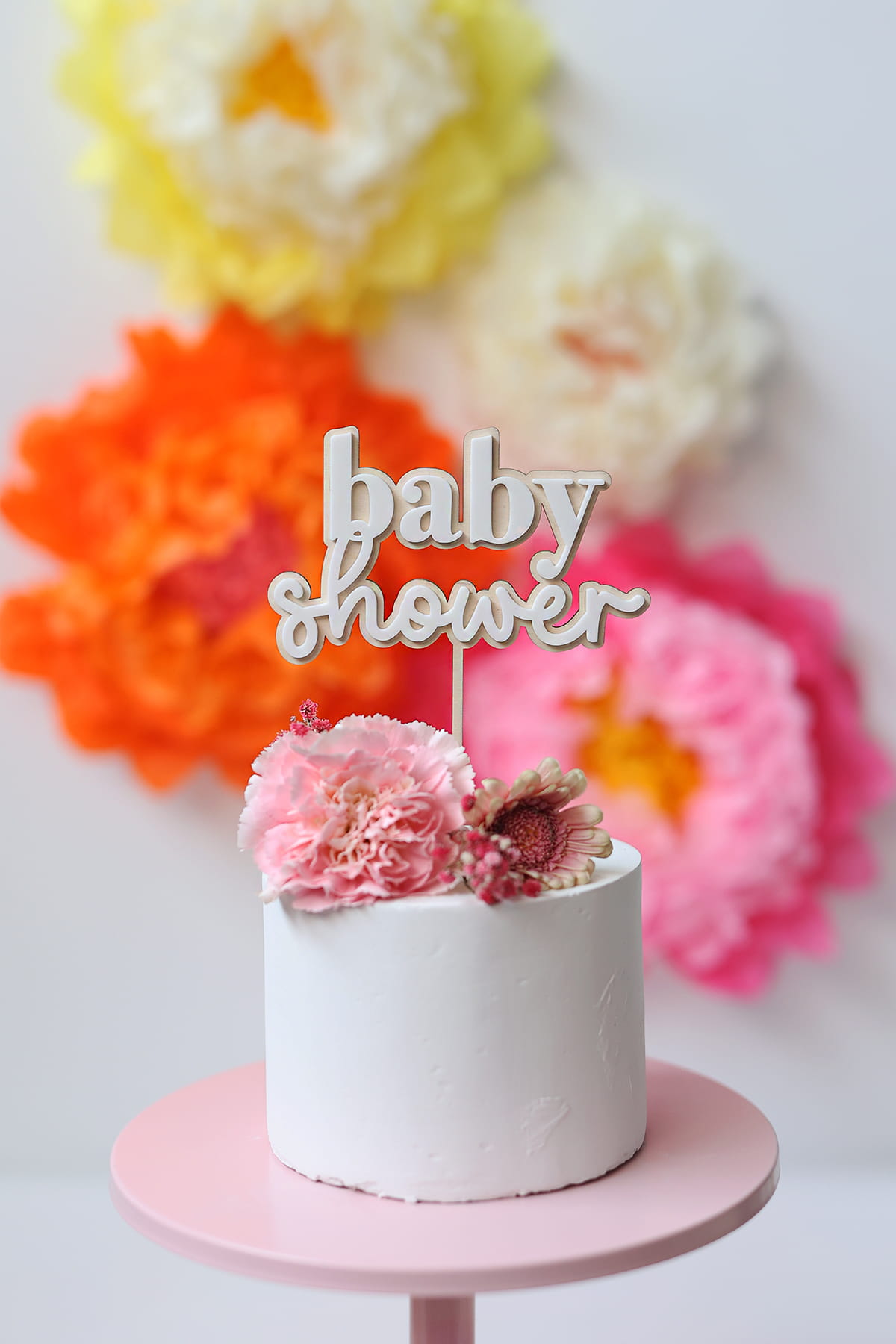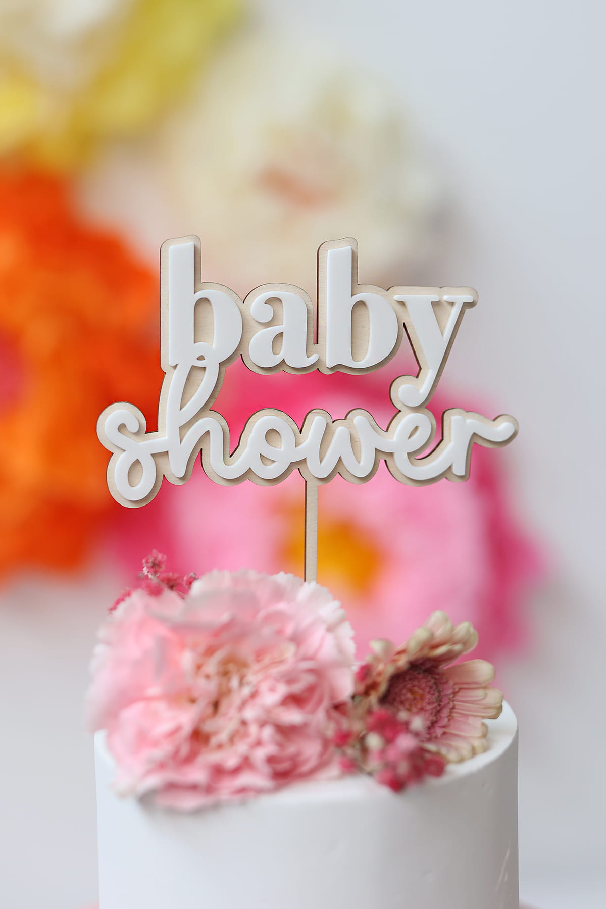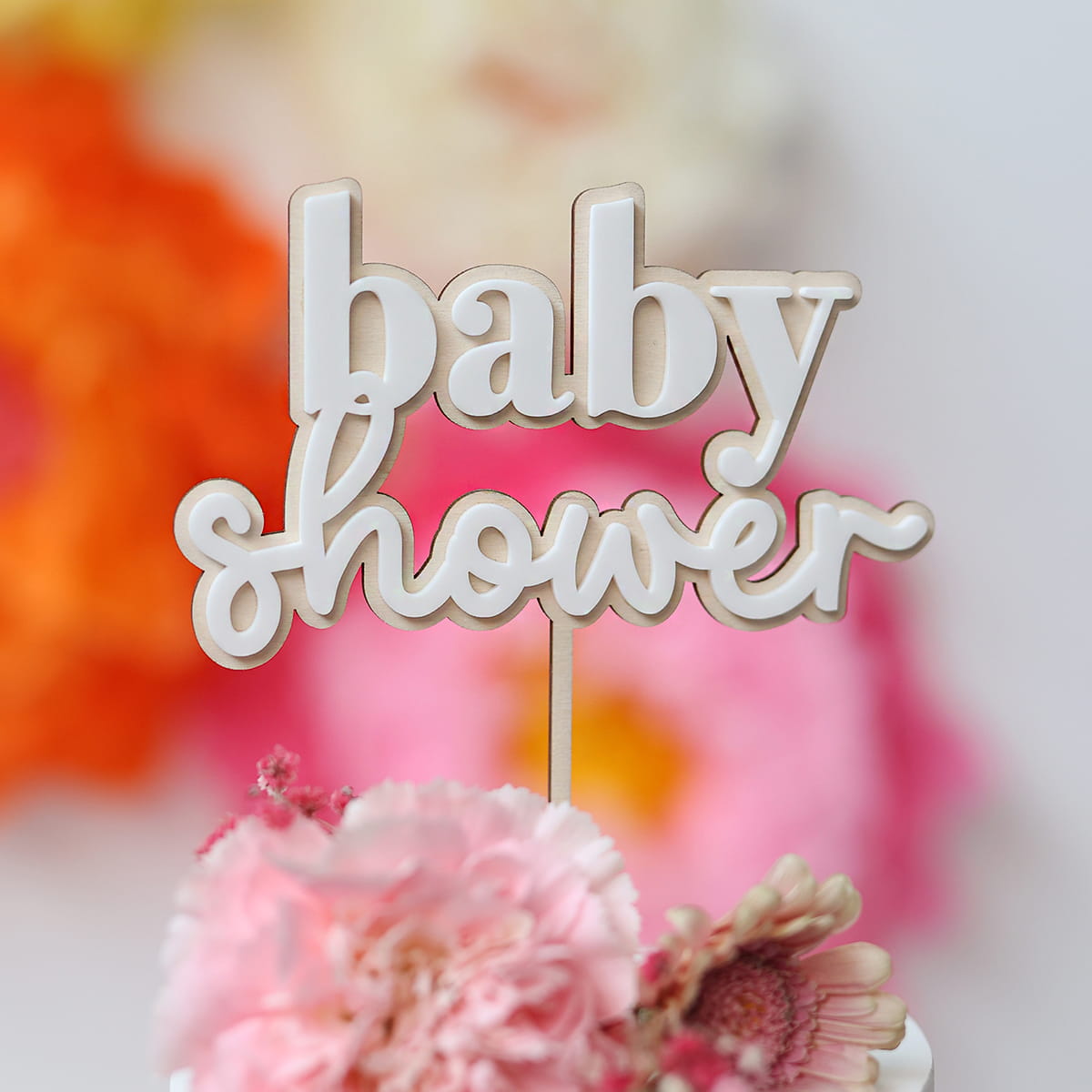 Topper z napisem "baby shower" składający się z drewnianej bazy i białego napisu.