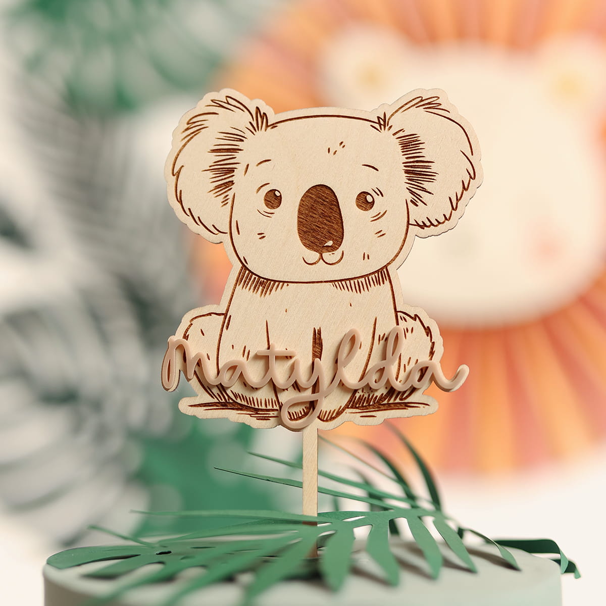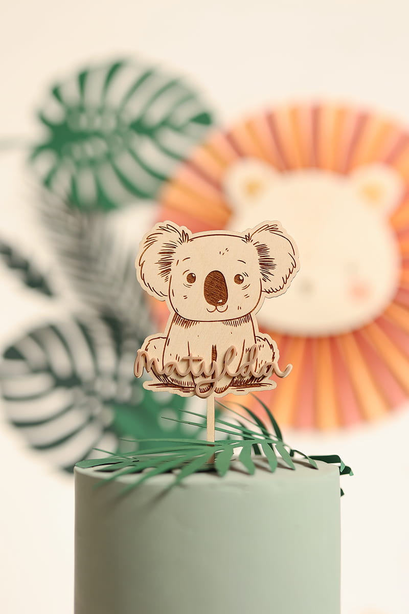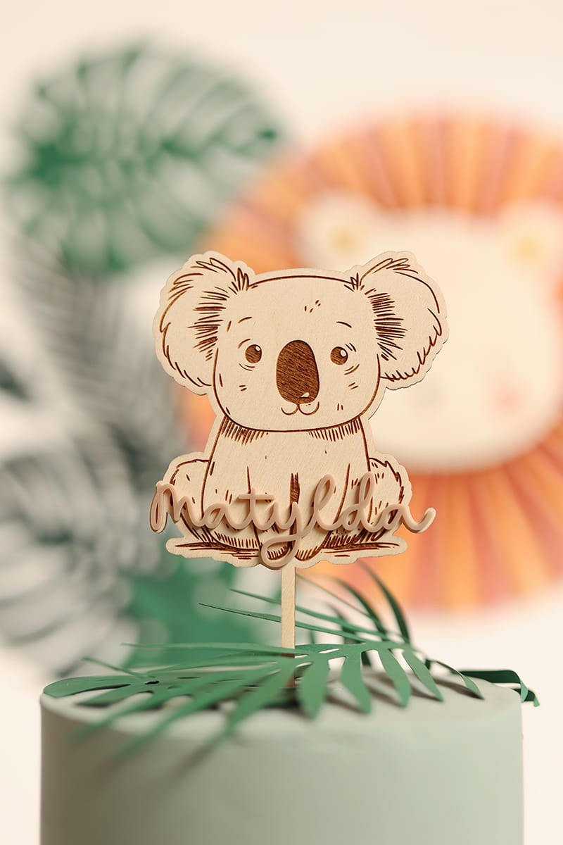 Drewniany, grawerowany topper z motywem koali, personalizowany naklejanym imieniem w kolorze kokosowym.