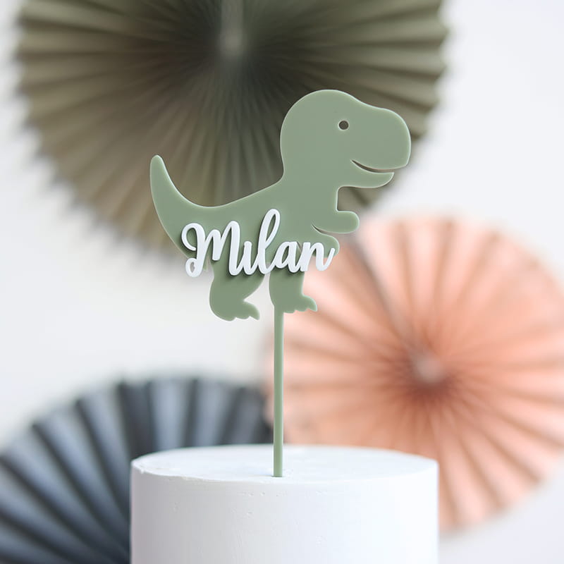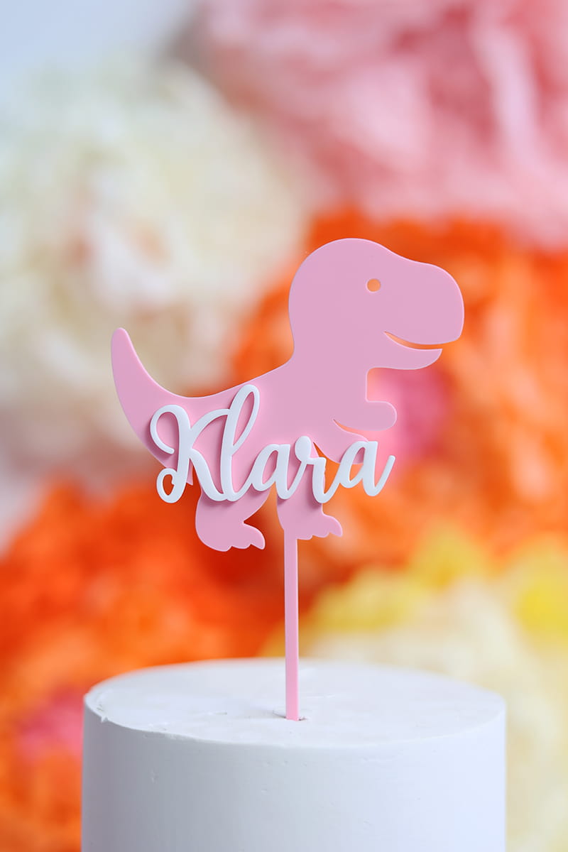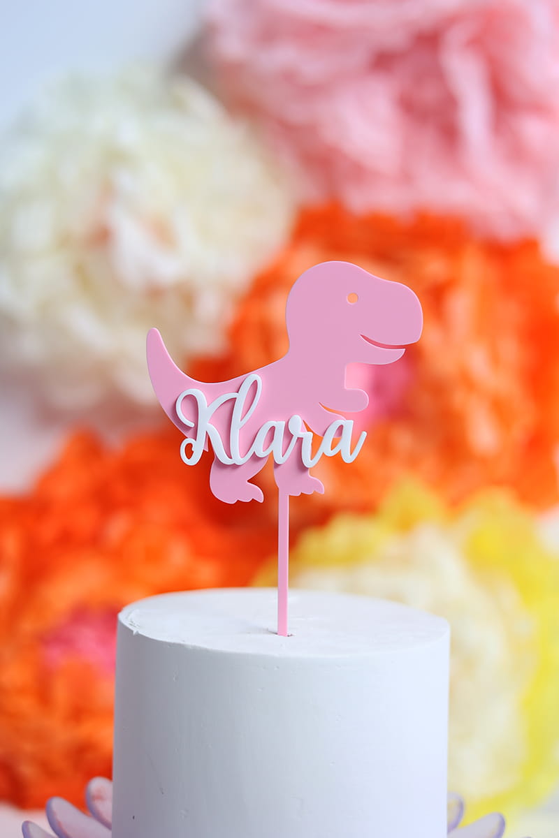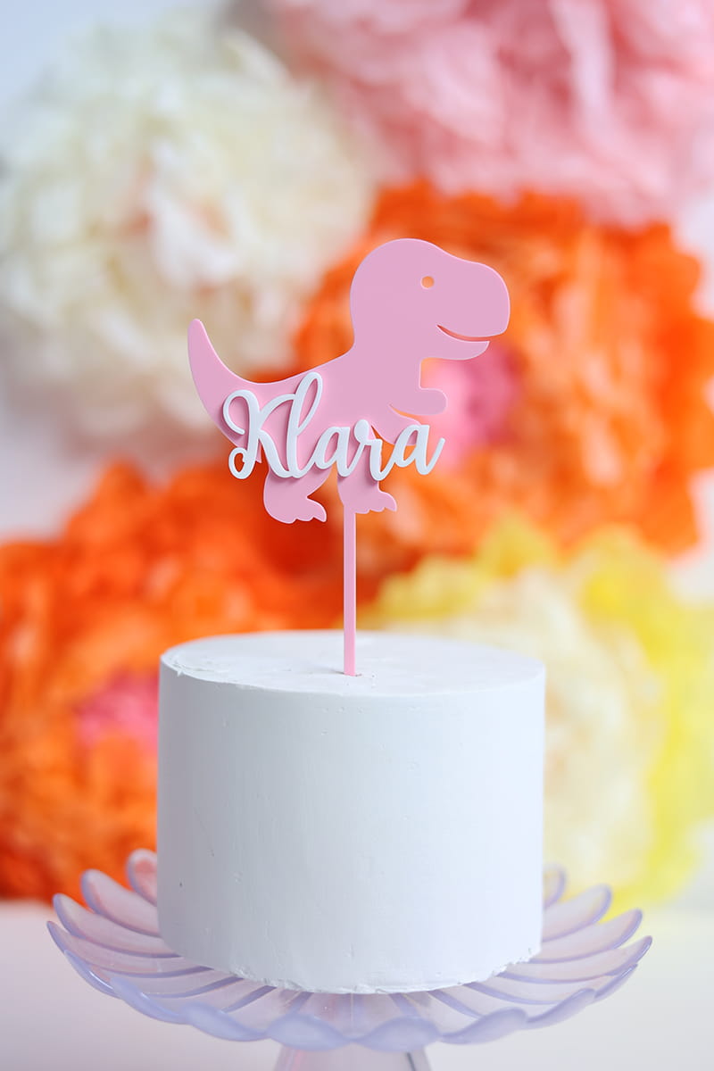 Uroczy topper w kształcie dinozaura z dowolnym imieniem w białym kolorze.