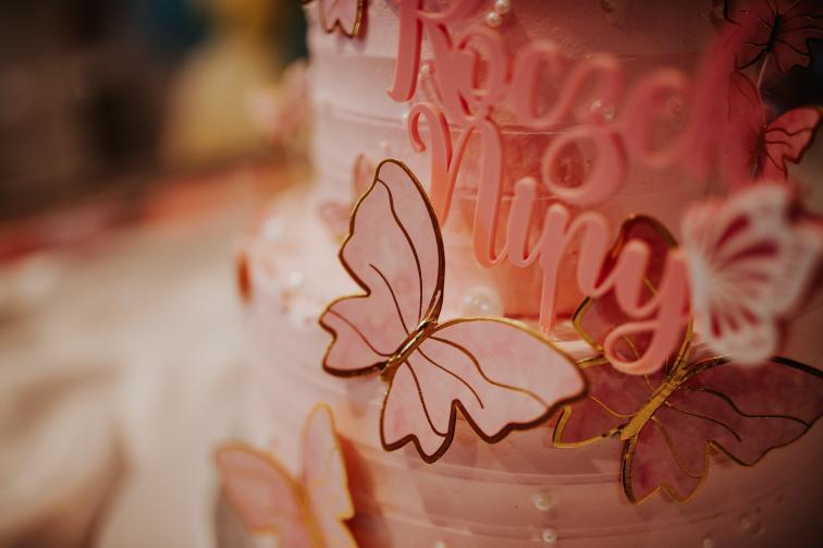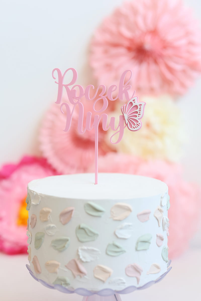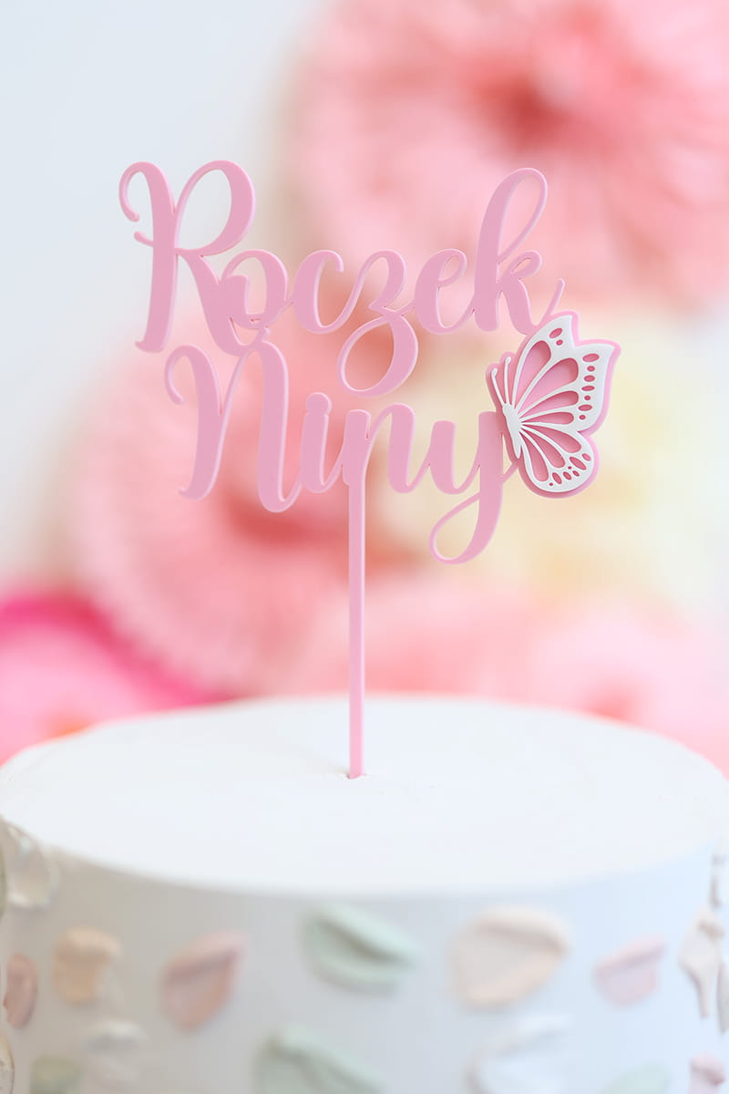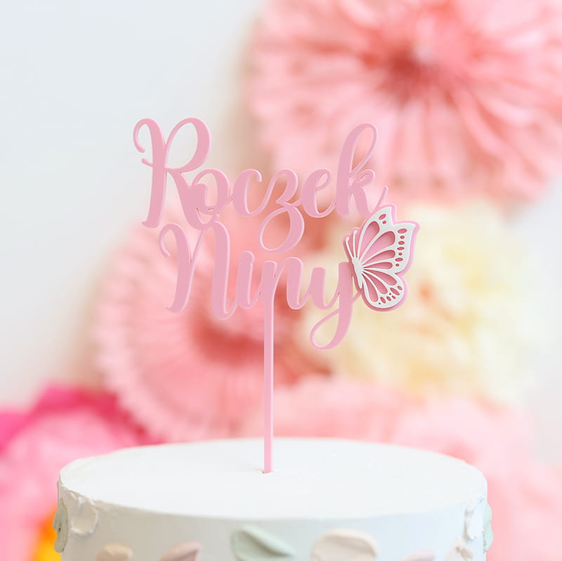 Personalizowany topper na roczek z dowolnym imieniem, ozdobiony uroczym motylkiem. Na topperze można umieścić dowolne jedno imię. Jego stałą częścią jest słowo "Roczek".