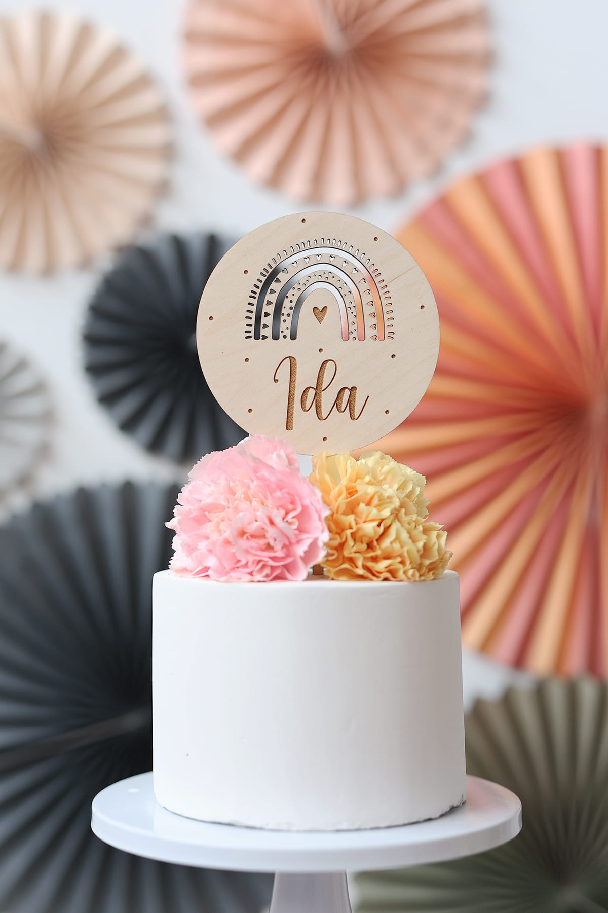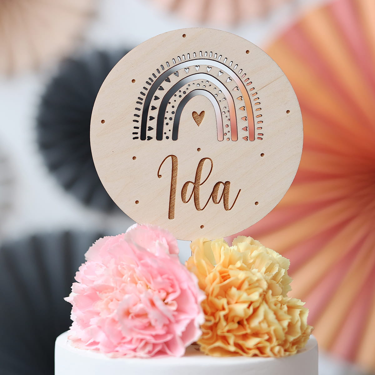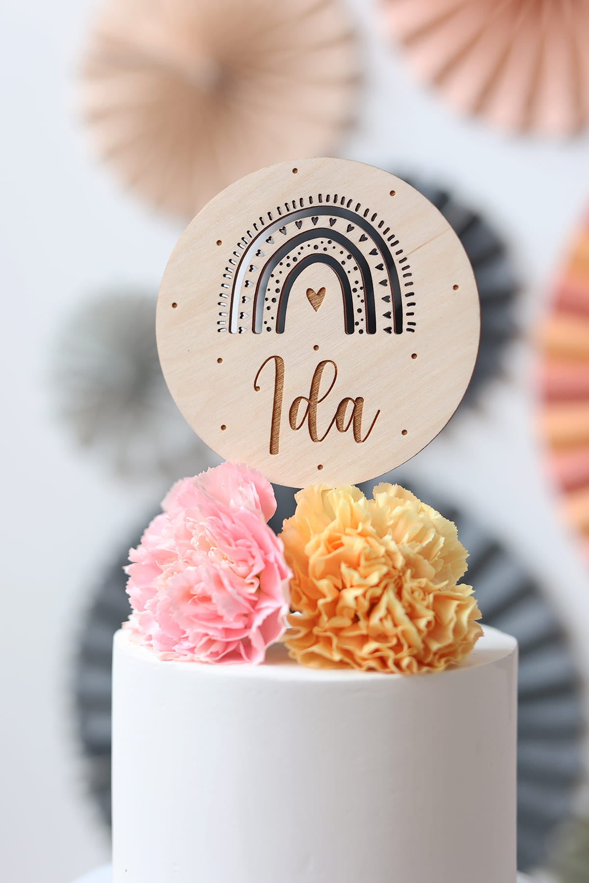 Okrągły topper z motywem tęczy i dowolnym napisem.
