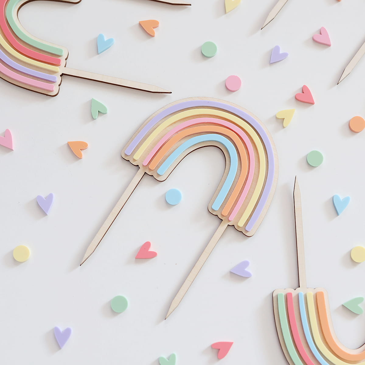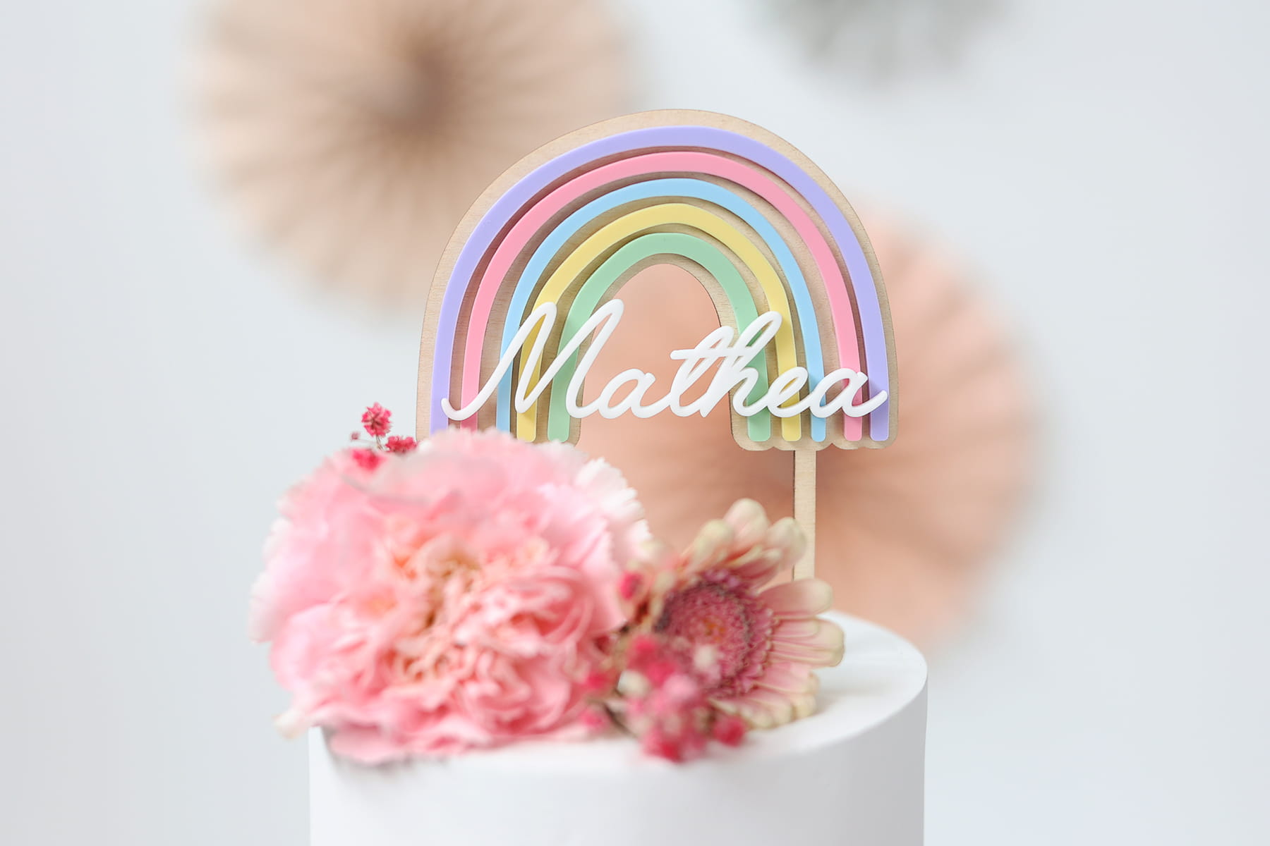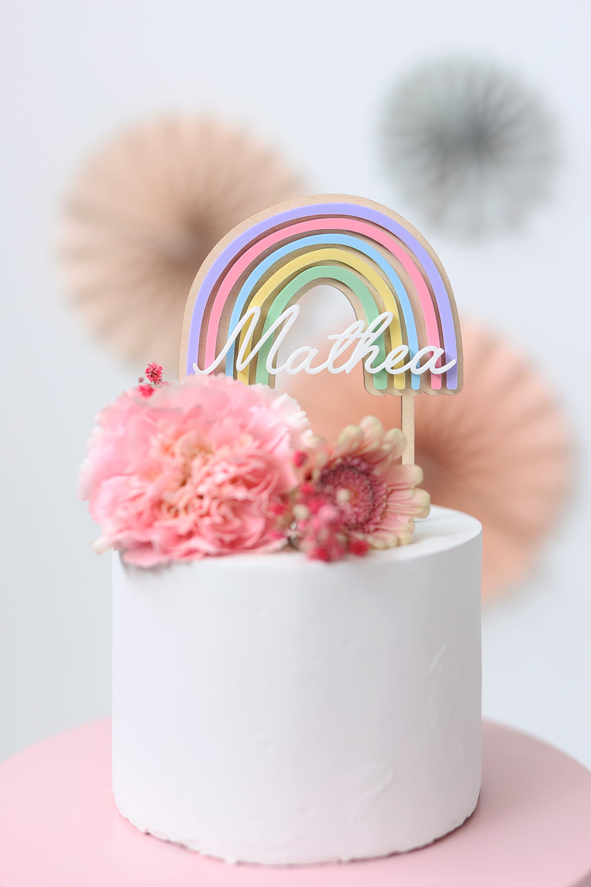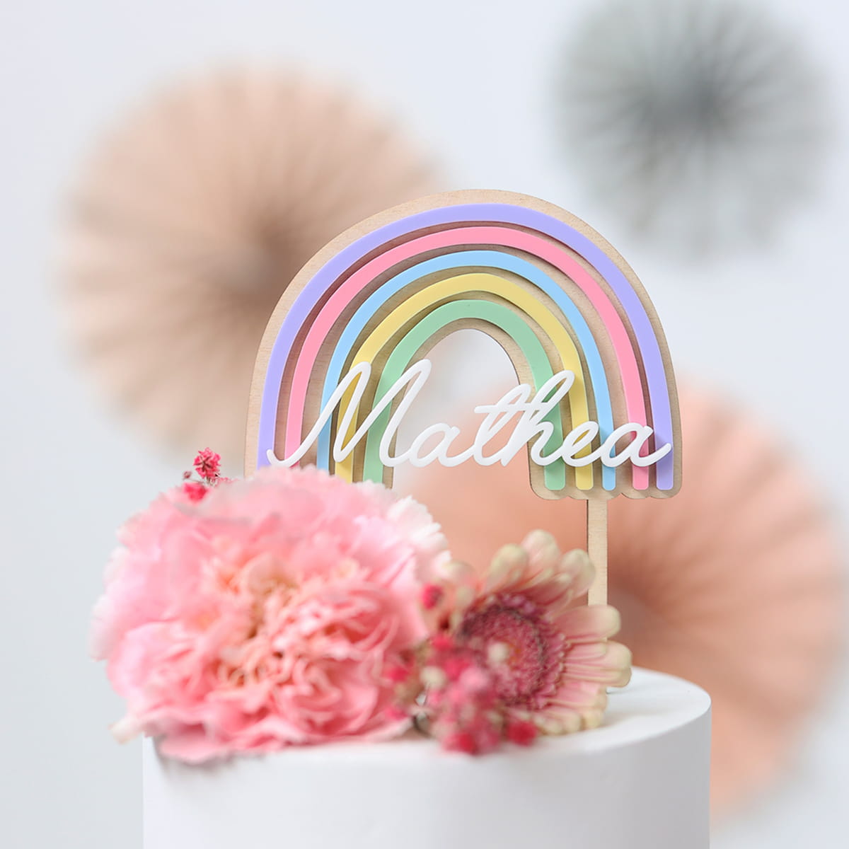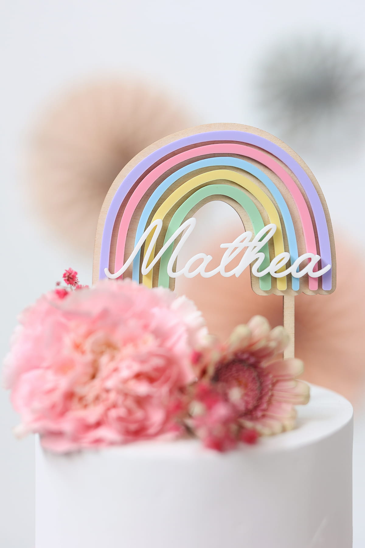 Topper w kształcie tęczy z drewnianą bazą, pastelowymi łukami i białym imieniem.