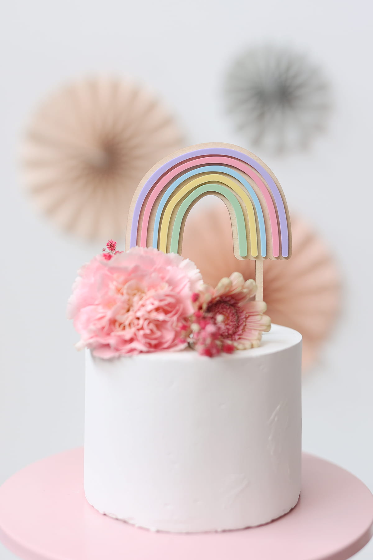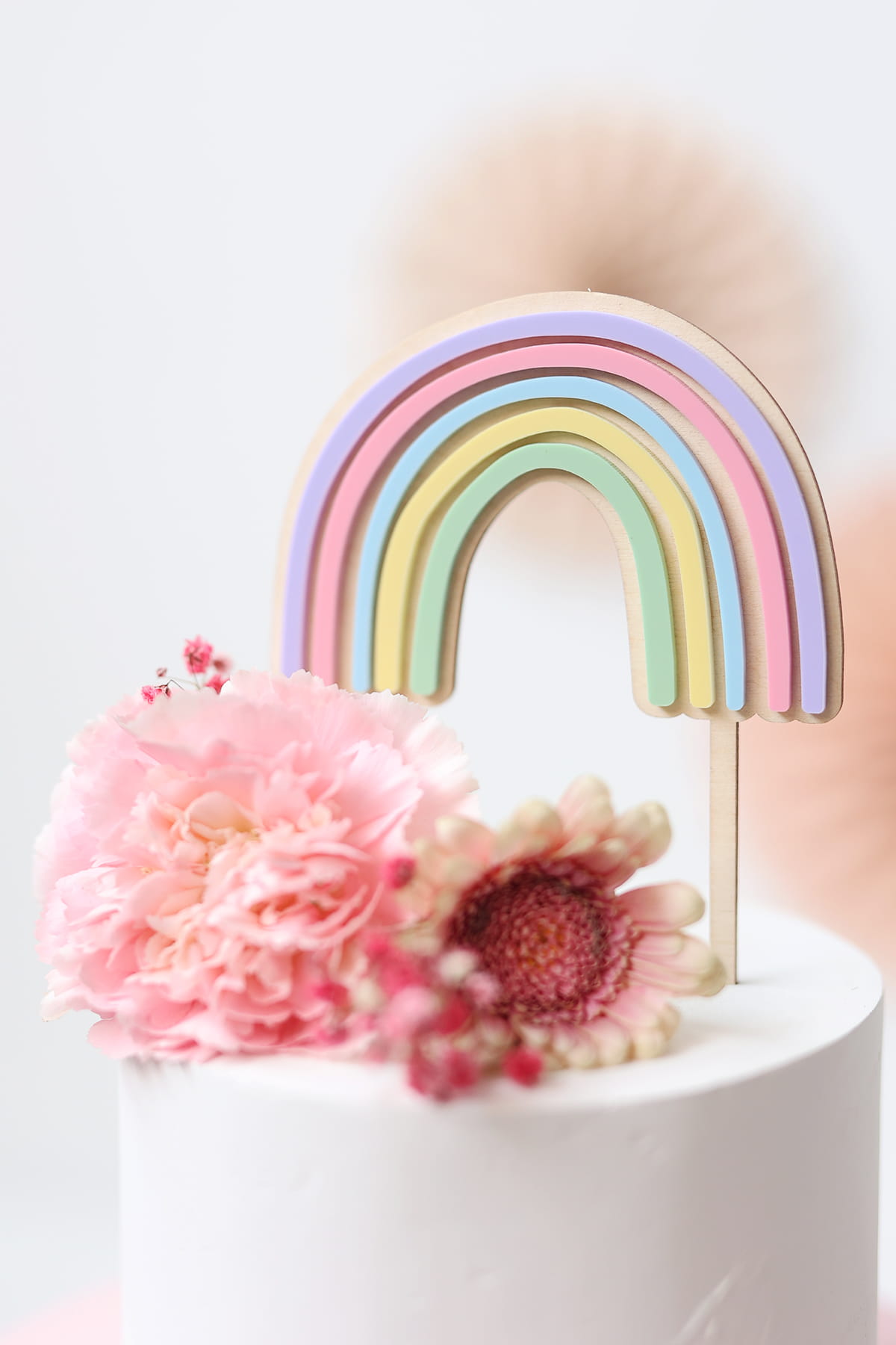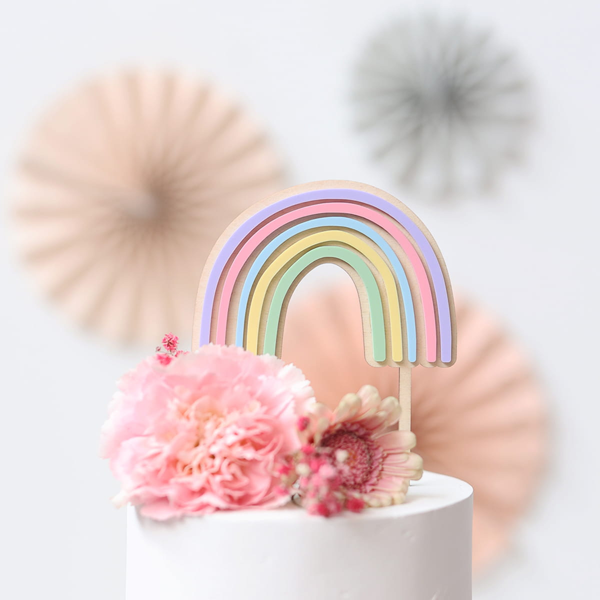 Topper w kształcie tęczy z drewnianą bazą i pastelowymi łukami.