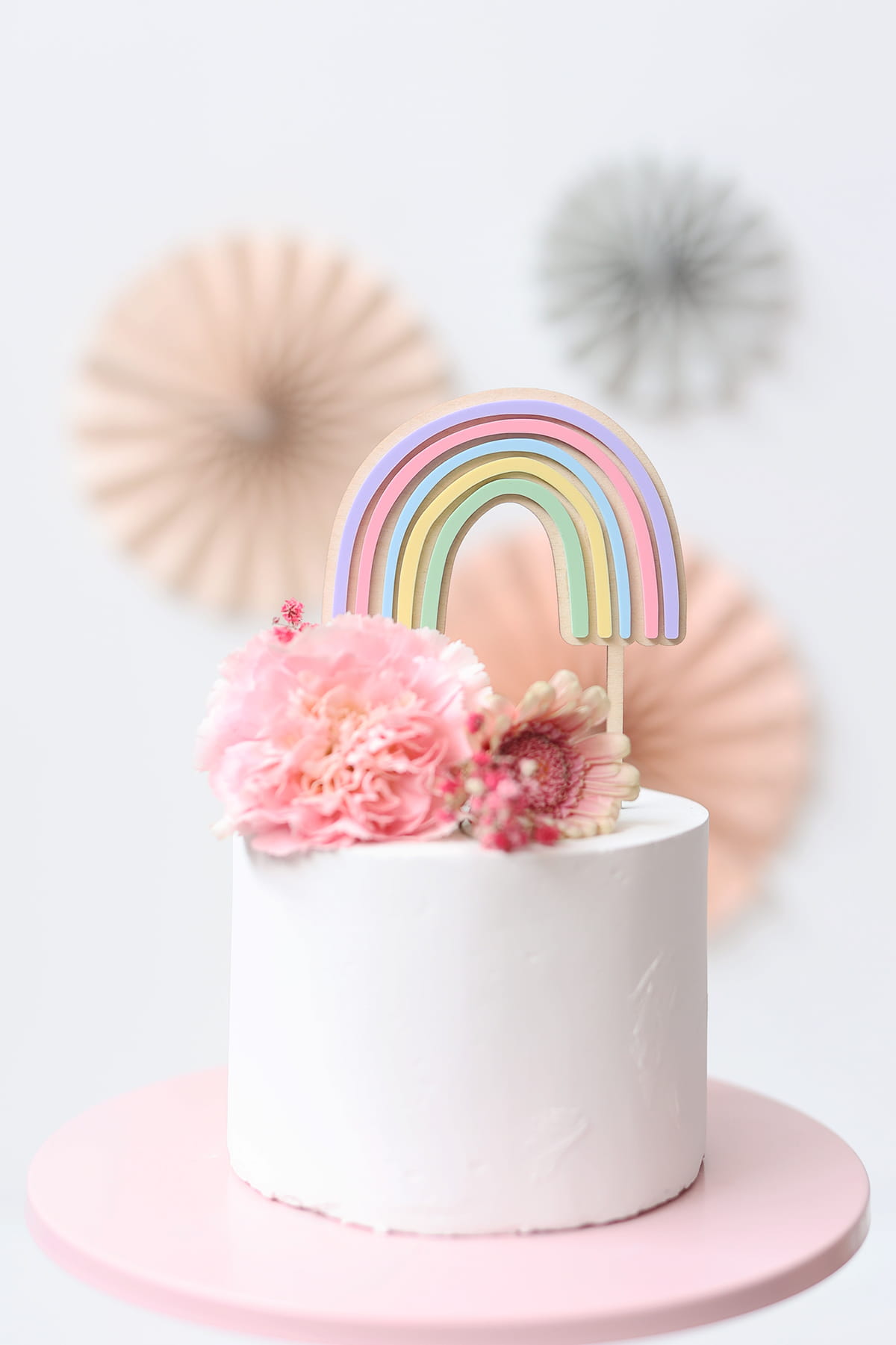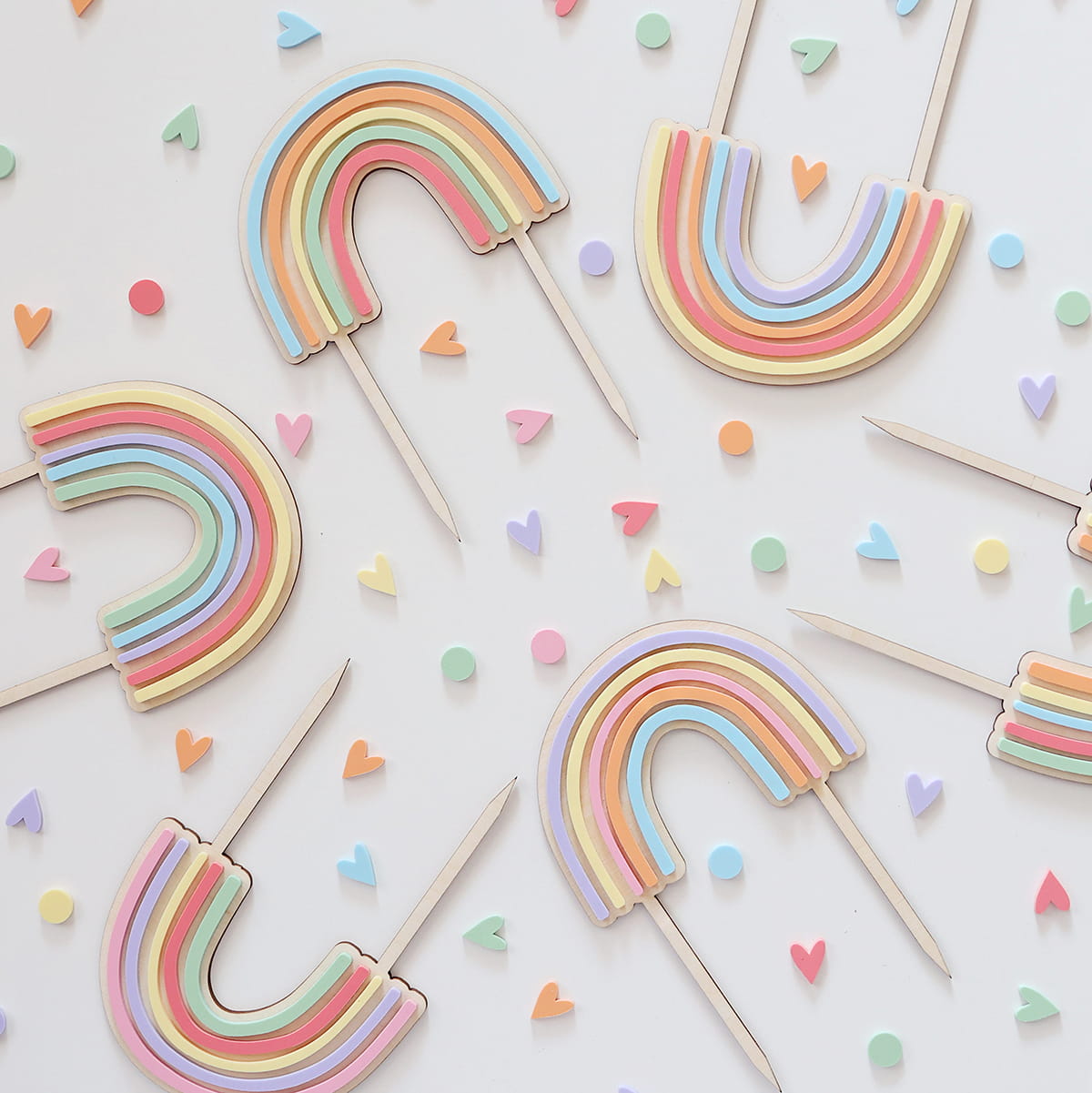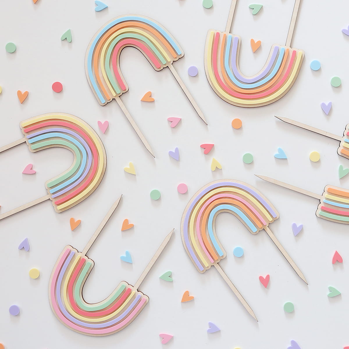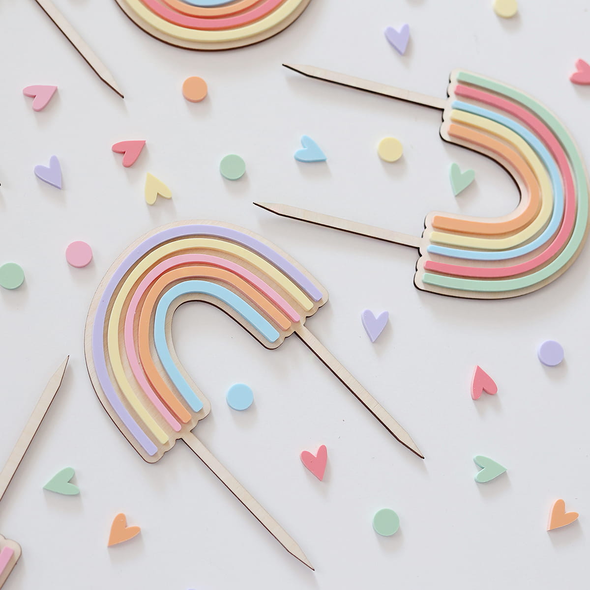 Topper w kształcie tęczy z drewnianą bazą i pastelowymi łukami.