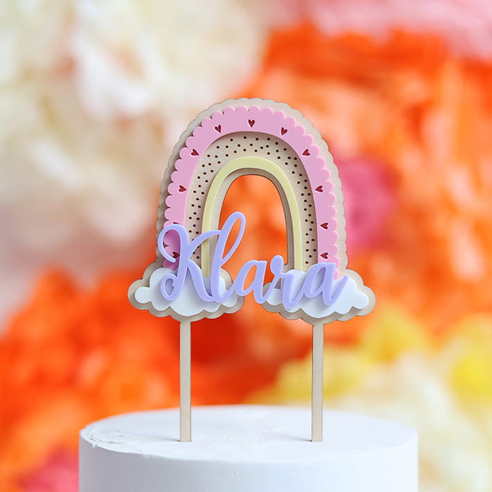 Topper w kształcie tęczy z drewnianą bazą, pastelowymi elementami oraz wybranym imieniem w kolorze fioletowym.