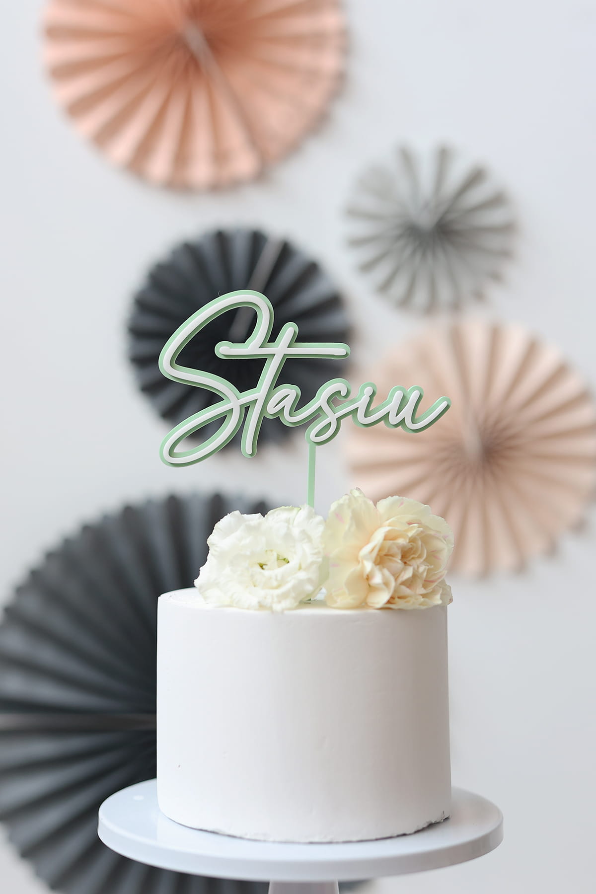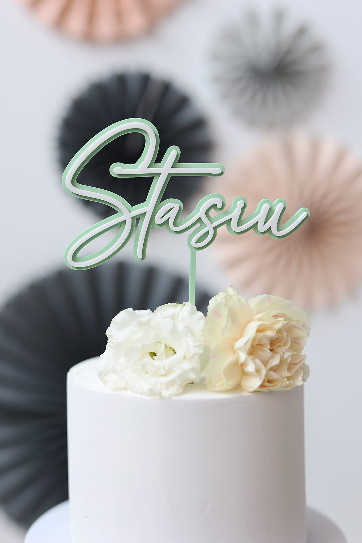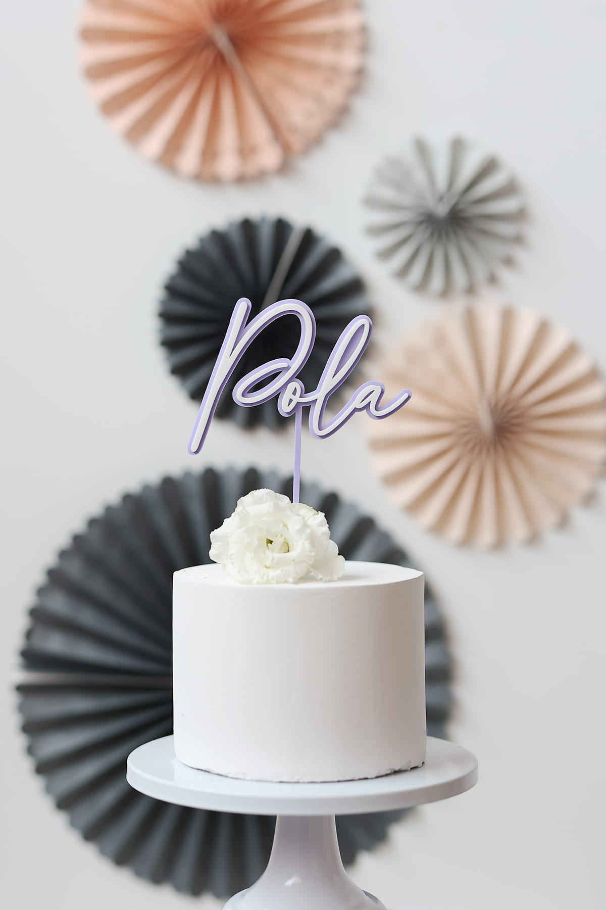 Topper z dowolnym, jednym imieniem lub słowem, składający się z dwóch warstw - kolorowej bazy i białego napisu.
