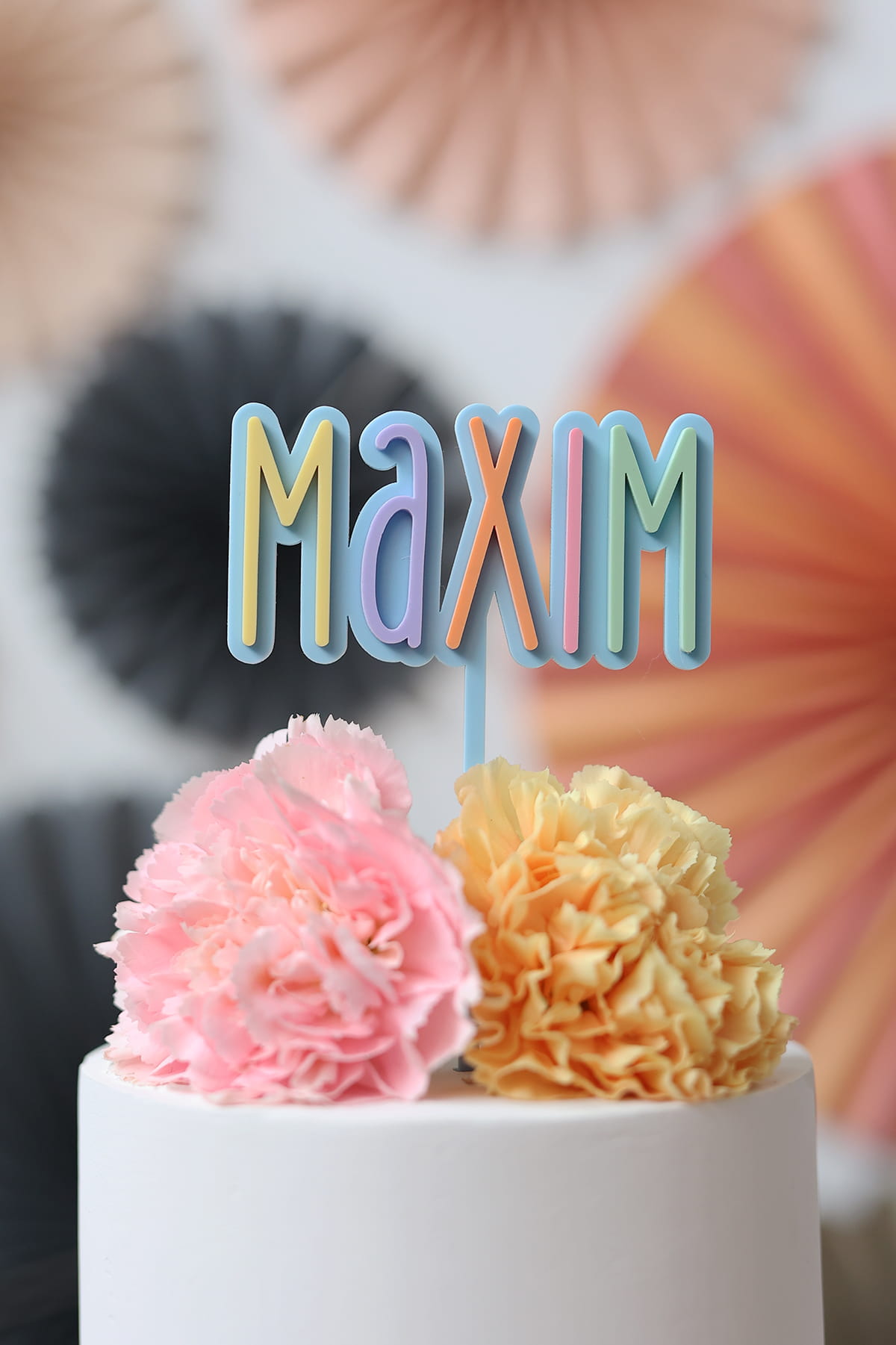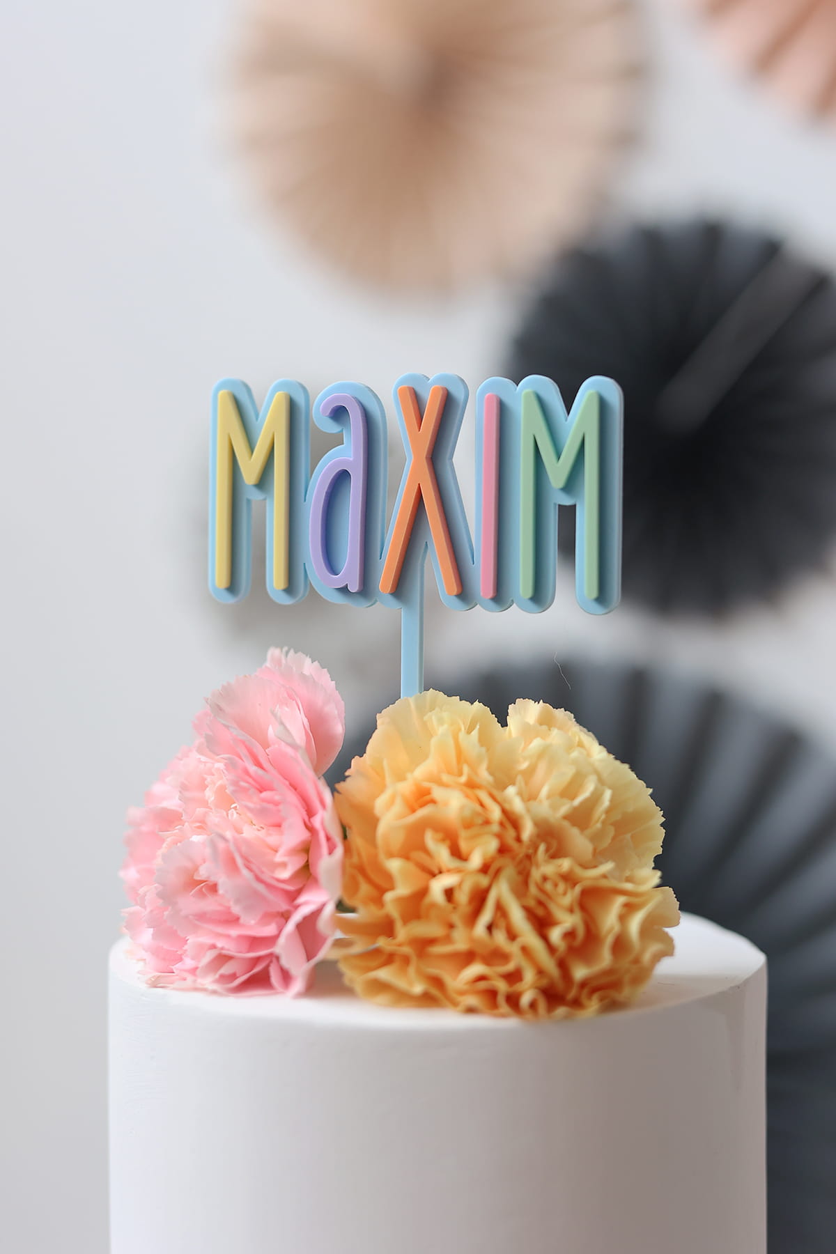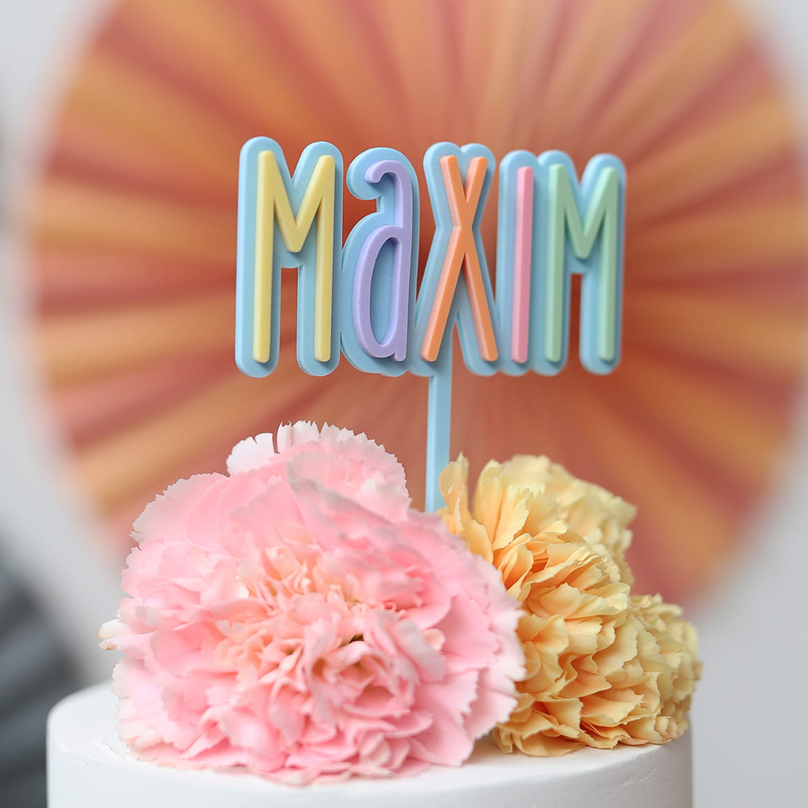 Topper składający się z kolorowych, pojedynczych literek, umieszczonych na kolorowej bazie. Na topperze może znaleźć się dowolne jedno imię lub pojedyncze słowo.