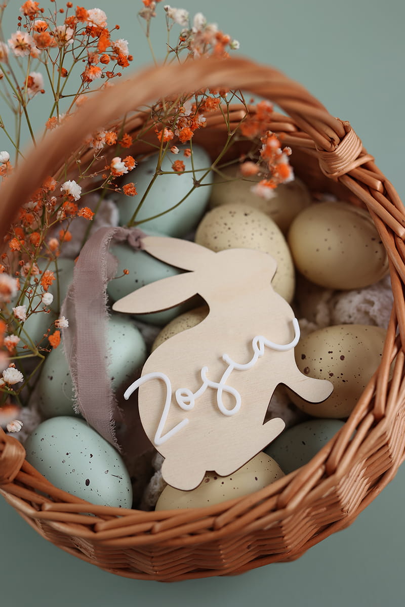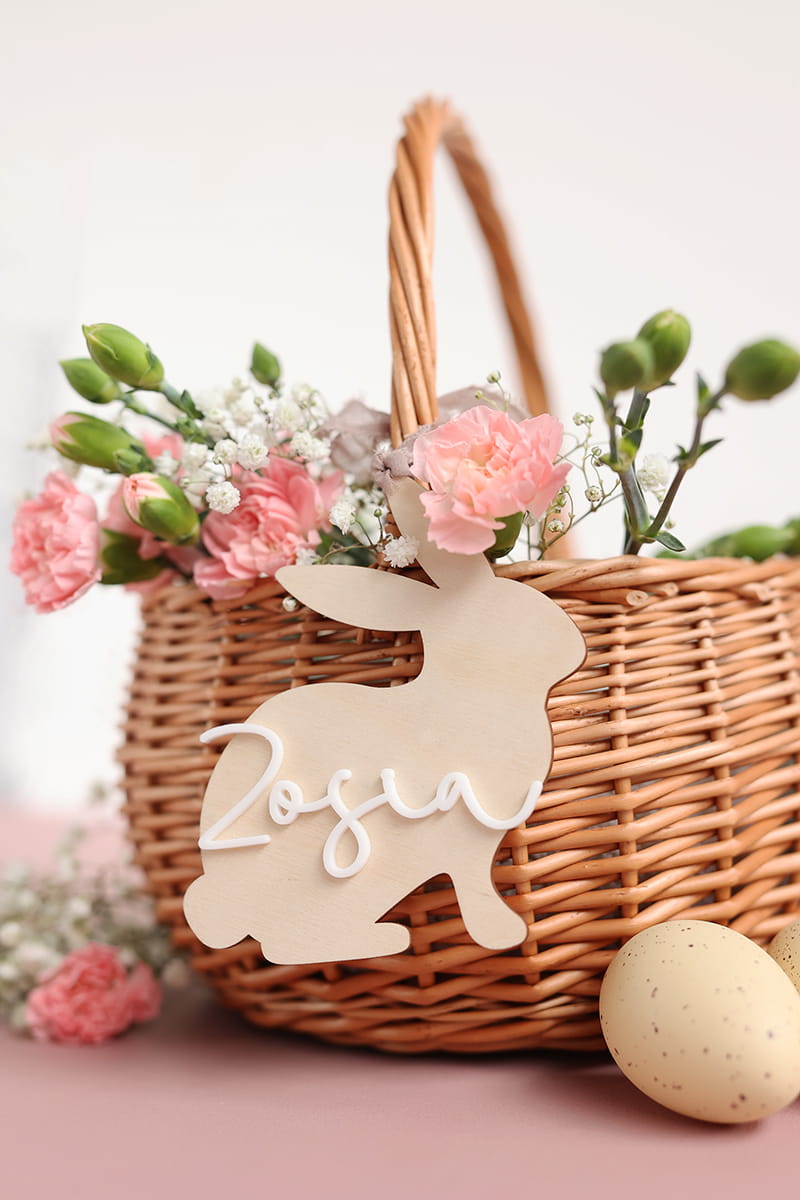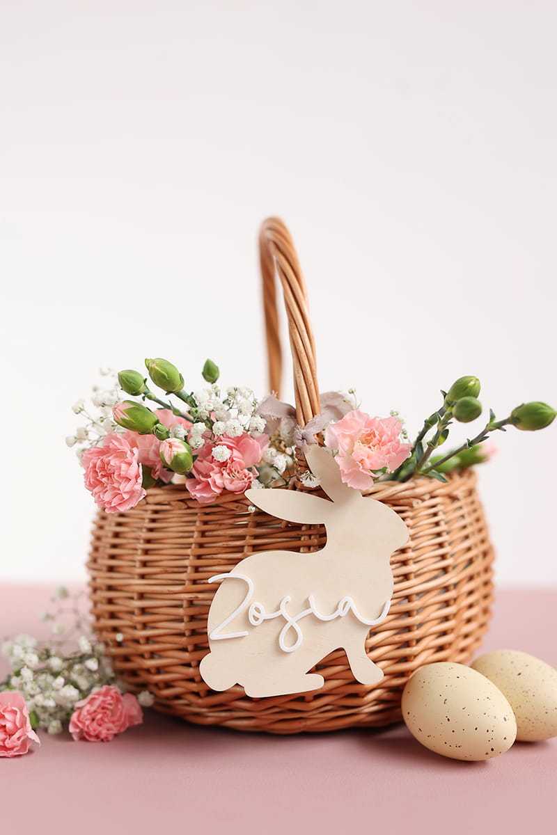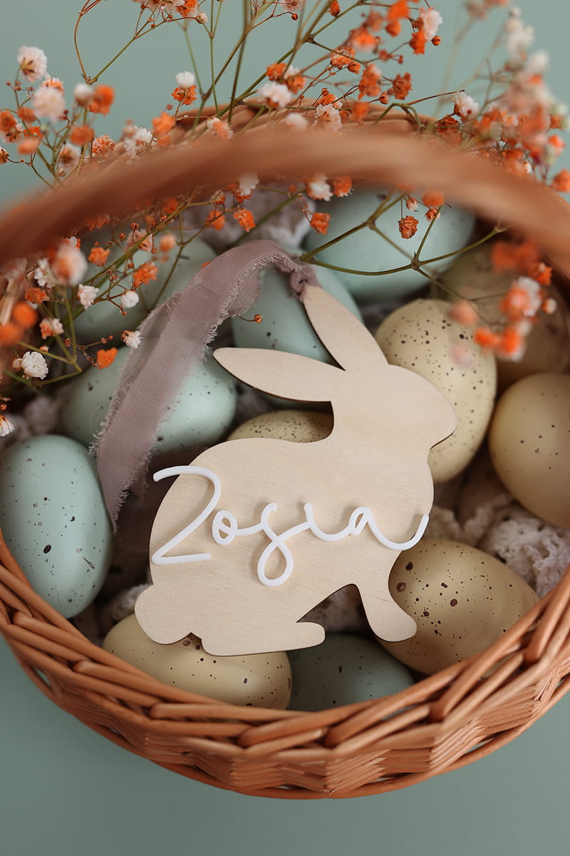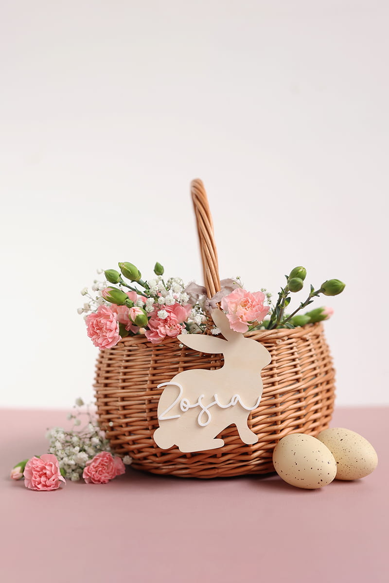 Drewniana personalizowana zawieszka w kształcie zajączka z dowolnym jednym imieniem. Ciekawy pomysł na ozdobę stołu, drzwi, okien, a także element wielkanocnych stroików czy koszyczka.