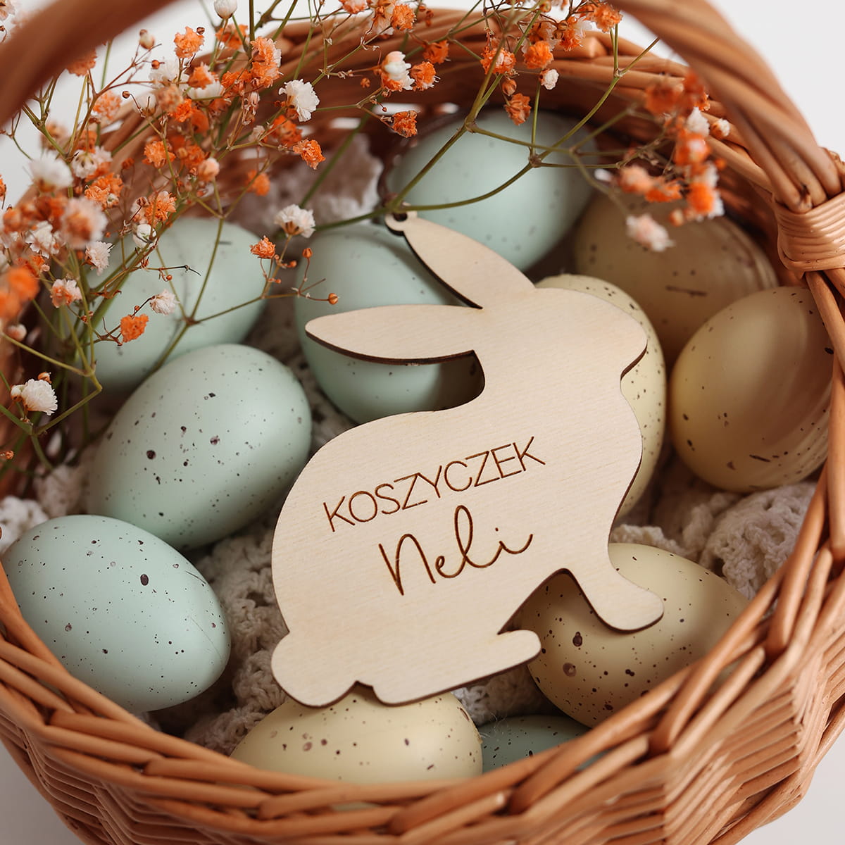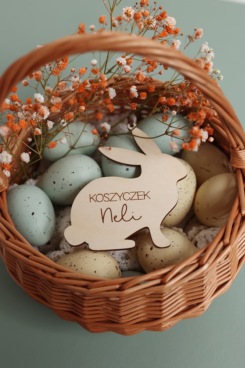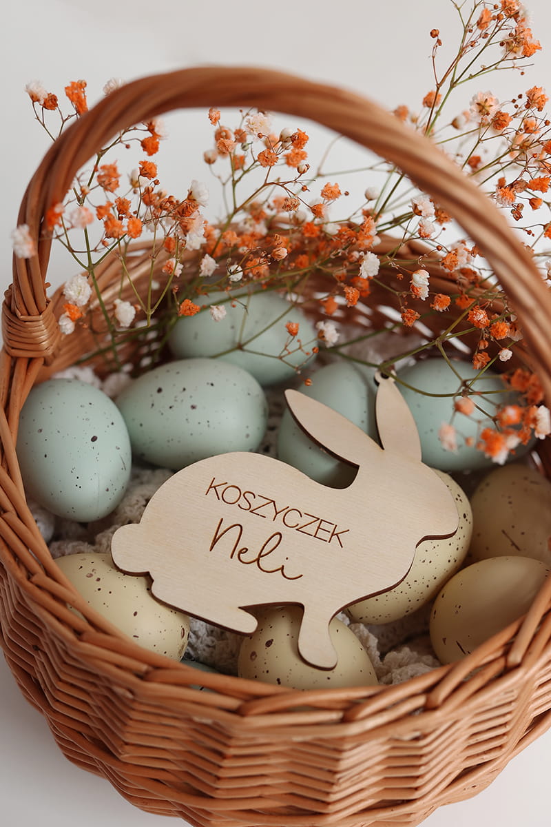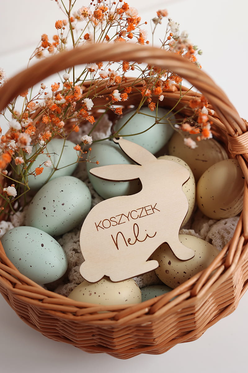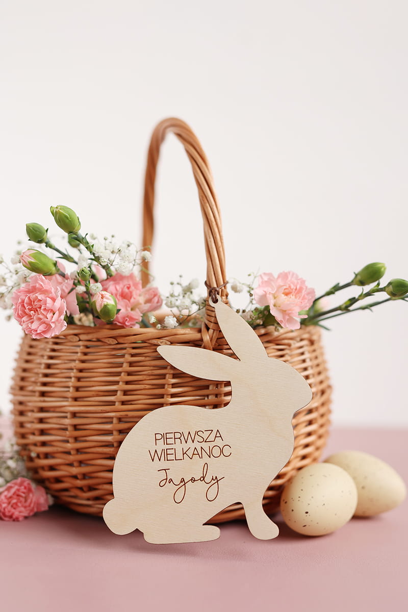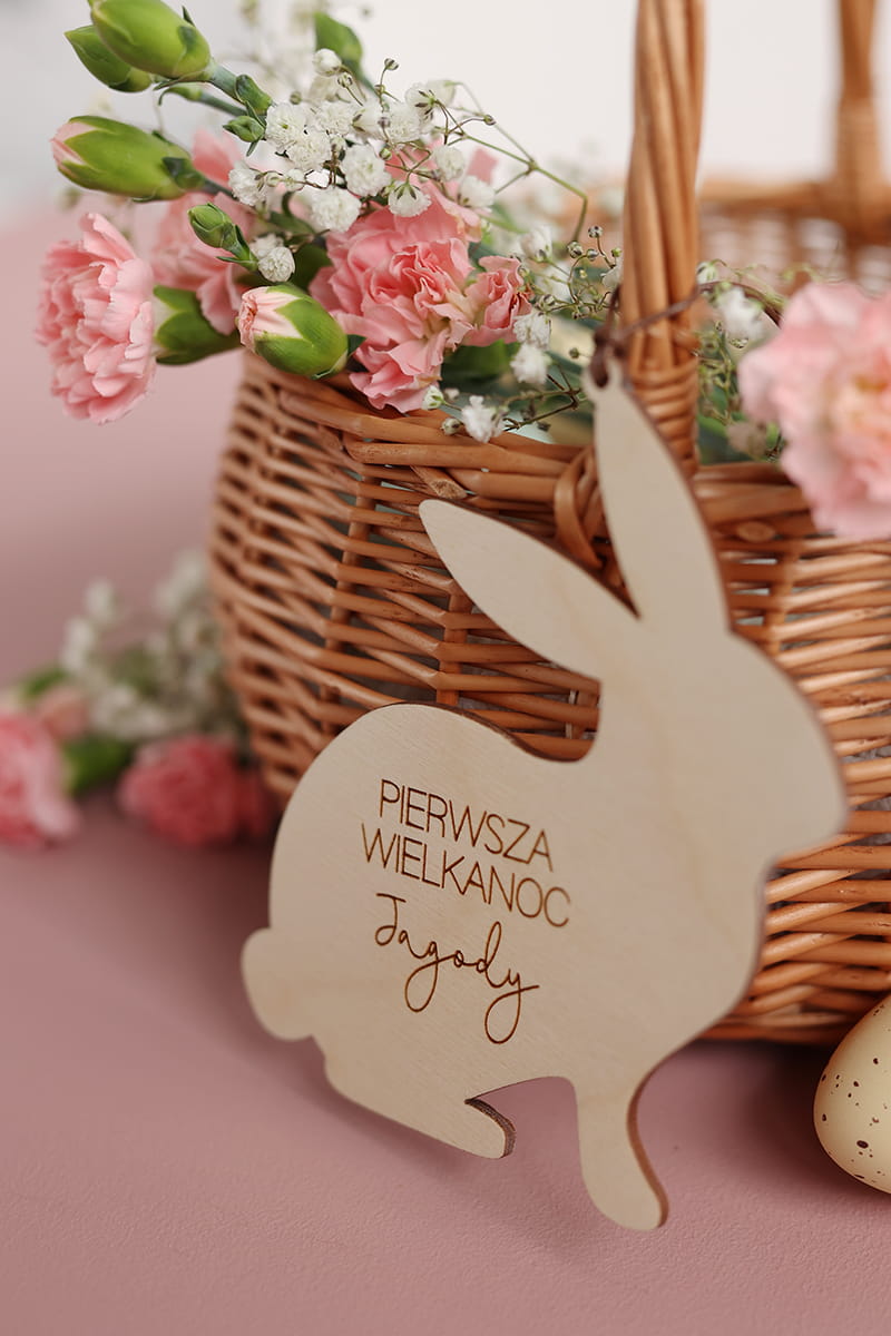 Drewniana personalizowana zawieszka w kształcie zajączka z dowolnym napisem. Ciekawy pomysł na ozdobę stołu, drzwi, okien, a także element wielkanocnych stroików czy koszyczka.