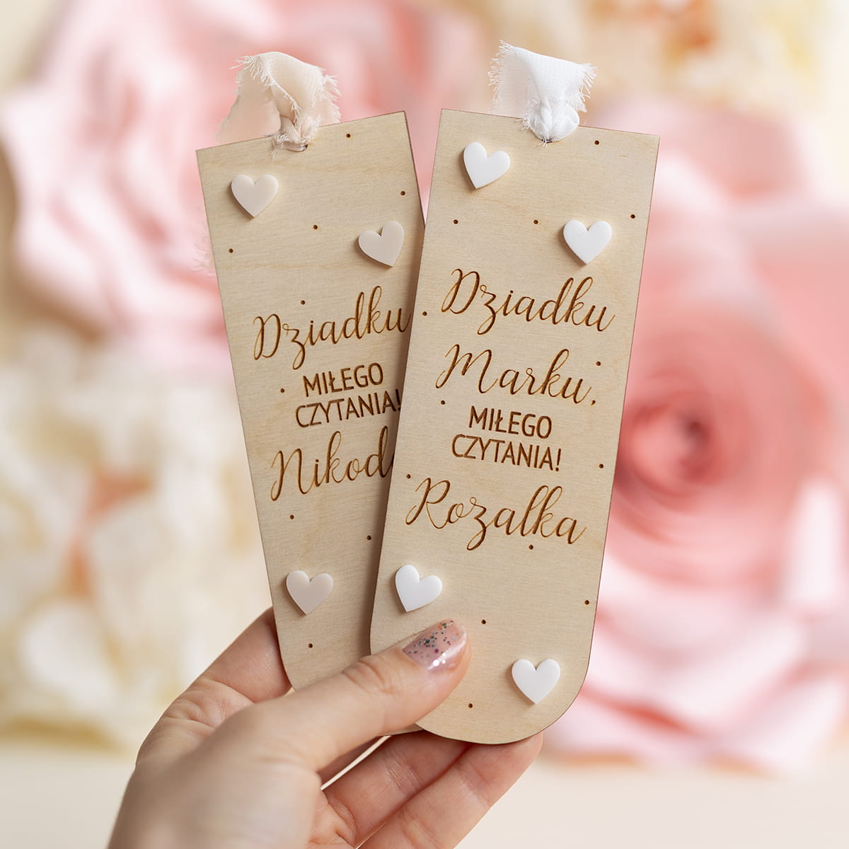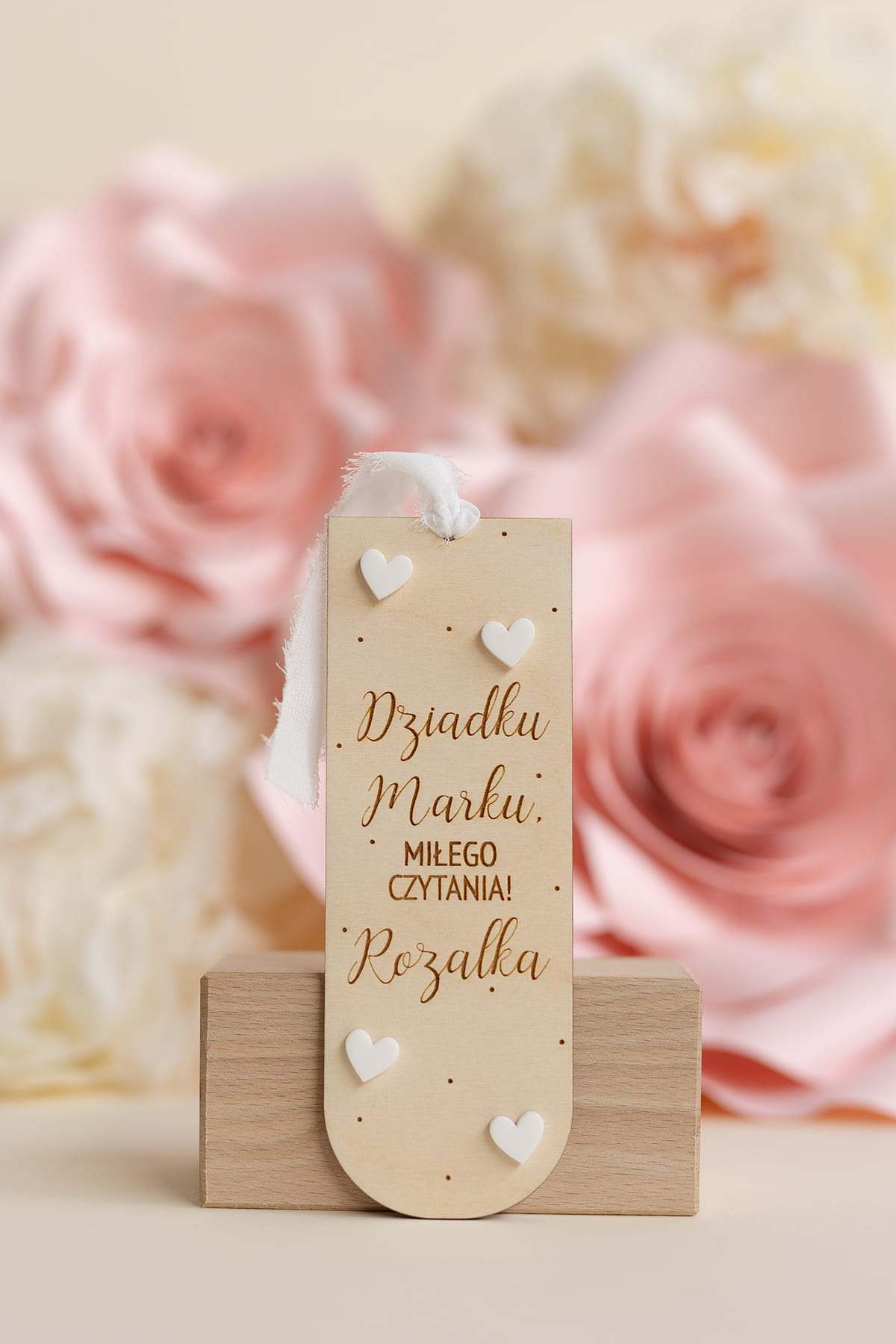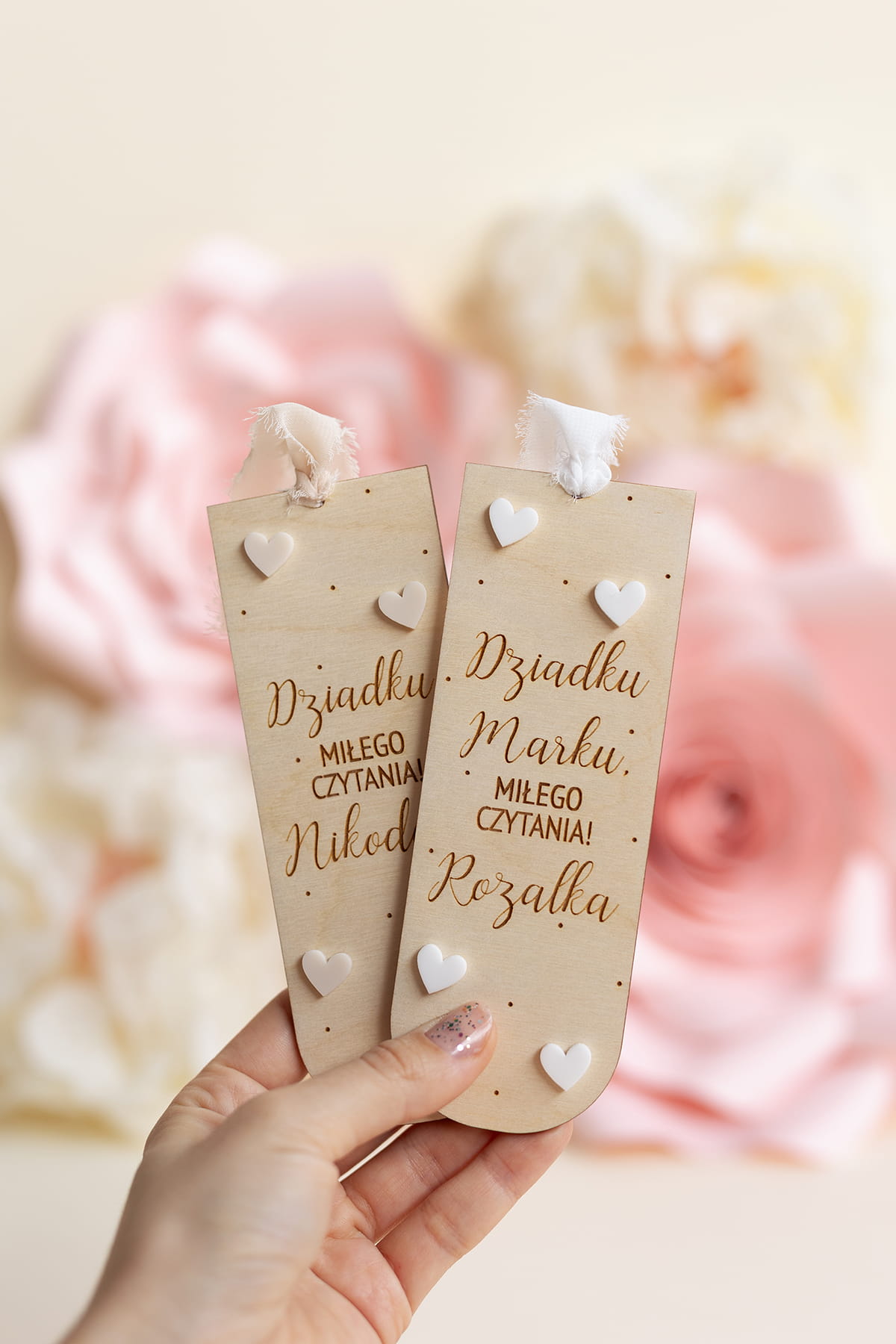 Personalizowana zakładka do książki, zaprojektowana z myślą o Babciach i Dziadkach! Ozdobiona delikatnymi serduszkami w kolorze białym lub beżowym.