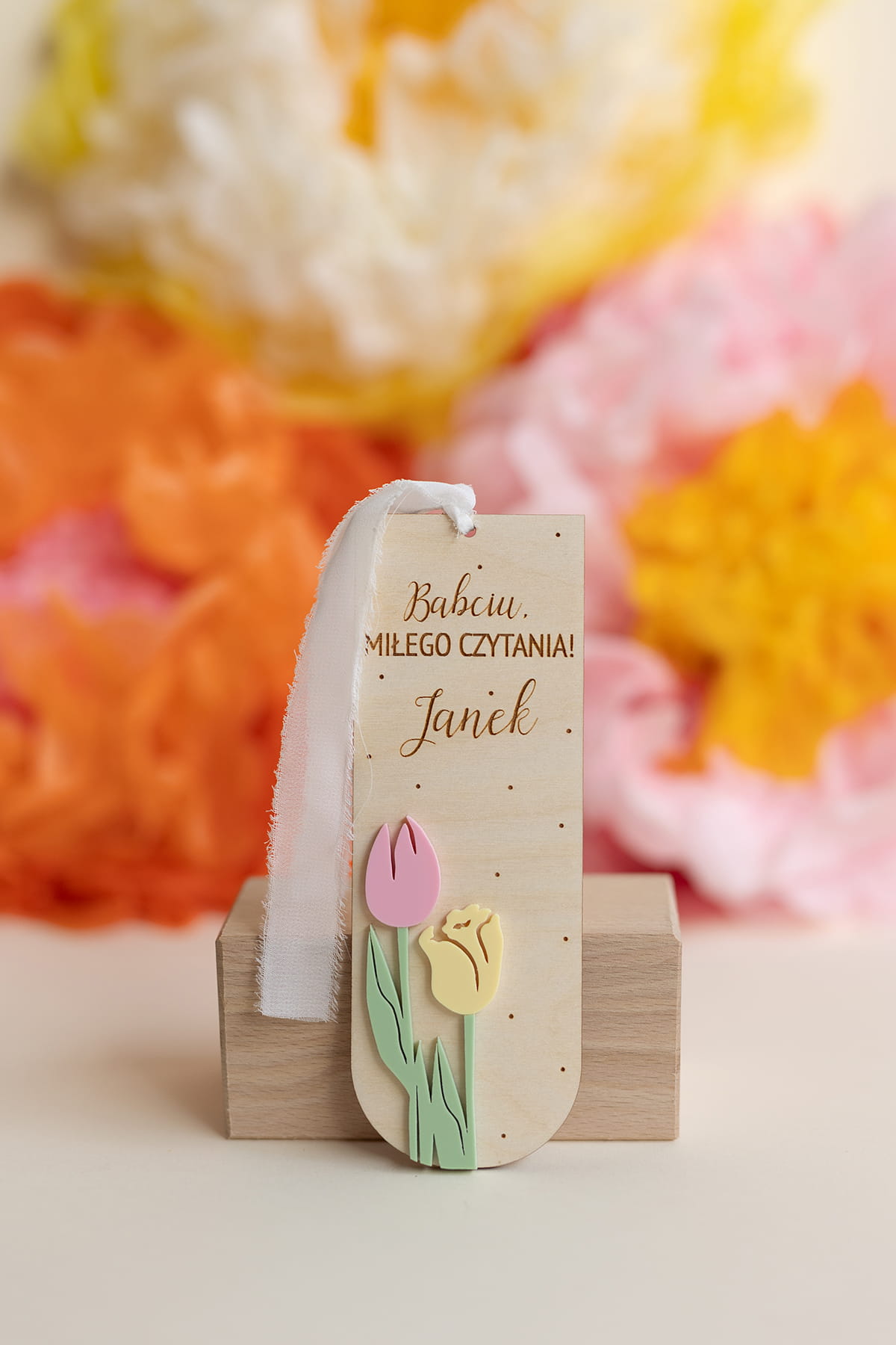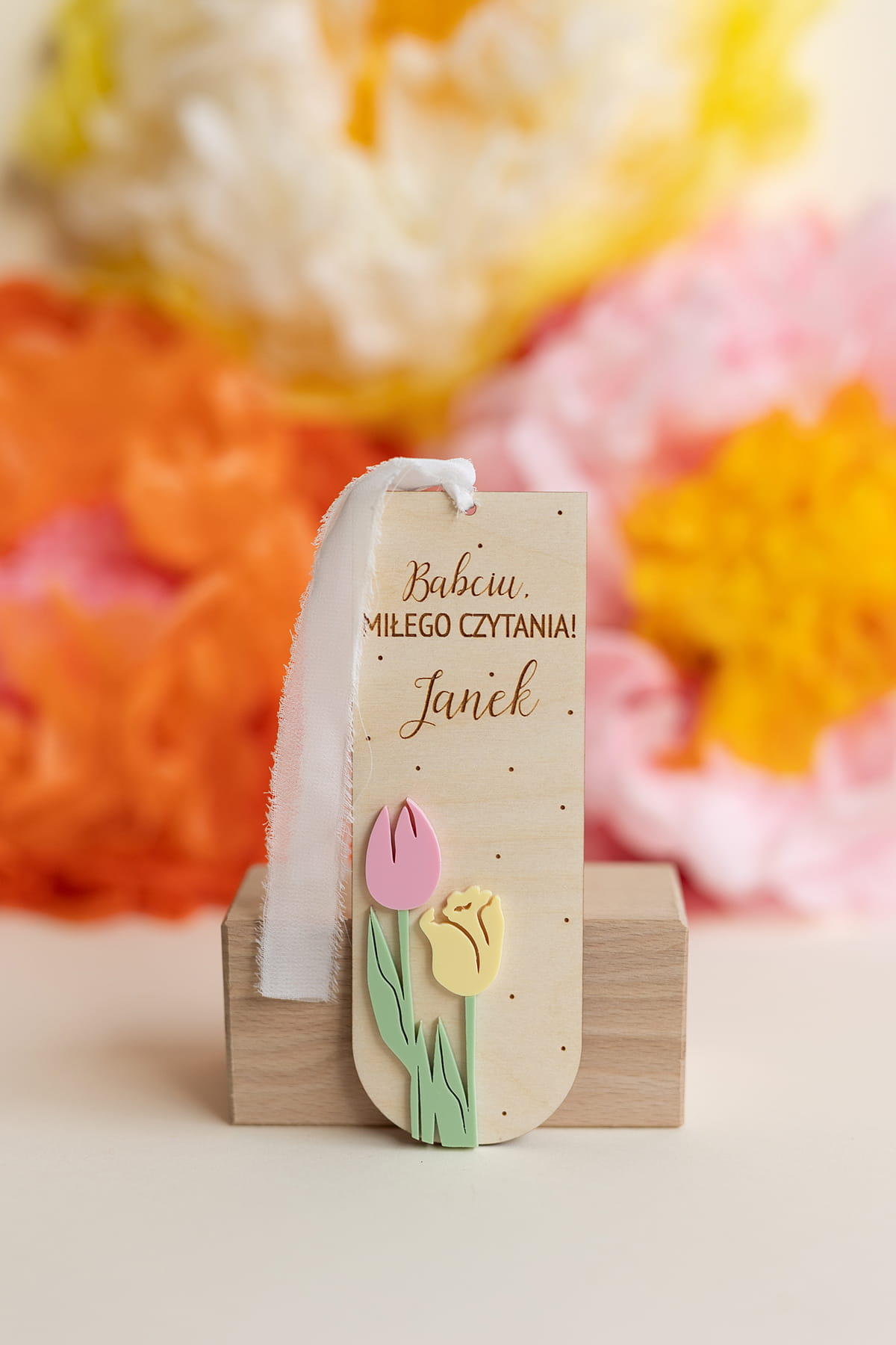 Personalizowana zakładka do książki, zaprojektowana z myślą o Babciach i Dziadkach! Ozdobiona motywem kolorowych tulipanów.