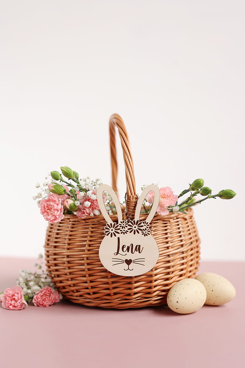 Drewniana personalizowana uszata zawieszka w kształcie króliczka. Ciekawy pomysł na ozdobę stołu, drzwi, okien, a także element wielkanocnych stroików.