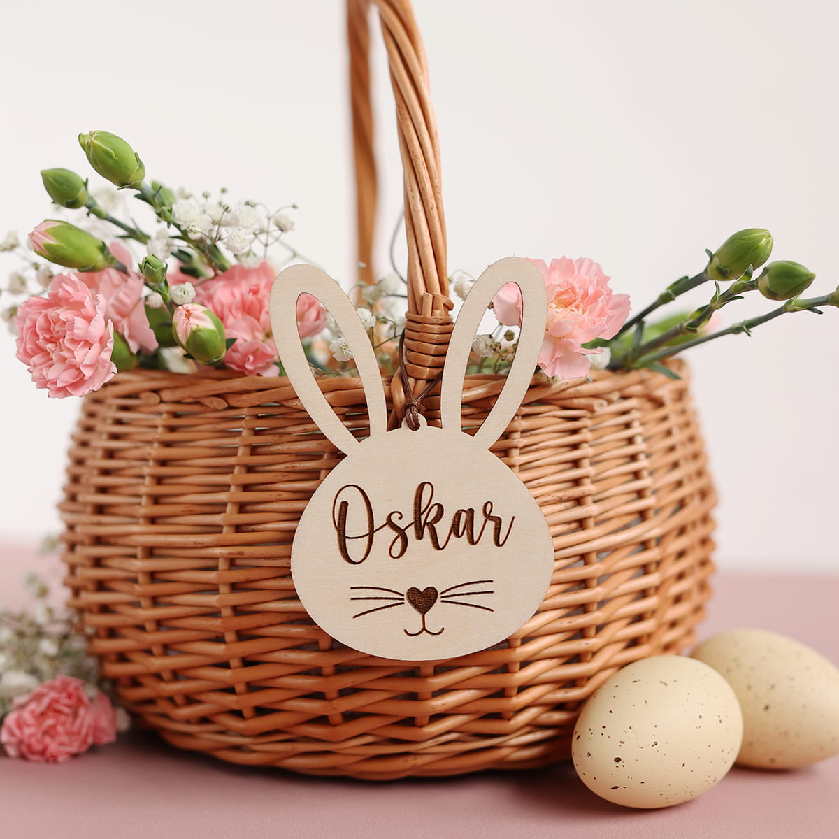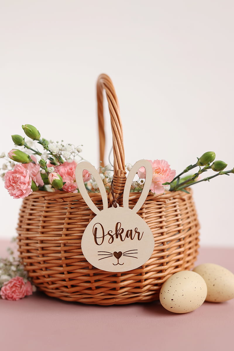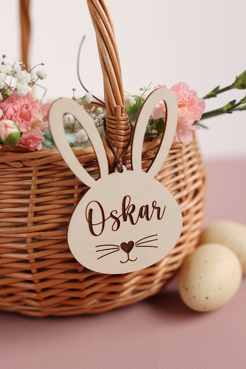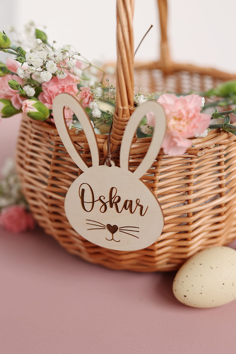 Drewniana personalizowana uszata zawieszka w kształcie króliczka. Ciekawy pomysł na ozdobę stołu, drzwi, okien, a także element wielkanocnych stroików.