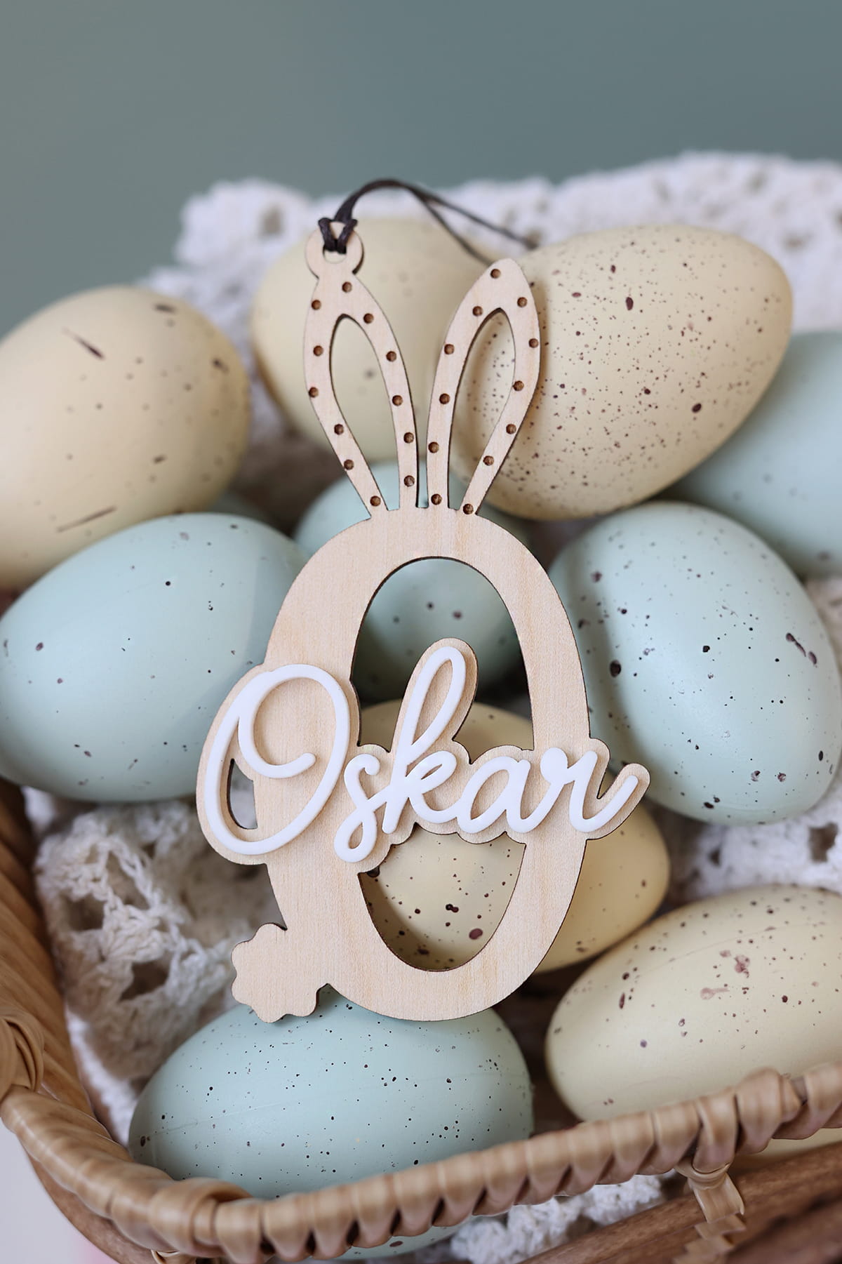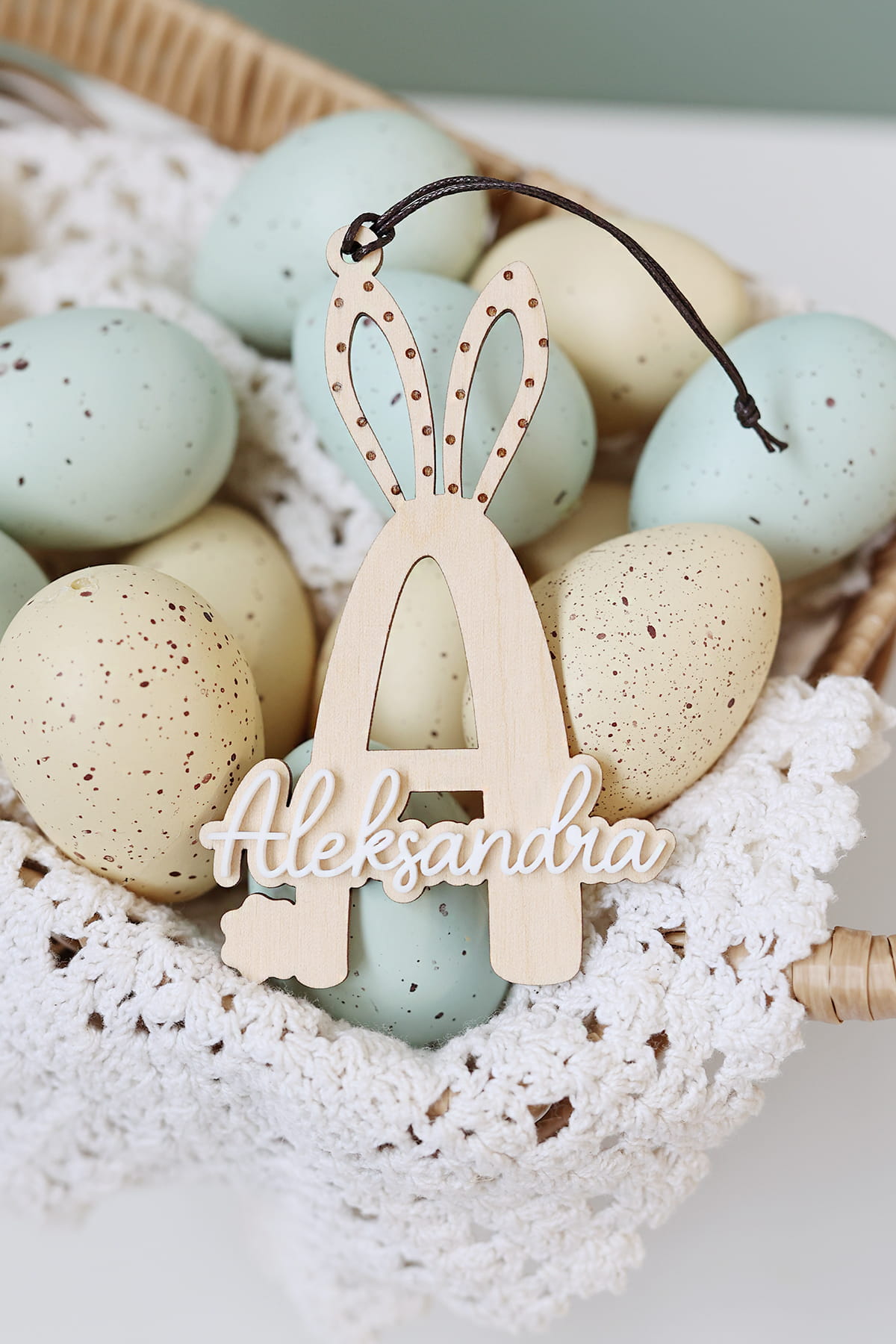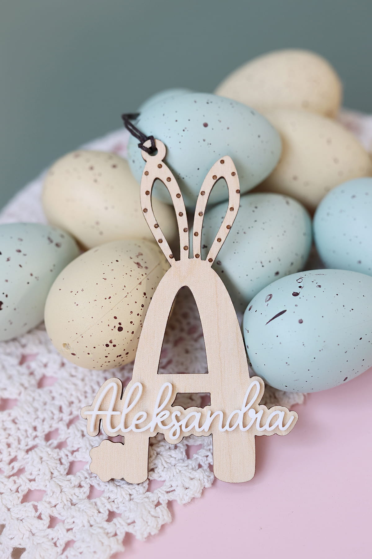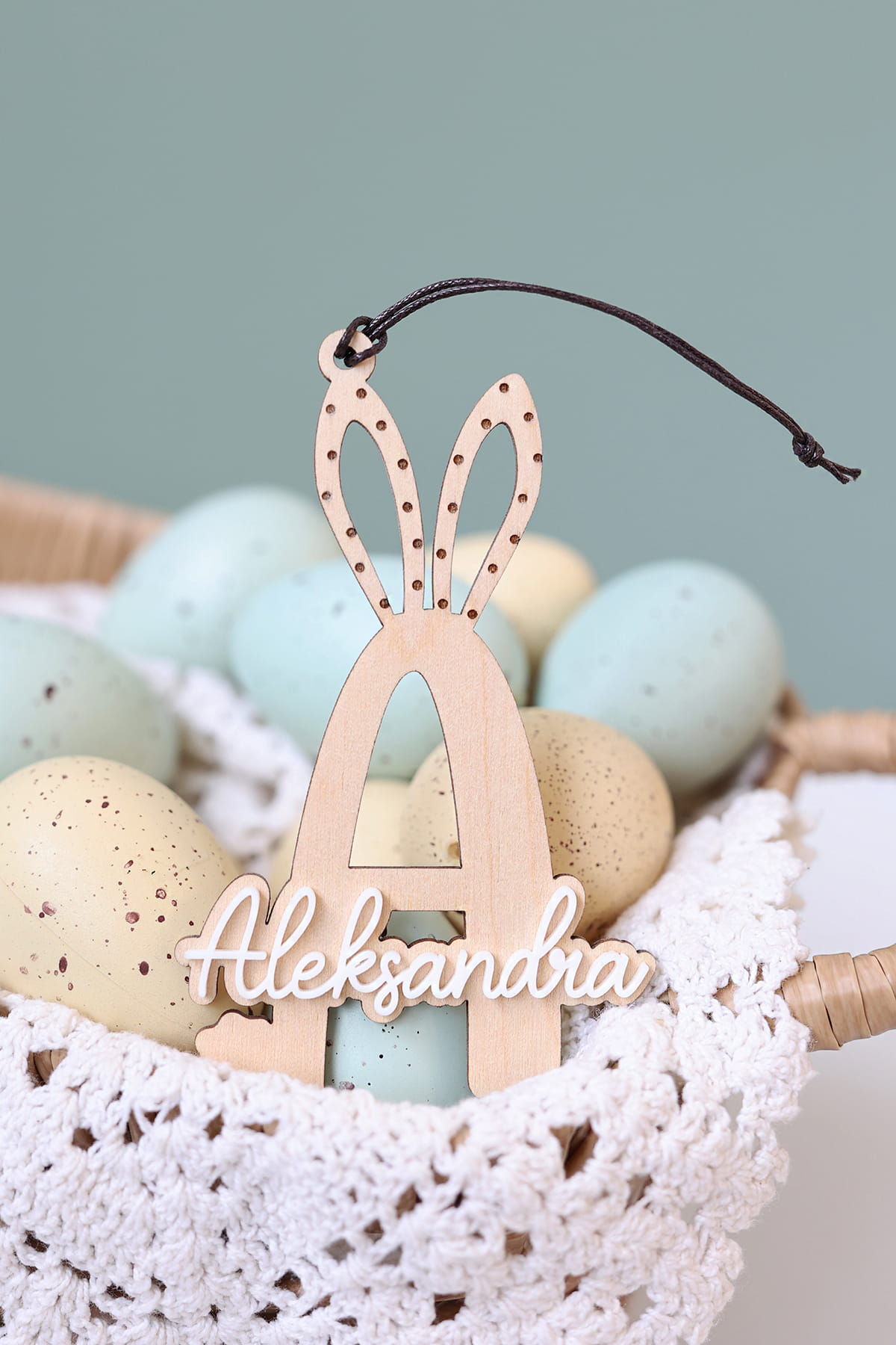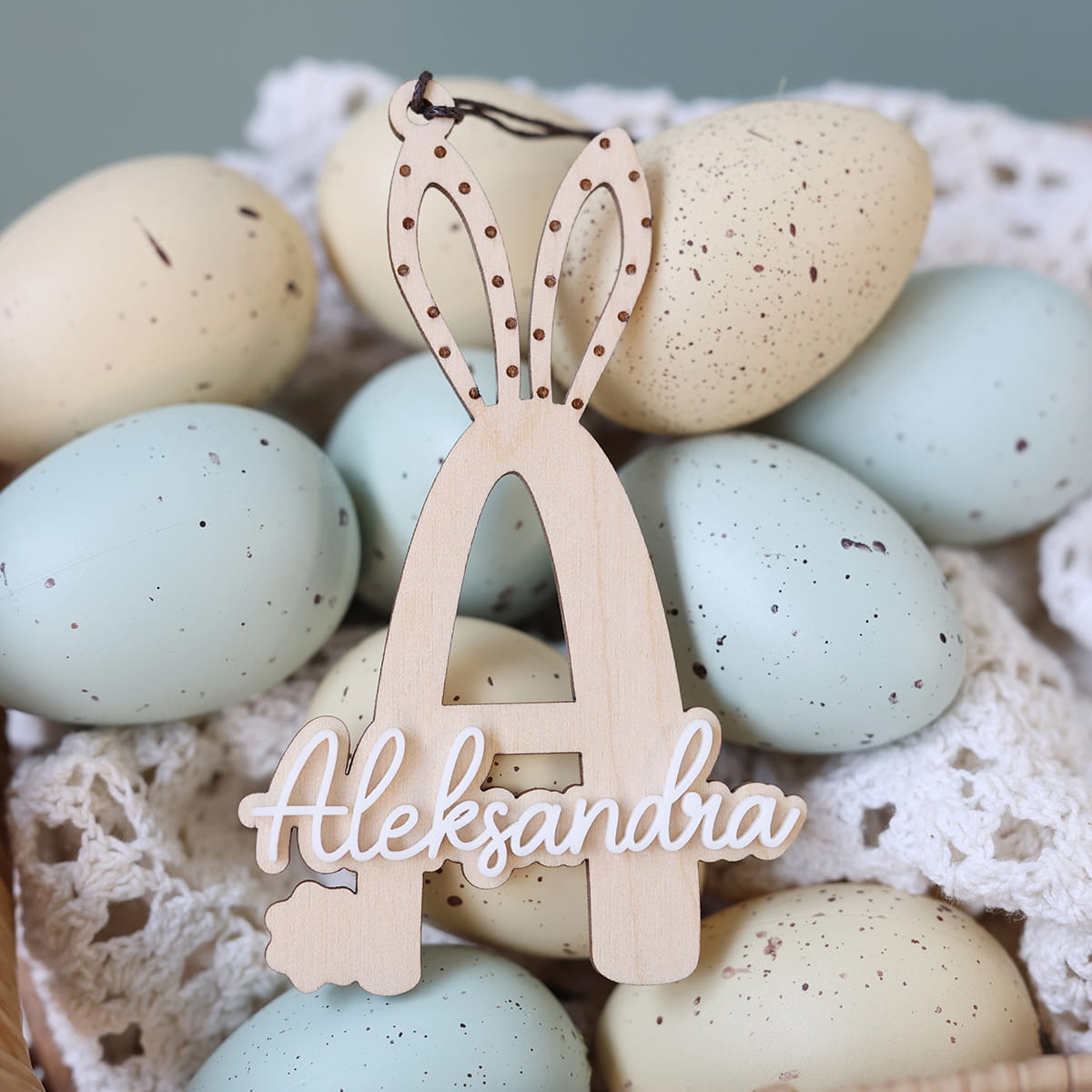 Warstwowa zawieszka w kształcie wybranej literki ozdobiona białym imieniem. Ciekawy pomysł na ozdobę stołu, drzwi, okien, a także element wielkanocnych stroików.