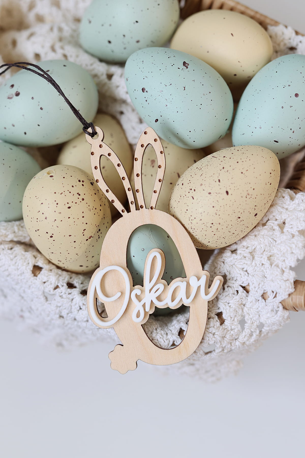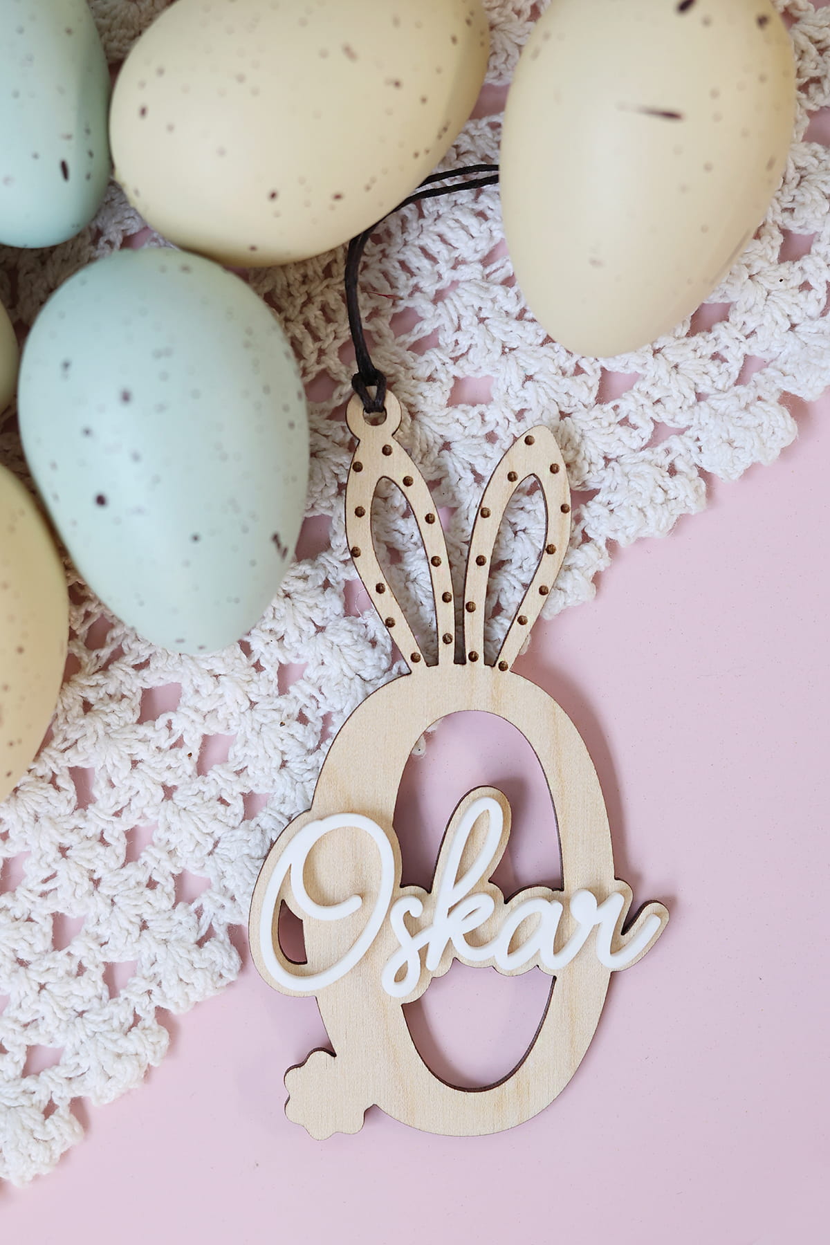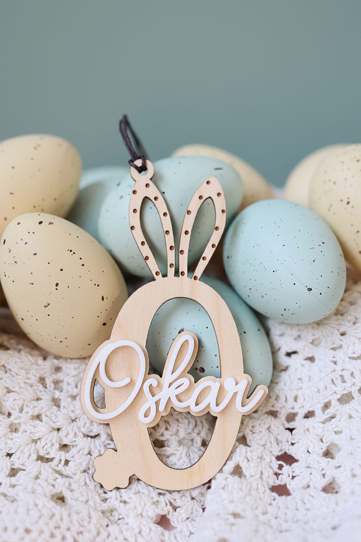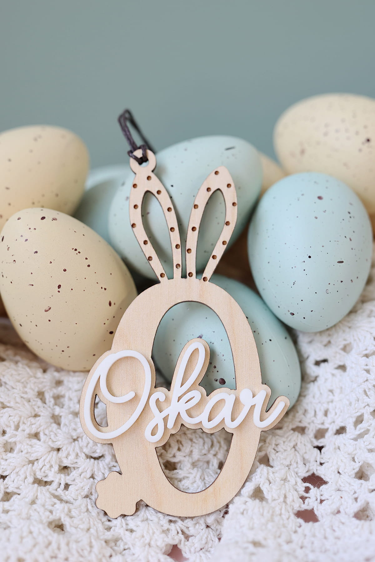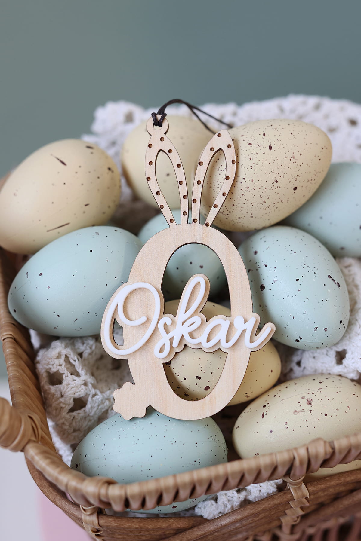 Warstwowa zawieszka w kształcie wybranej literki ozdobiona białym imieniem. Ciekawy pomysł na ozdobę stołu, drzwi, okien, a także element wielkanocnych stroików.