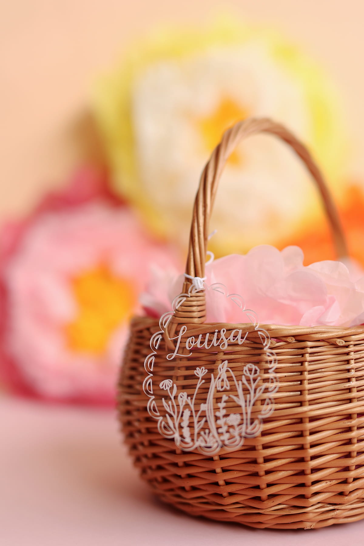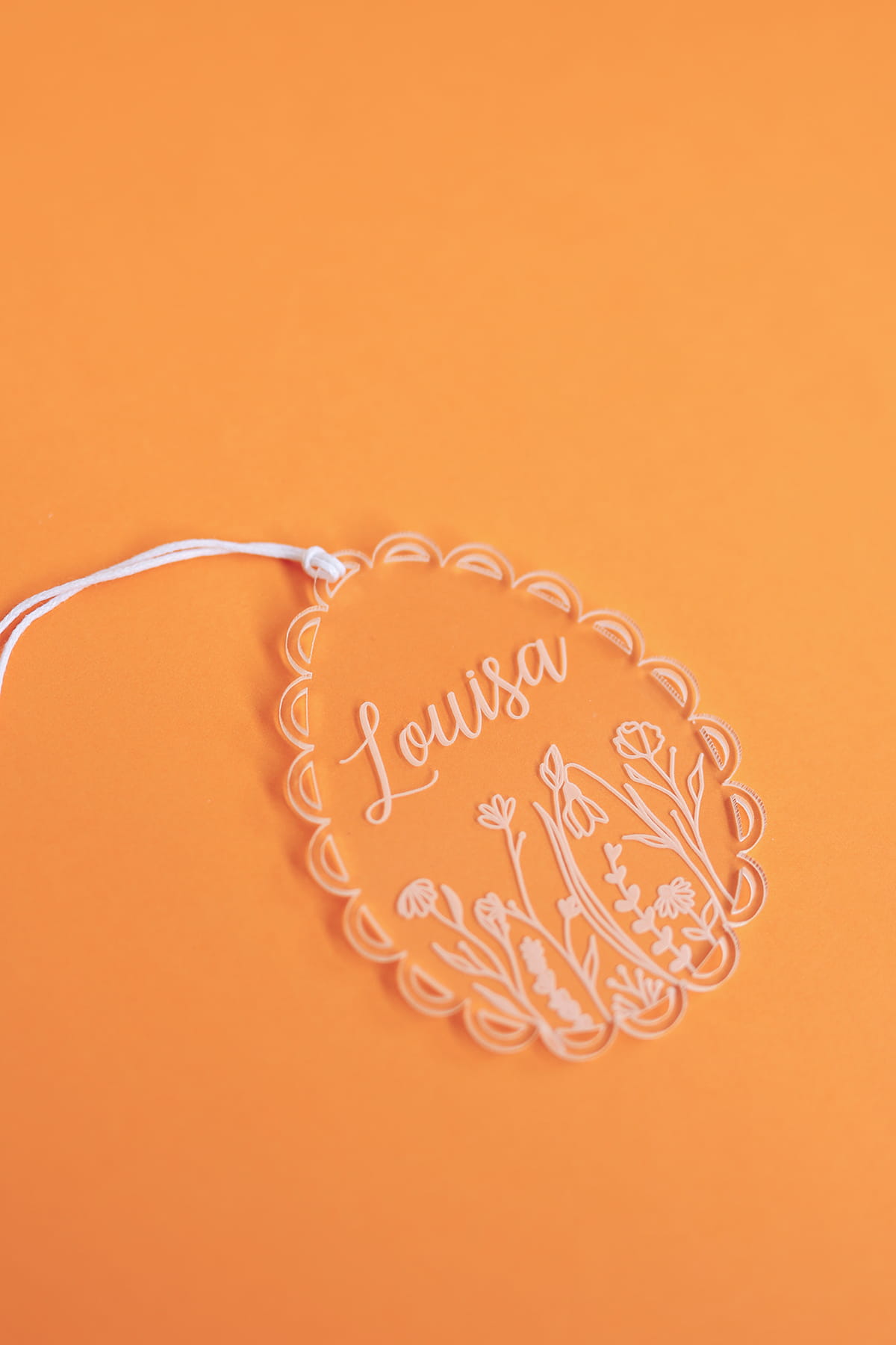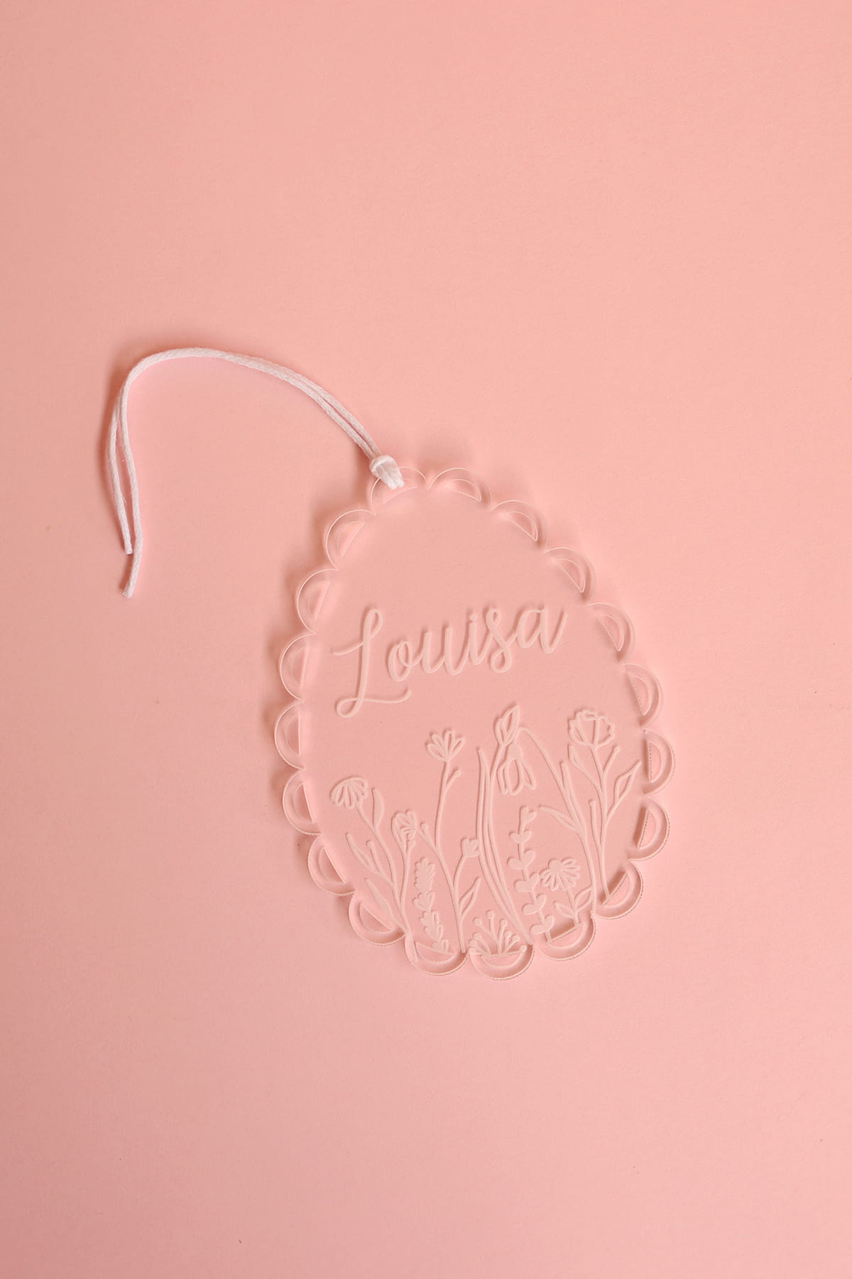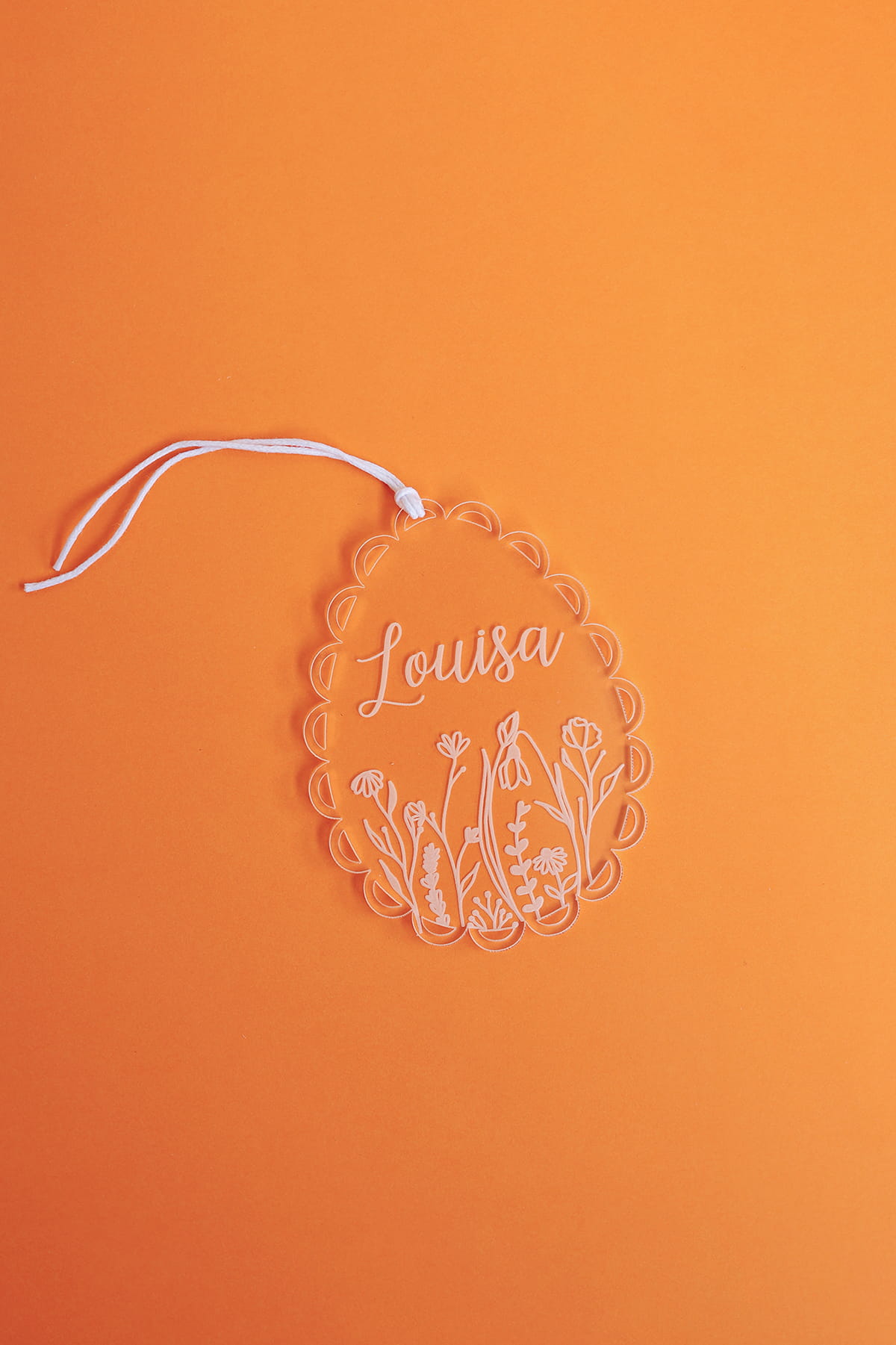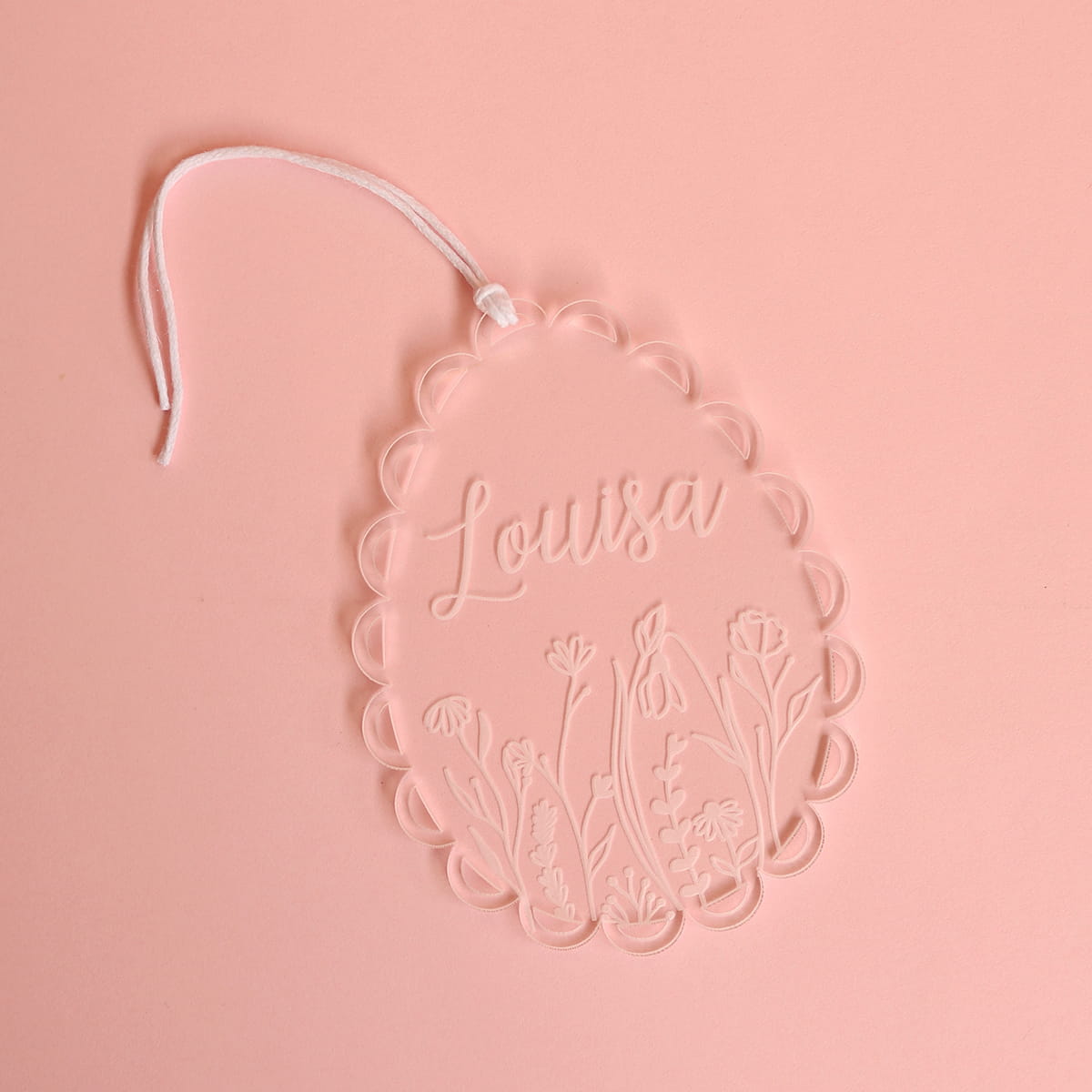 Transparentna zawieszka w kształcie jajka ozdobionego falbanką i motywem kwiatowym oraz dowolnym imieniem. Ciekawy pomysł na ozdobę stołu, drzwi, okien, a także element wielkanocnych stroików.