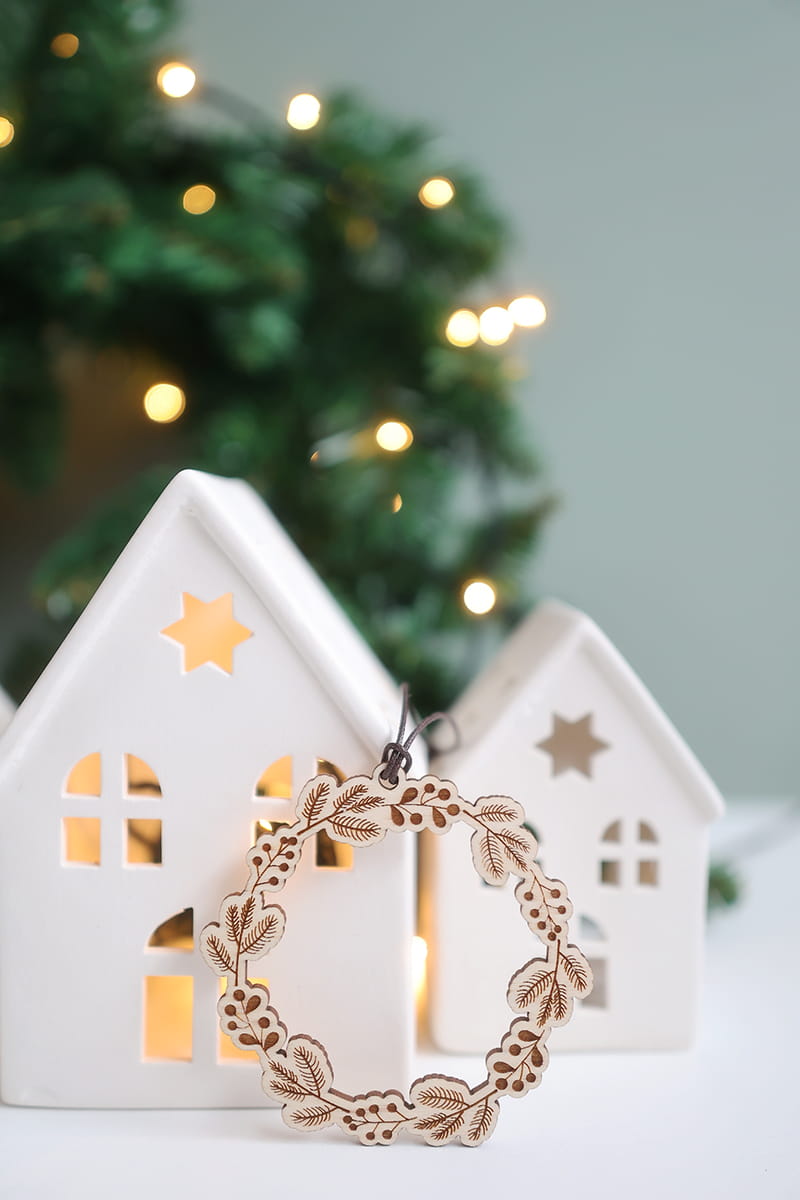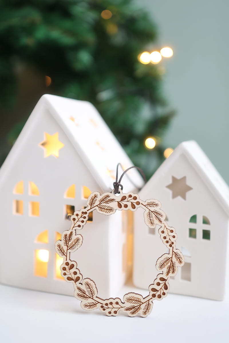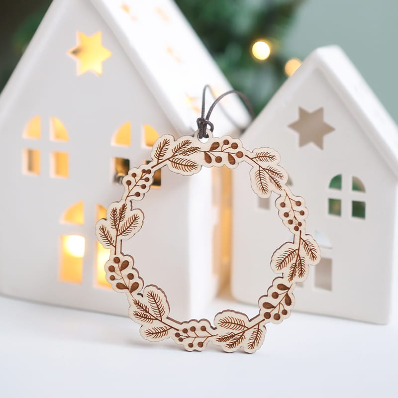 Drewniana, grawerowana jednostronnie zawieszka w kształcie świątecznego wieńca. Ciekawa alternatywa dla tradycyjnych ozdób choinkowych, a także dekoracji prezentowych.