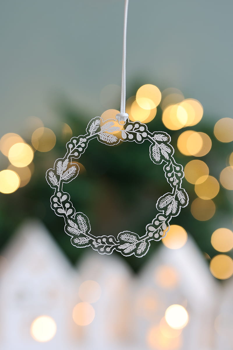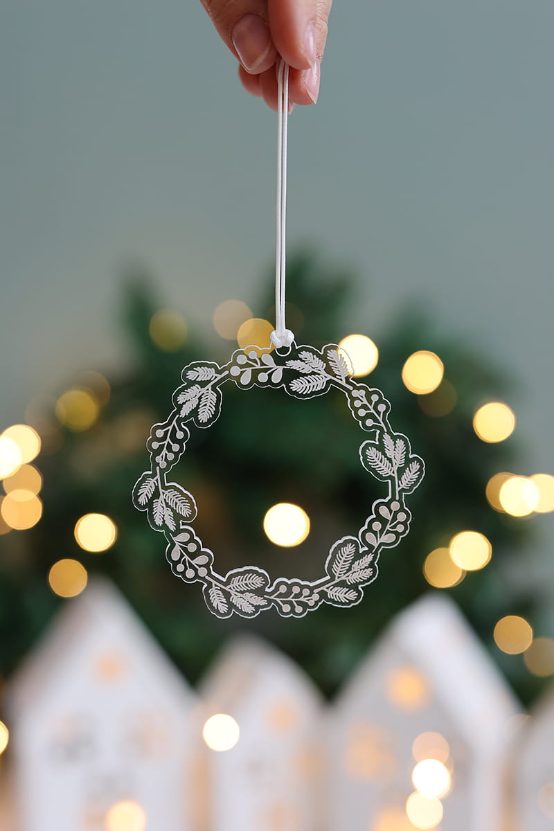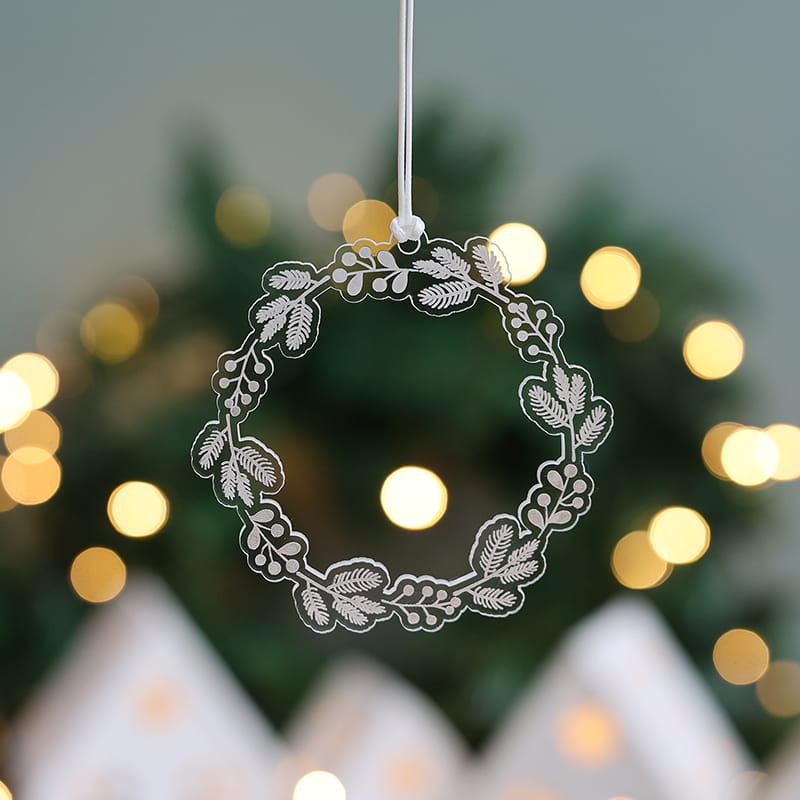 Grawerowana zawieszka w kształcie świątecznego wieńca. Ciekawa alternatywa dla tradycyjnych ozdób choinkowych, a także dekoracji prezentowych.
