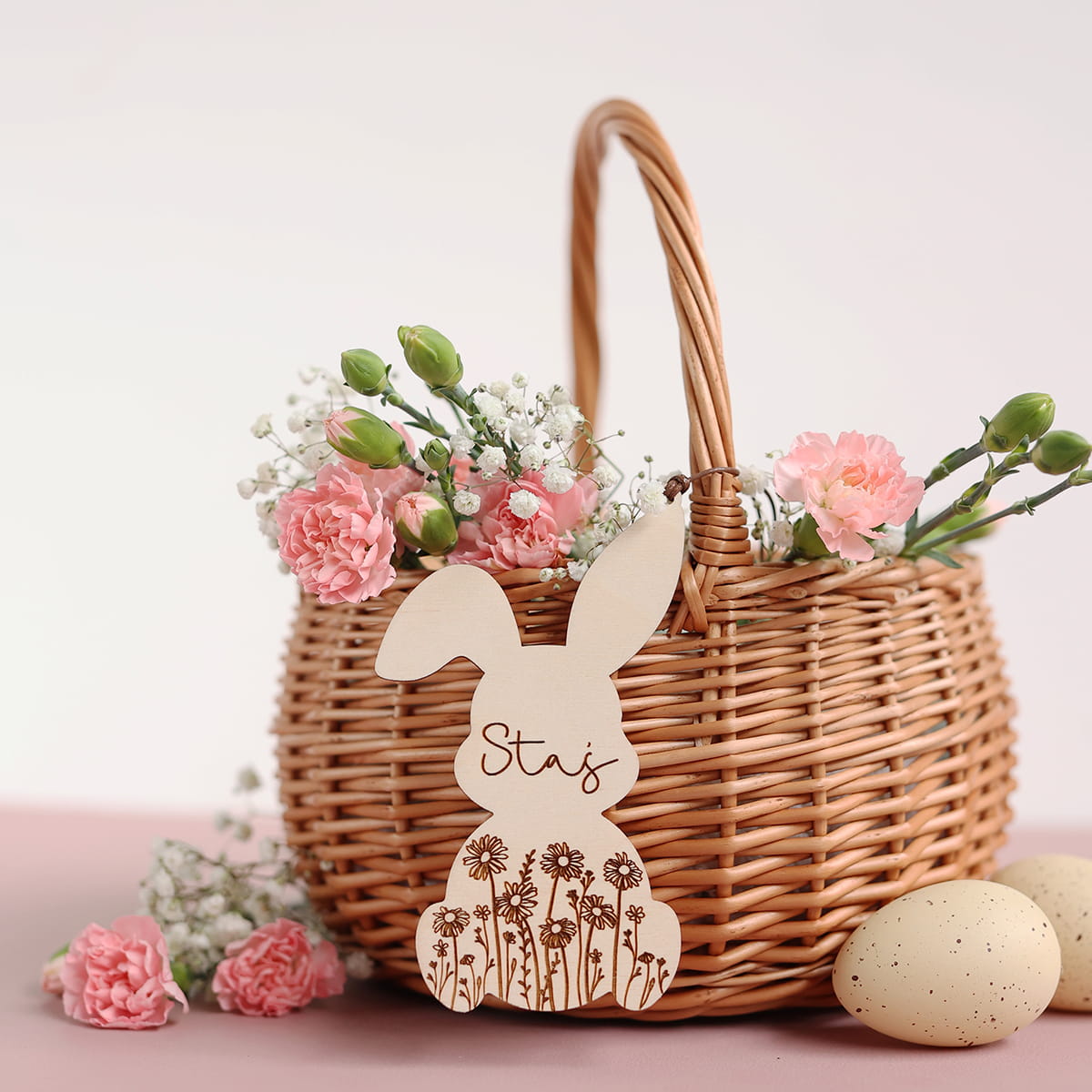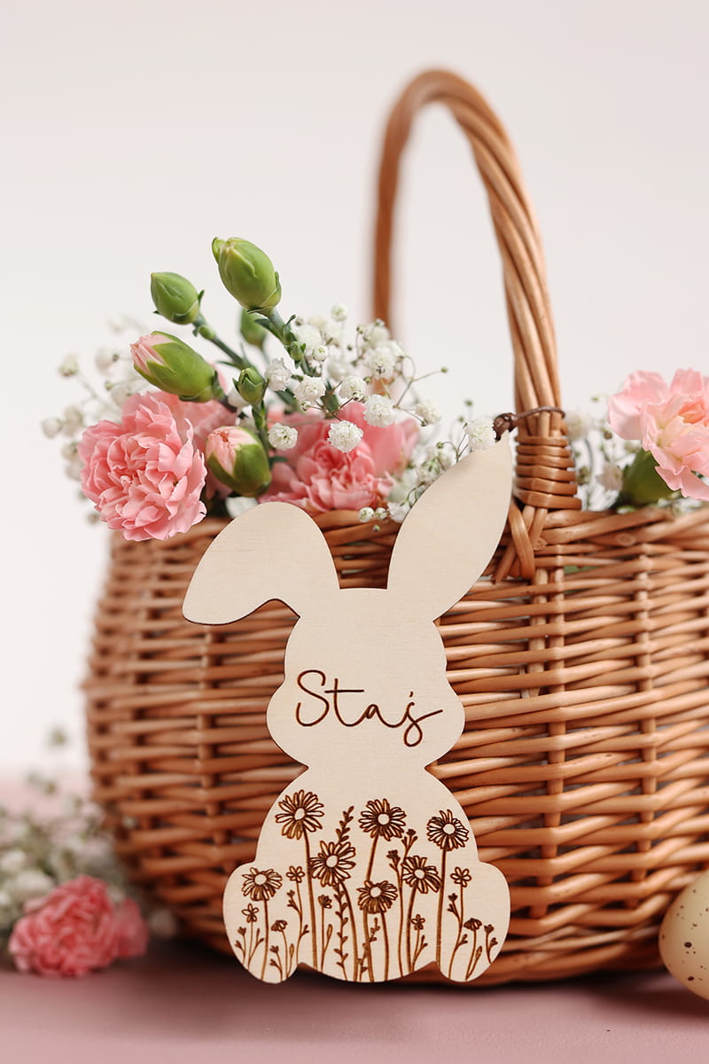 Zawieszka w kształcie zajączka z motywem łąki i dowolnym imieniem. Ciekawy pomysł na ozdobę stołu, drzwi, okien, a także element wielkanocnych stroików.