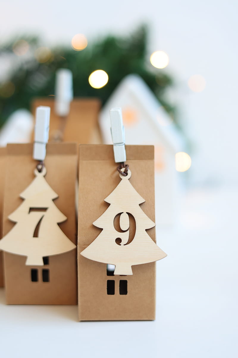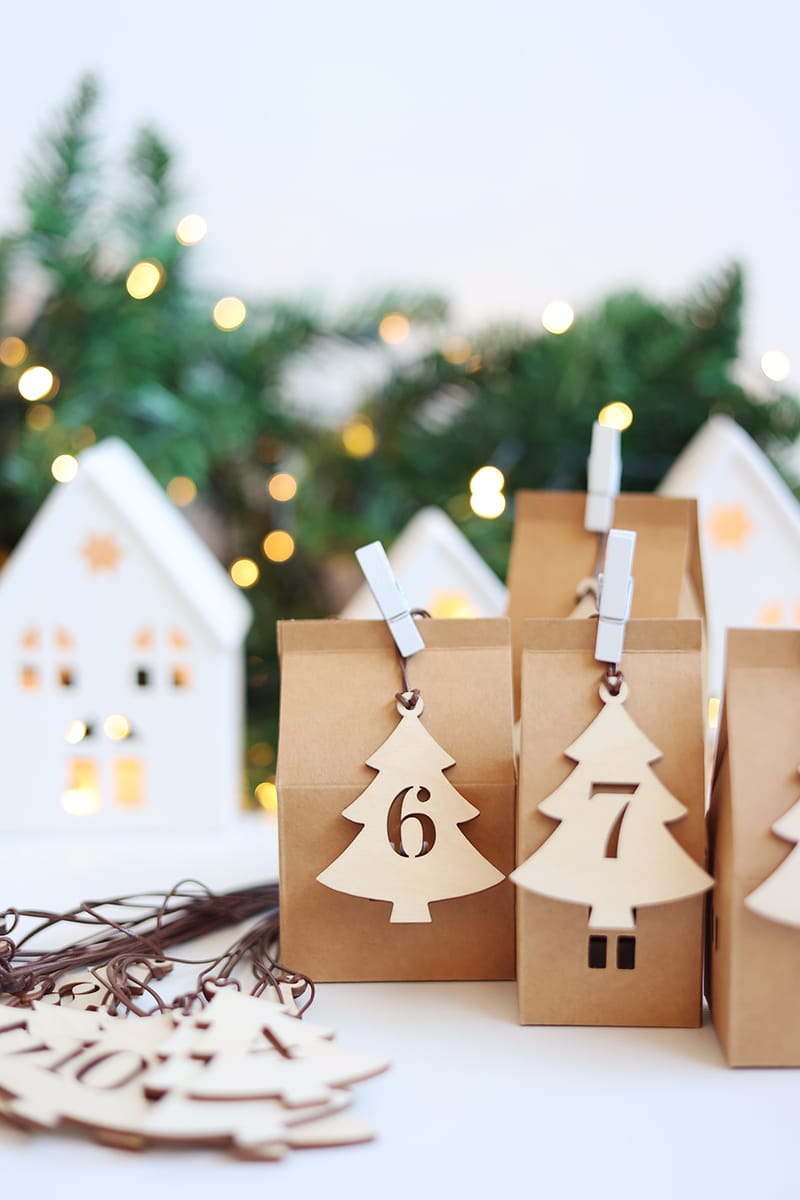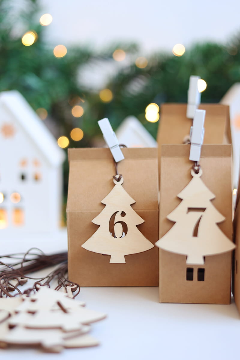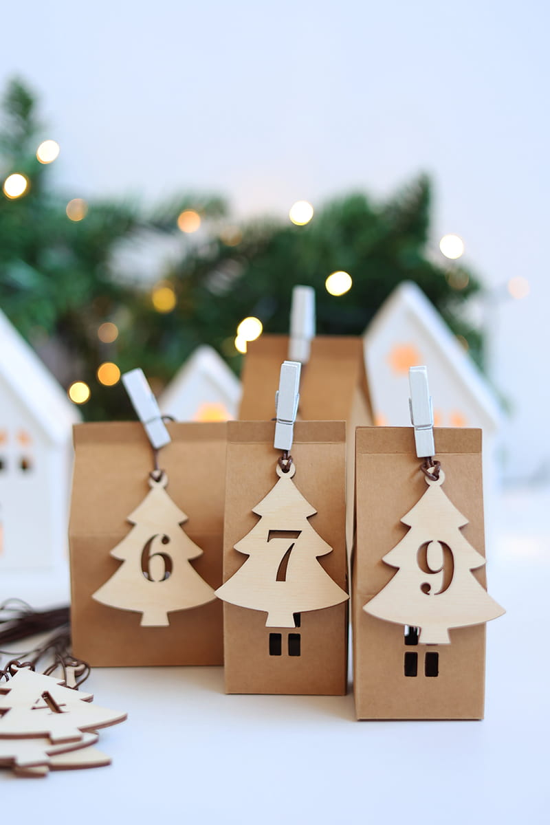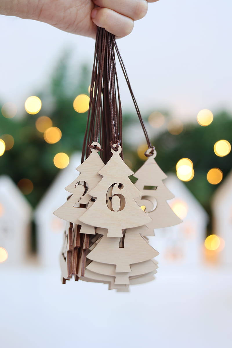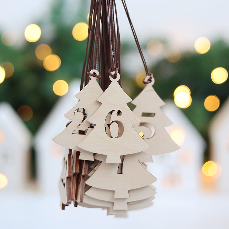Zestaw drewnianych zawieszek z wycinanymi numerami (1-24) w kształcie choinek do własnoręcznego wykonania kalendarza adwentowego.