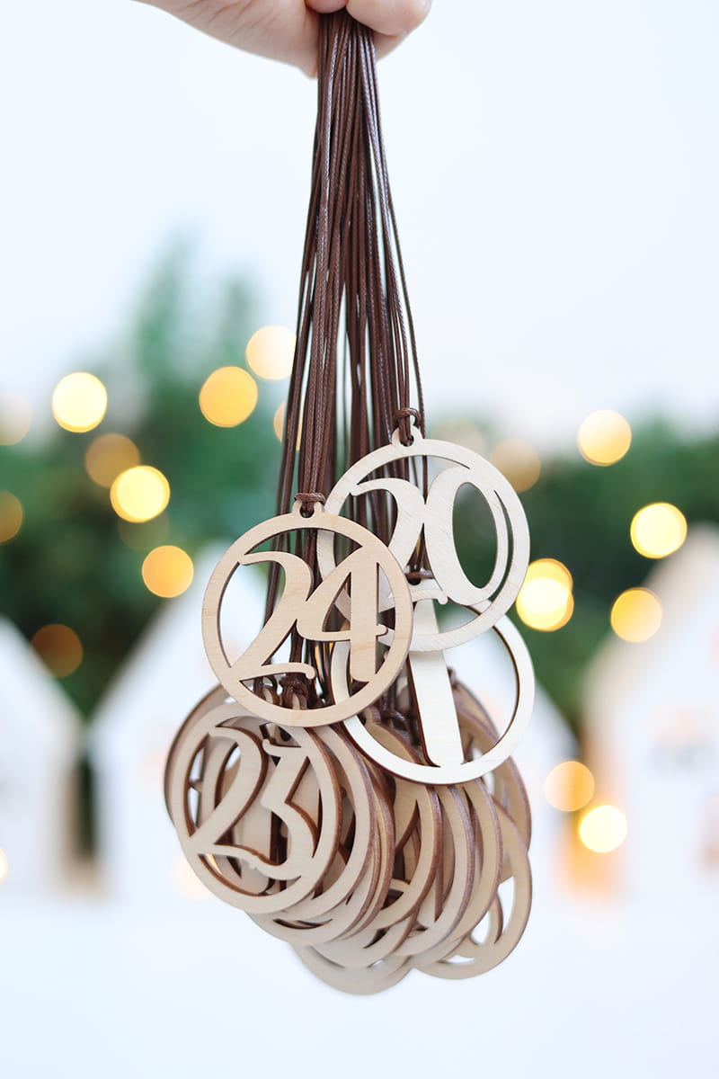 Zestaw minimalistycznych drewnianych zawieszek z wycinanymi numerami (1-24) do wykonania własnego kalendarza adwentowego.