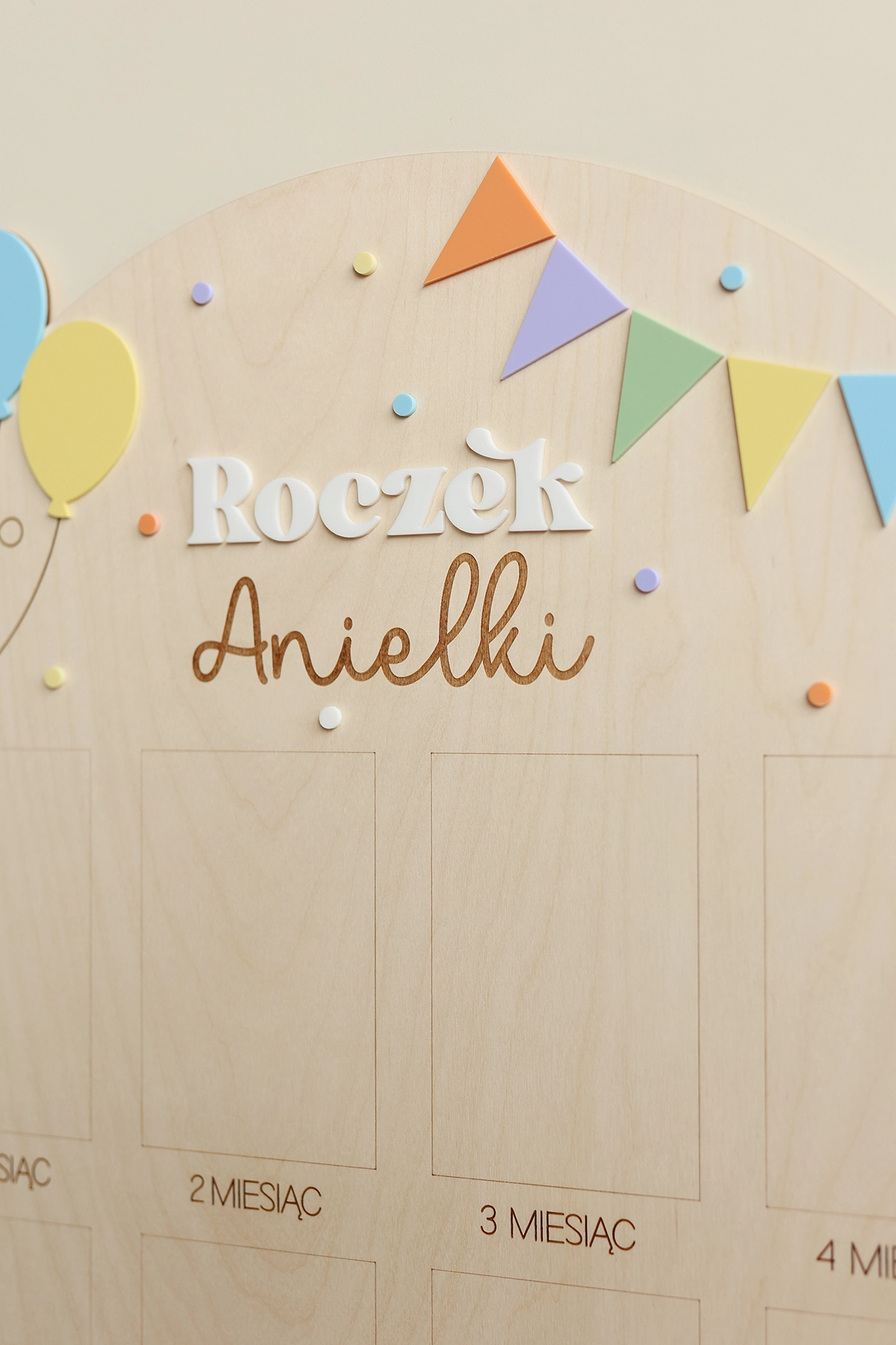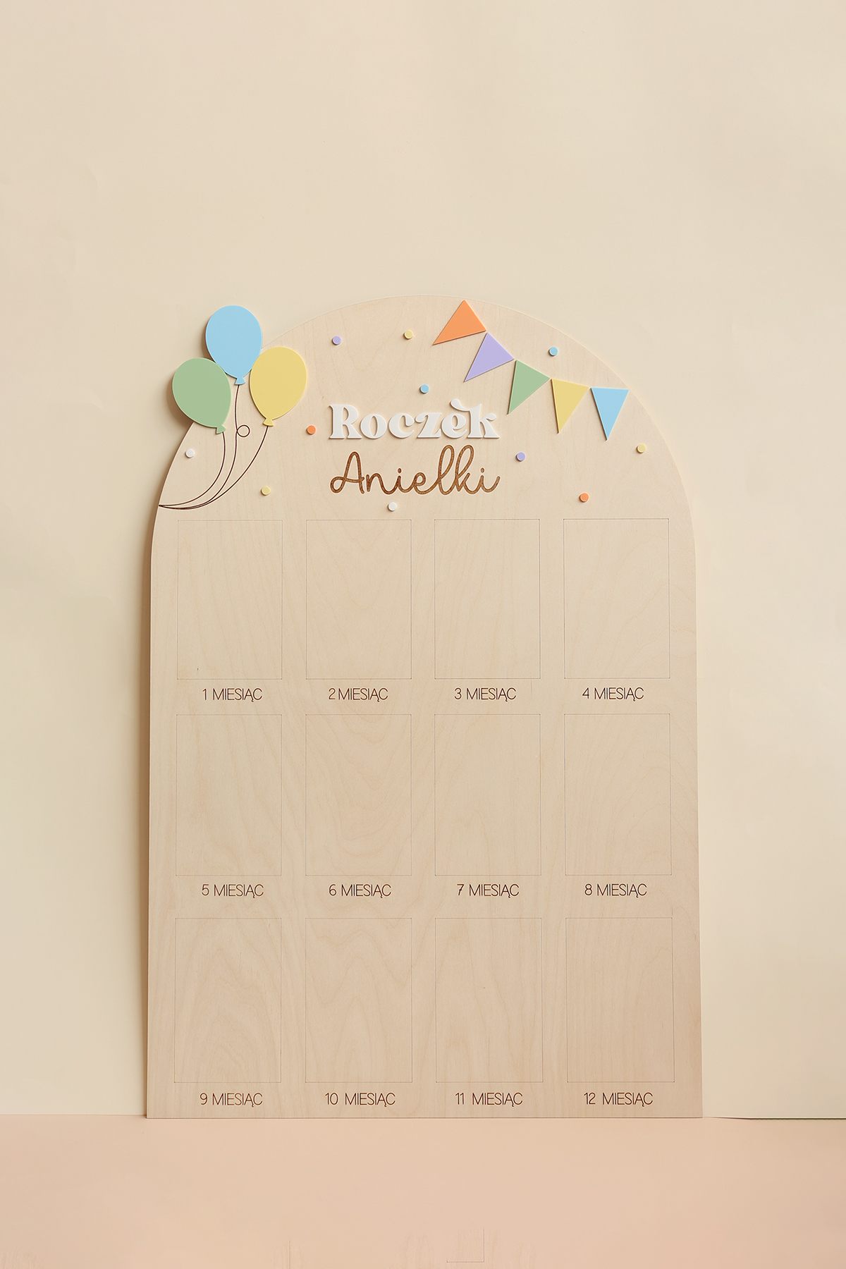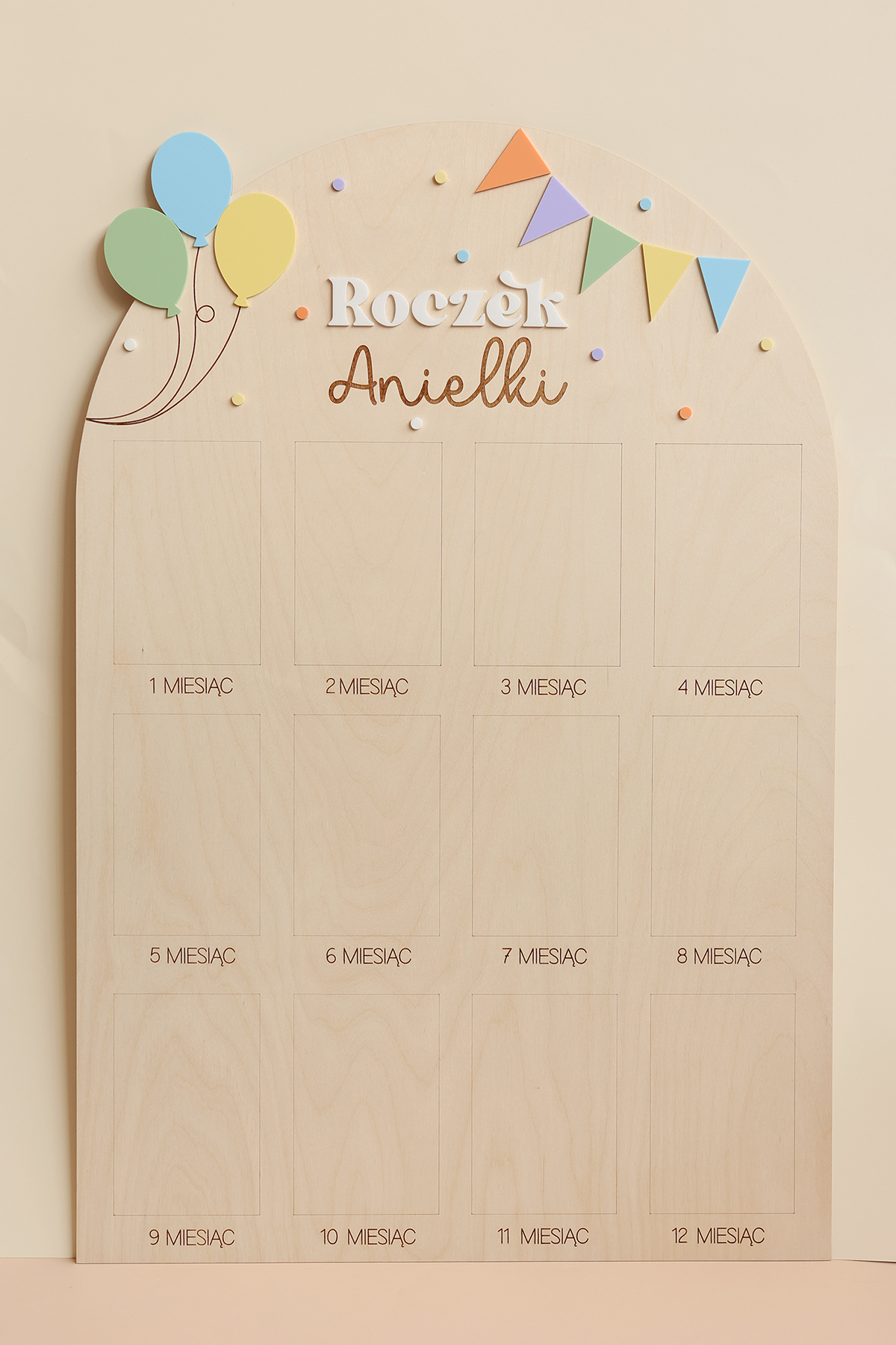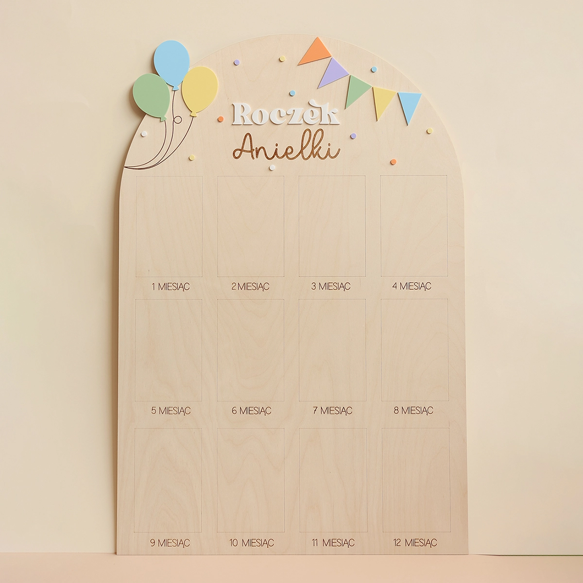 Zachowaj najpiękniejsze wspomnienia z pierwszego roku życia swojego dziecka dzięki wyjątkowej drewnianej tablicy. To doskonała pamiątka, która pozwala na wyeksponowanie 12 zdjęć podczas przyjęcia urodzinowego – po jednym z każdego miesiąca, by w piękny sposób uwiecznić niezwykłą podróż, jaką jest dorastanie maluszka.