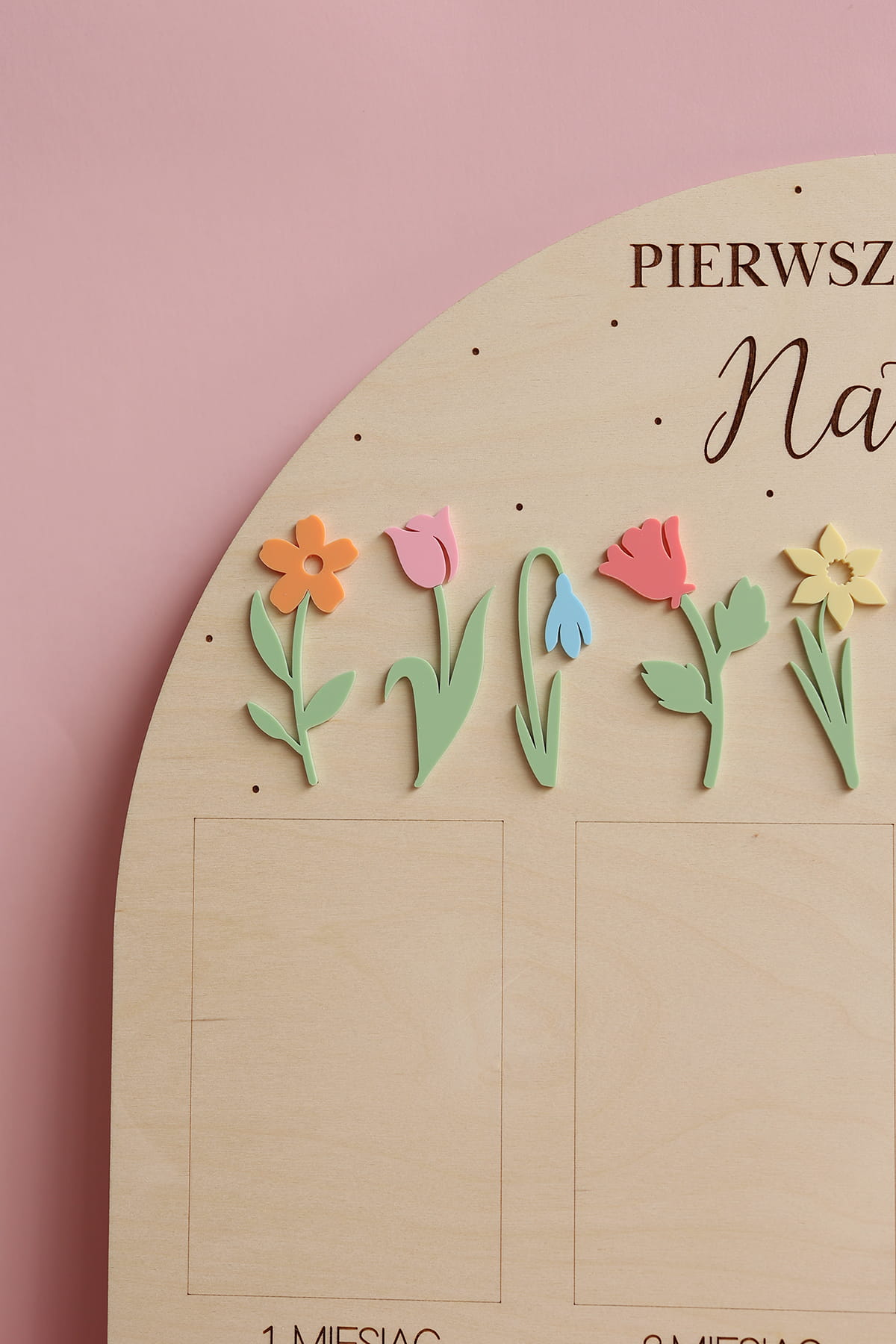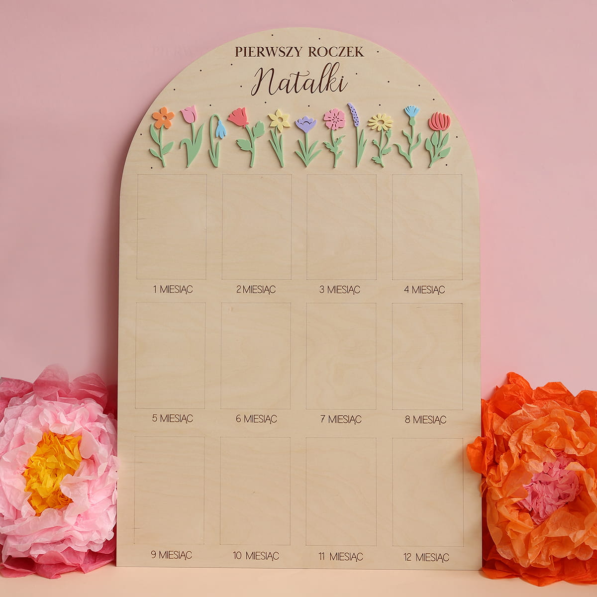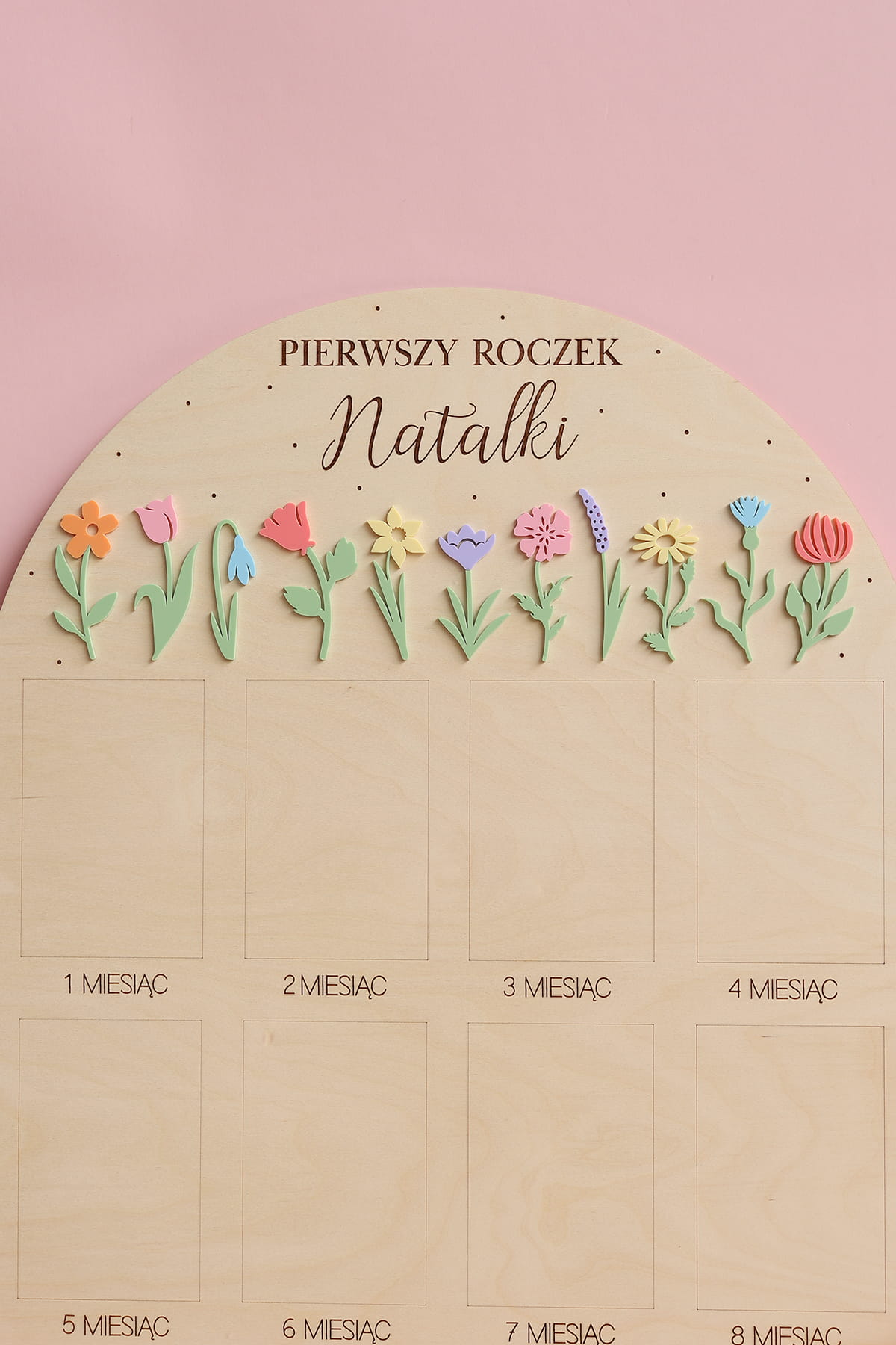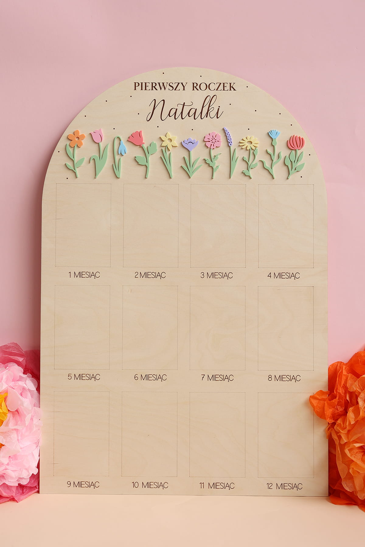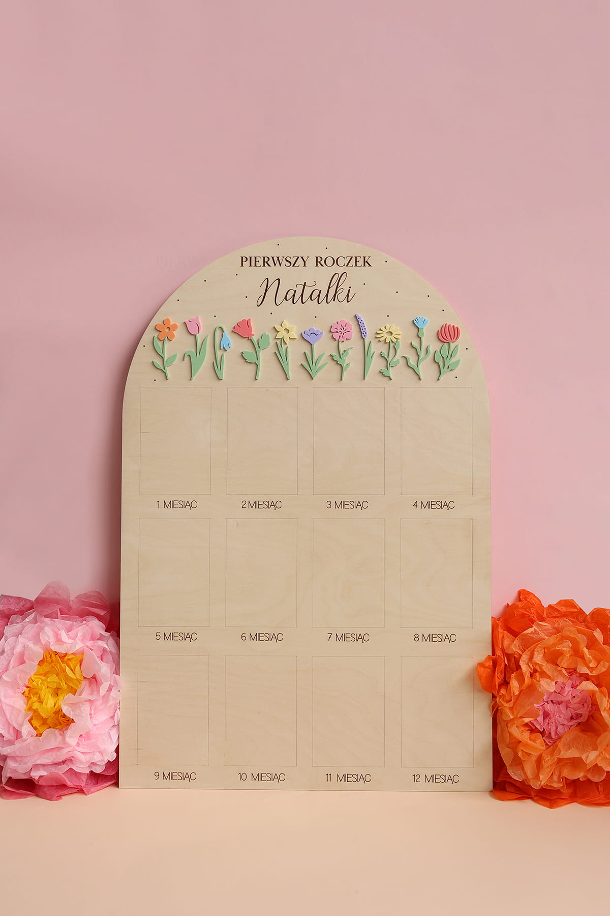 Zachowaj najpiękniejsze wspomnienia z pierwszego roku życia swojego dziecka dzięki wyjątkowej drewnianej tablicy. To doskonała pamiątka, która pozwala na wyeksponowanie 12 zdjęć podczas przyjęcia urodzinowego – po jednym z każdego miesiąca, by w piękny sposób uwiecznić niezwykłą podróż, jaką jest dorastanie maluszka.