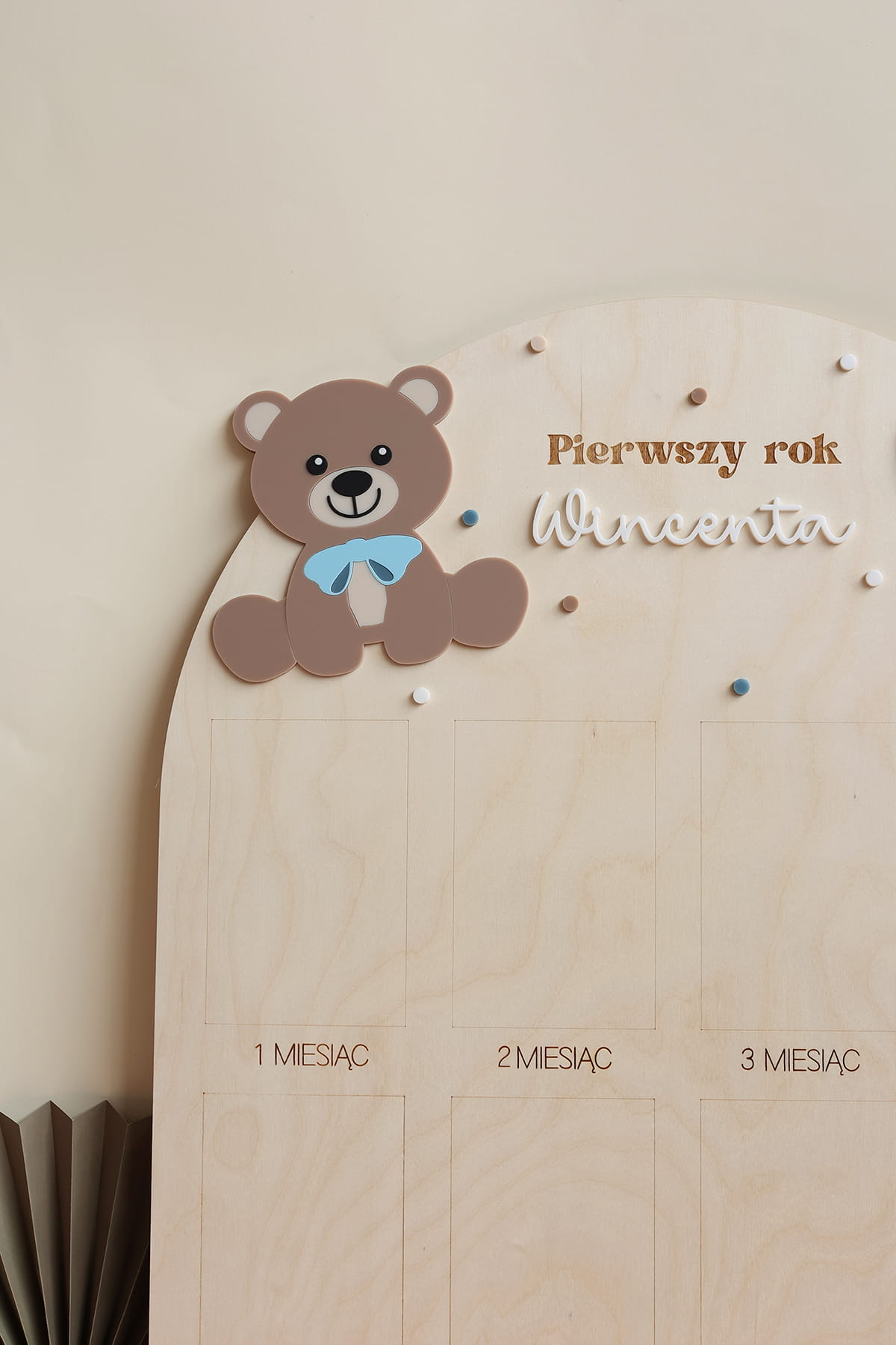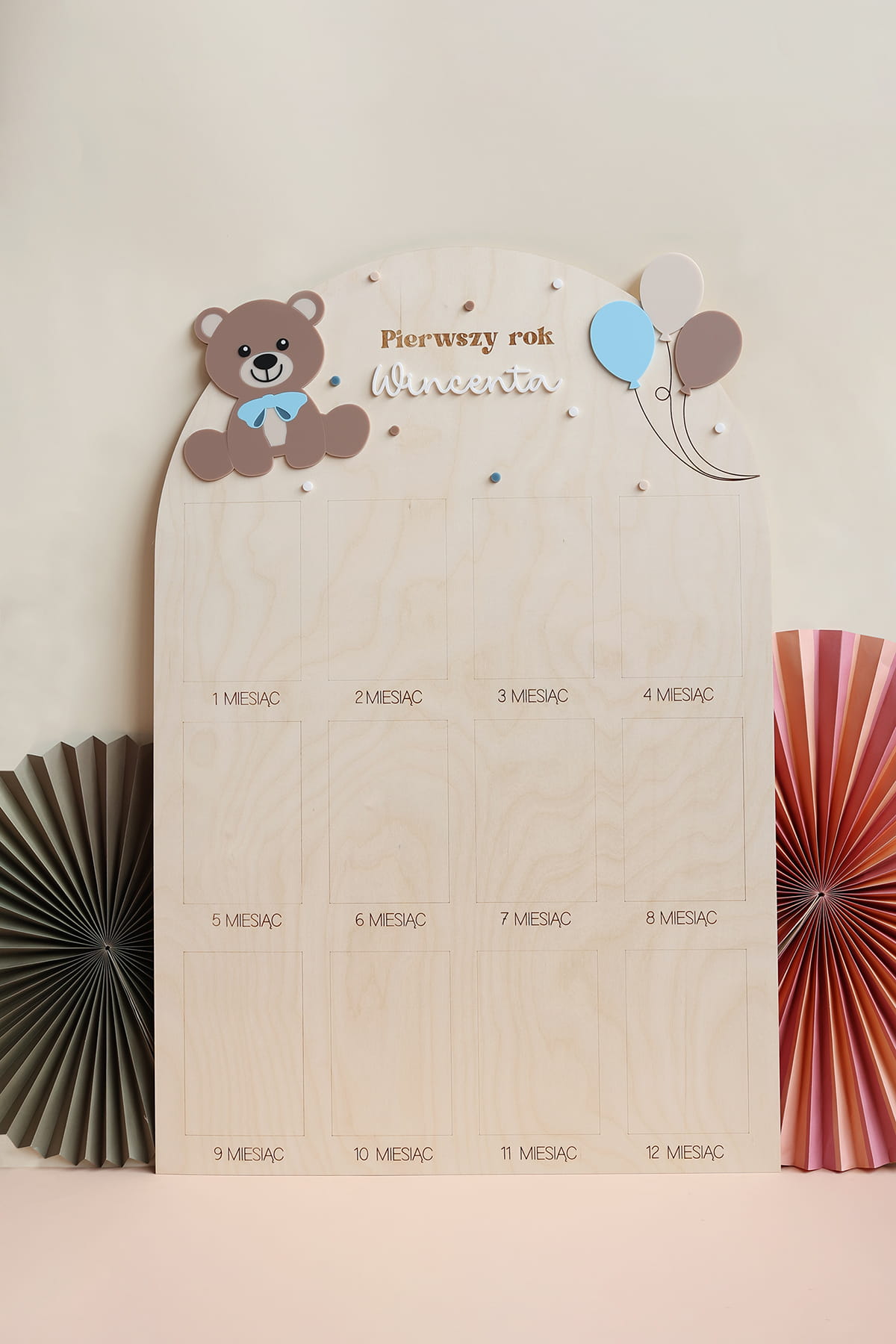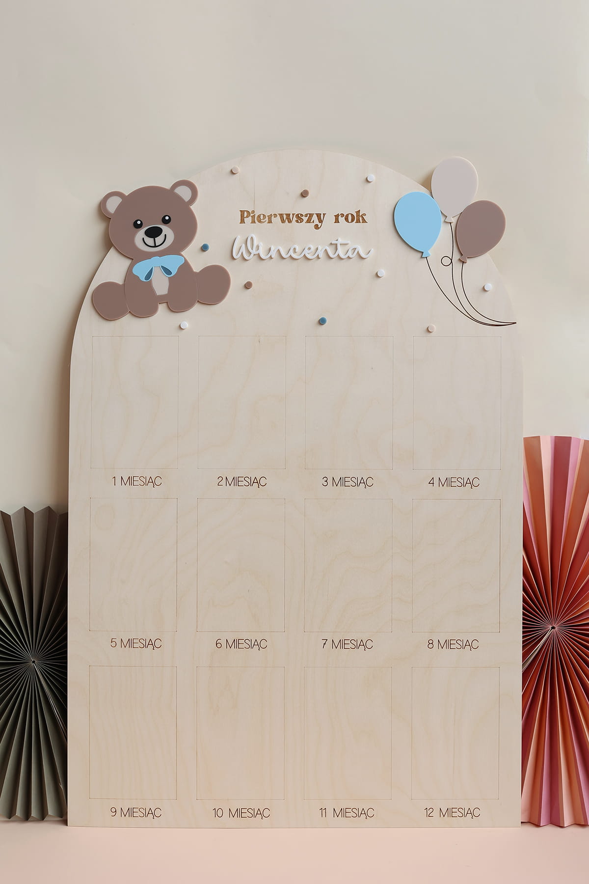 Zachowaj najpiękniejsze wspomnienia z pierwszego roku życia swojego dziecka dzięki wyjątkowej drewnianej tablicy. To doskonała pamiątka, która pozwala na wyeksponowanie 12 zdjęć podczas przyjęcia urodzinowego – po jednym z każdego miesiąca, by w piękny sposób uwiecznić niezwykłą podróż, jaką jest dorastanie maluszka.
