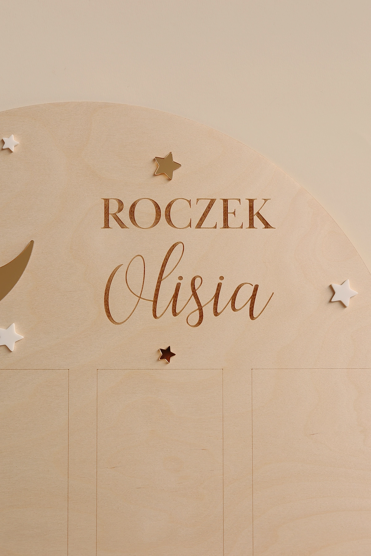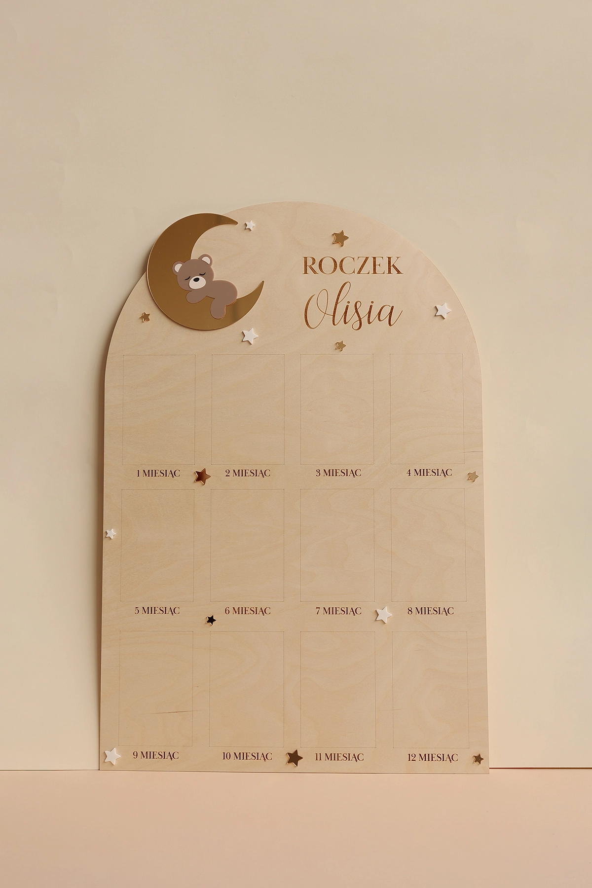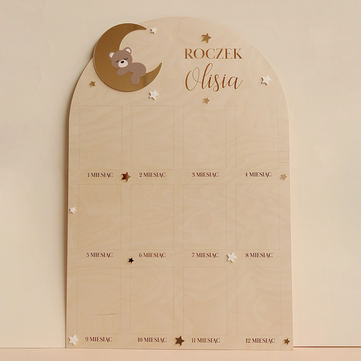 Zachowaj najpiękniejsze wspomnienia z pierwszego roku życia swojego dziecka dzięki wyjątkowej drewnianej tablicy. To doskonała pamiątka, która pozwala na wyeksponowanie 12 zdjęć podczas przyjęcia urodzinowego – po jednym z każdego miesiąca, by w piękny sposób uwiecznić niezwykłą podróż, jaką jest dorastanie maluszka.