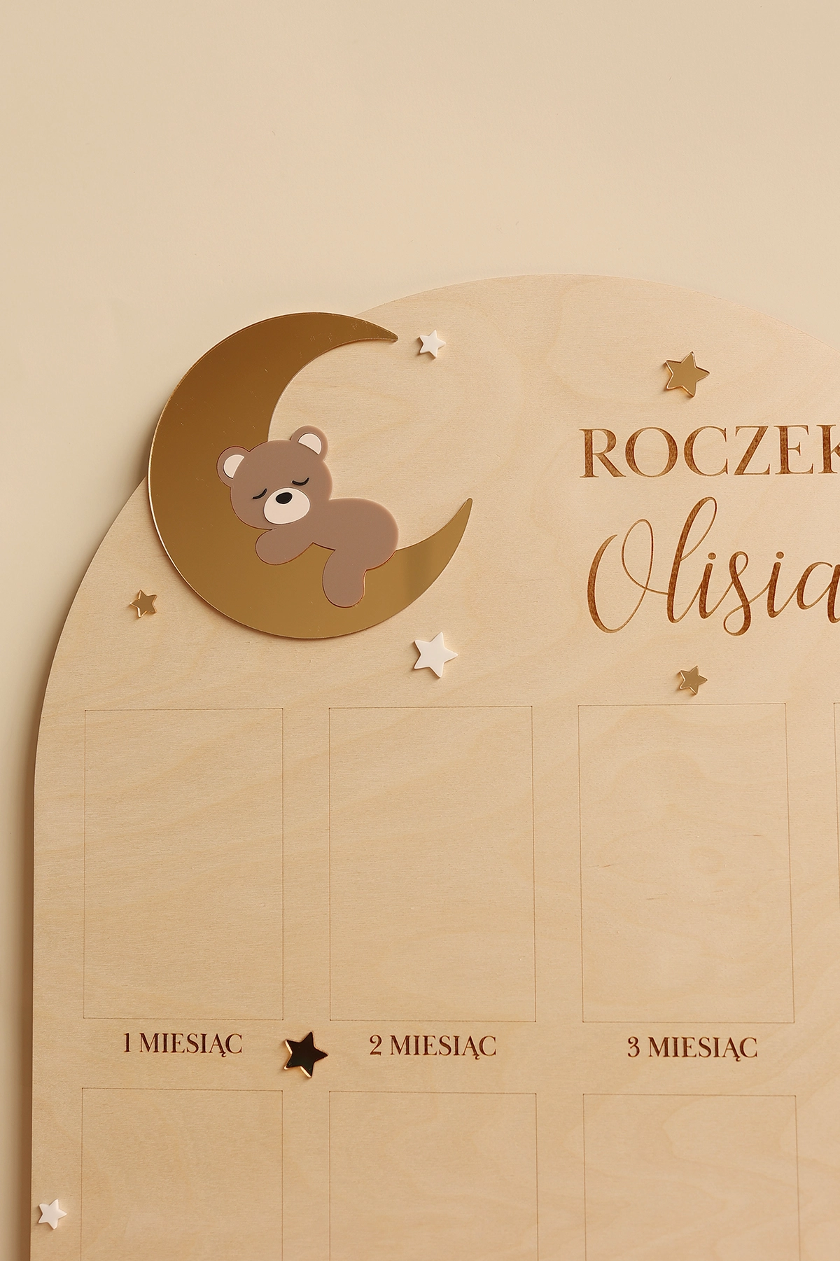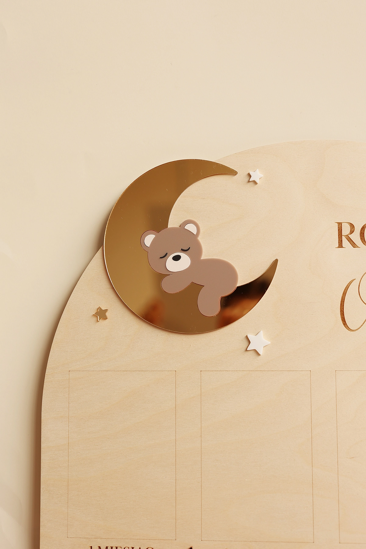Tablica ozdobiona jest uroczym misiem na złotym księżycu oraz białymi i złotymi gwiazdkami.