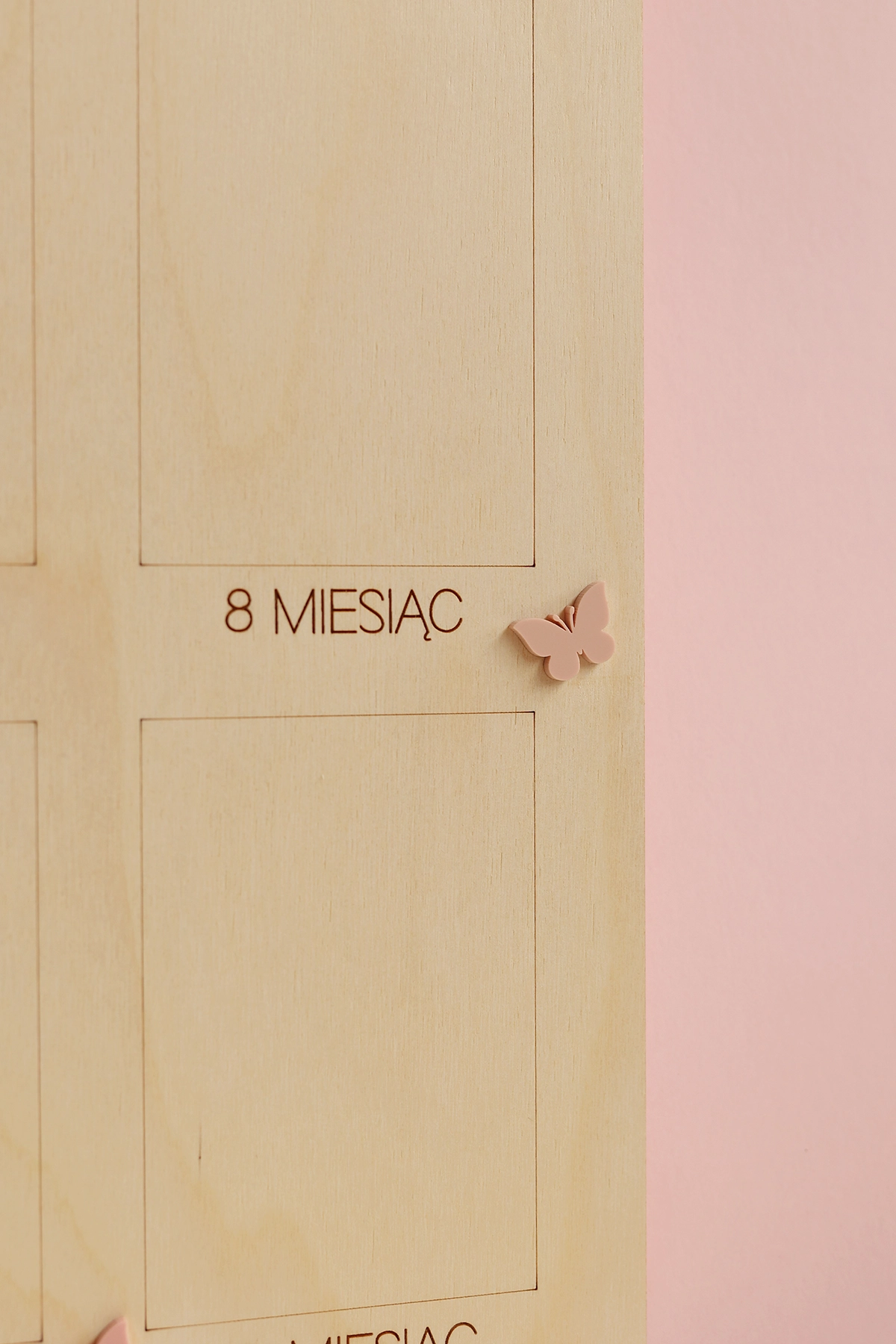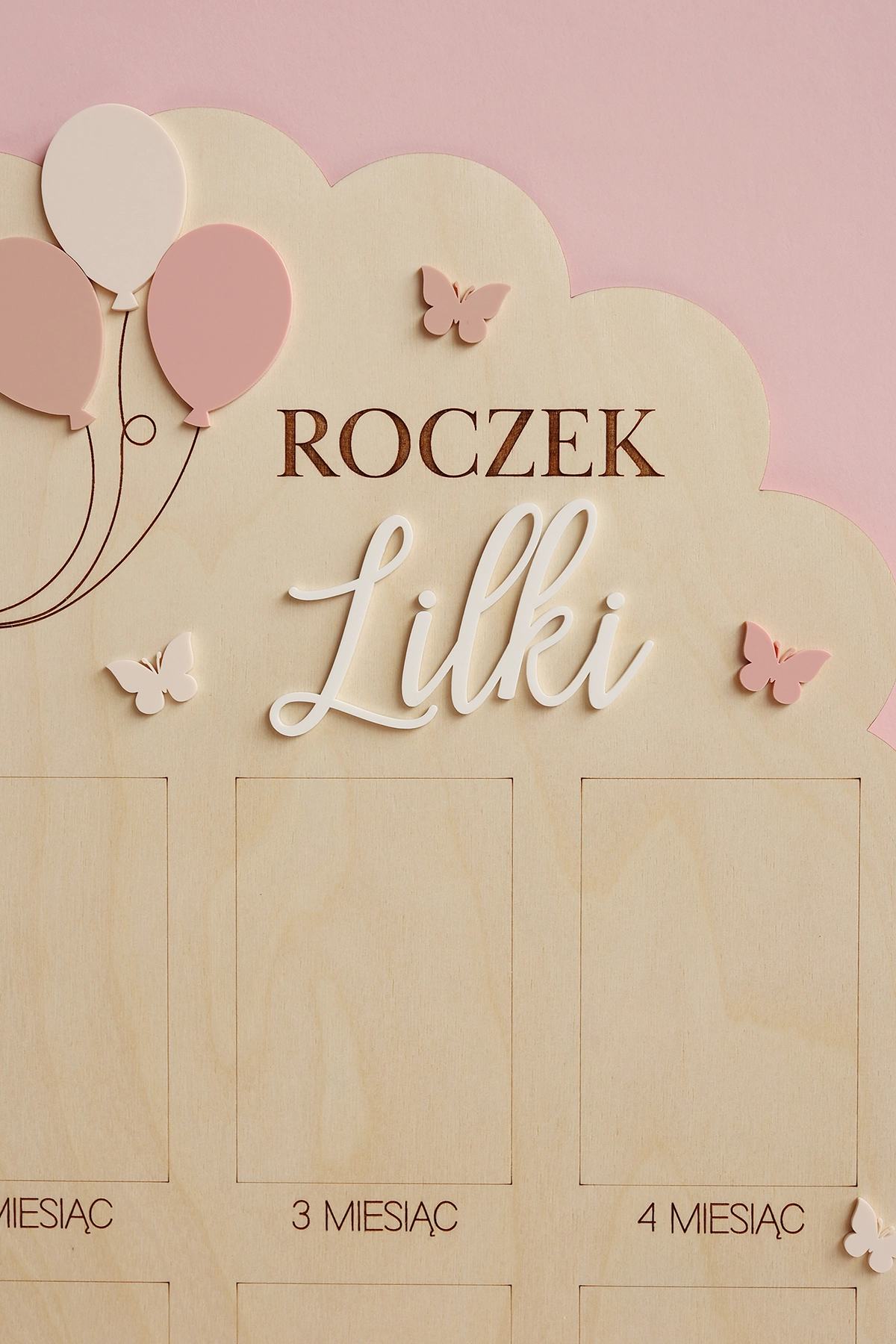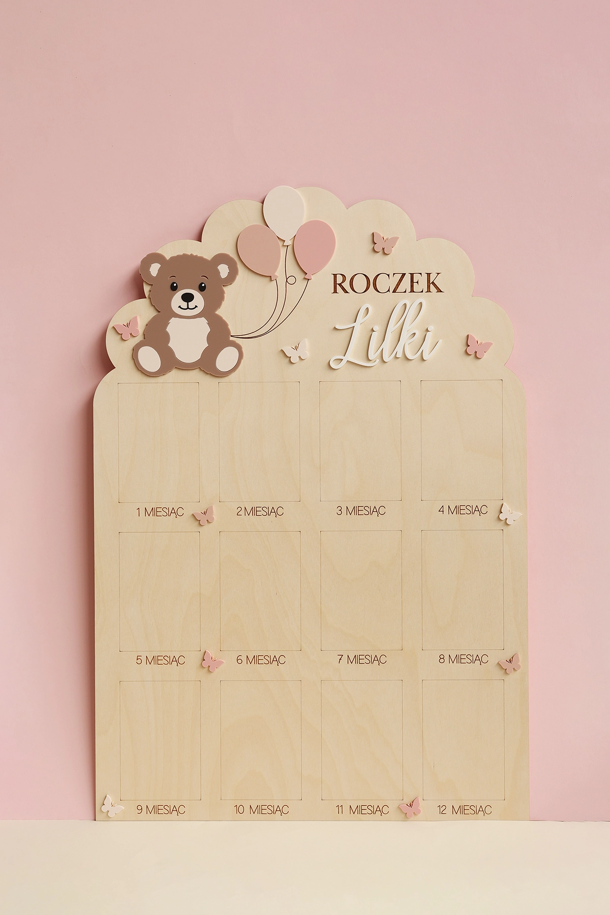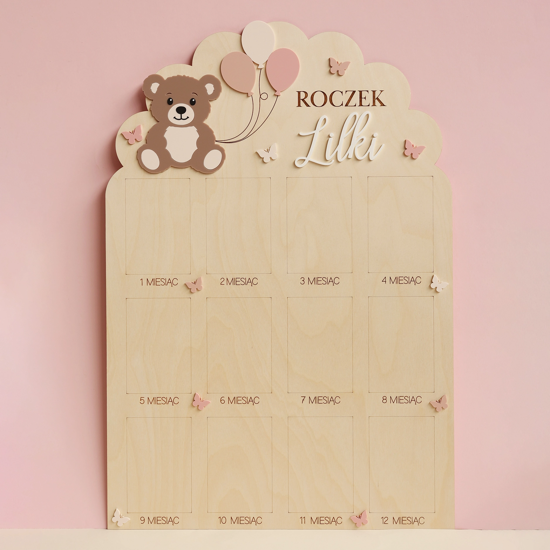 Zachowaj najpiękniejsze wspomnienia z pierwszego roku życia swojego dziecka dzięki wyjątkowej drewnianej tablicy. To doskonała pamiątka, która pozwala na wyeksponowanie 12 zdjęć podczas przyjęcia urodzinowego – po jednym z każdego miesiąca, by w piękny sposób uwiecznić niezwykłą podróż, jaką jest dorastanie maluszka.
