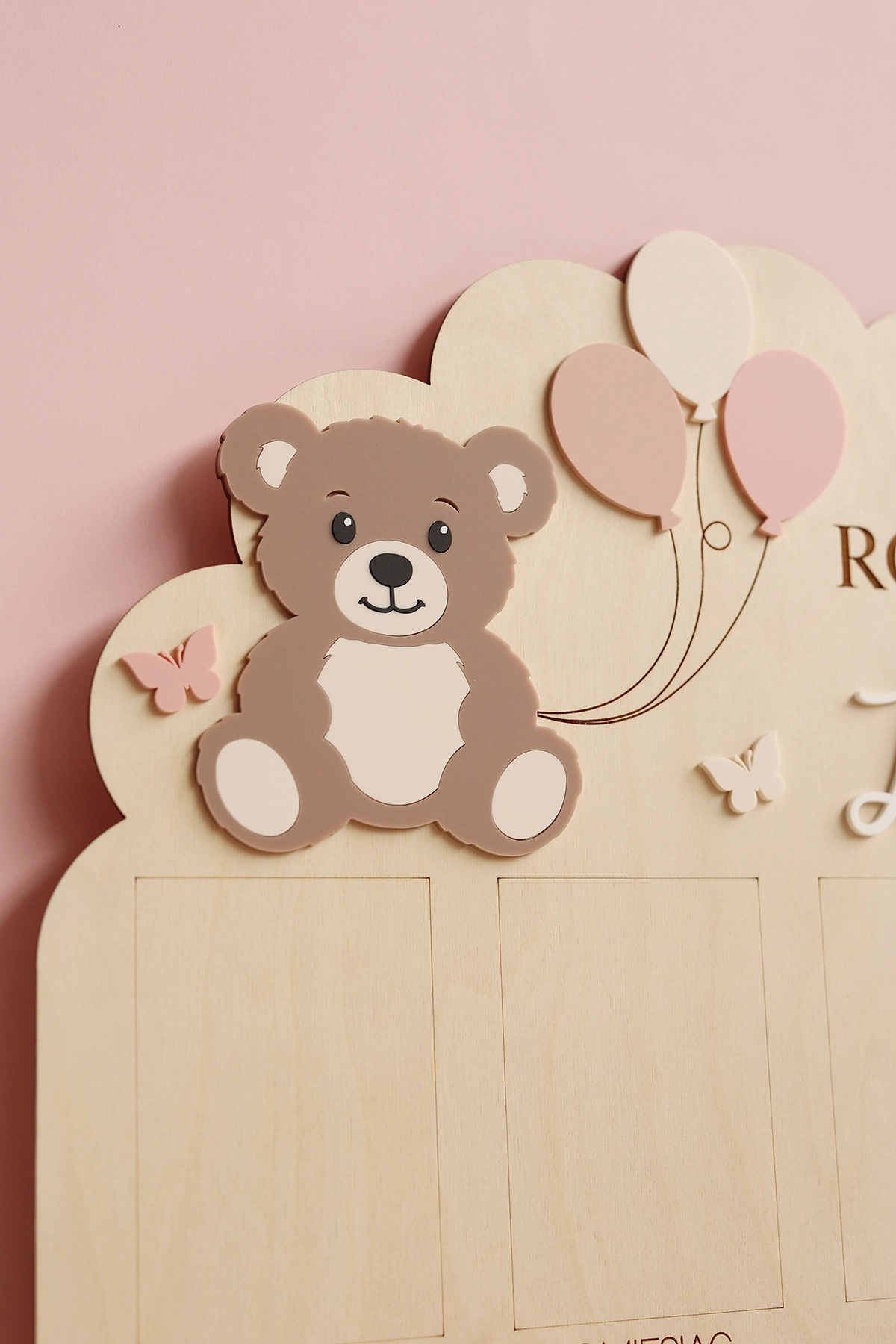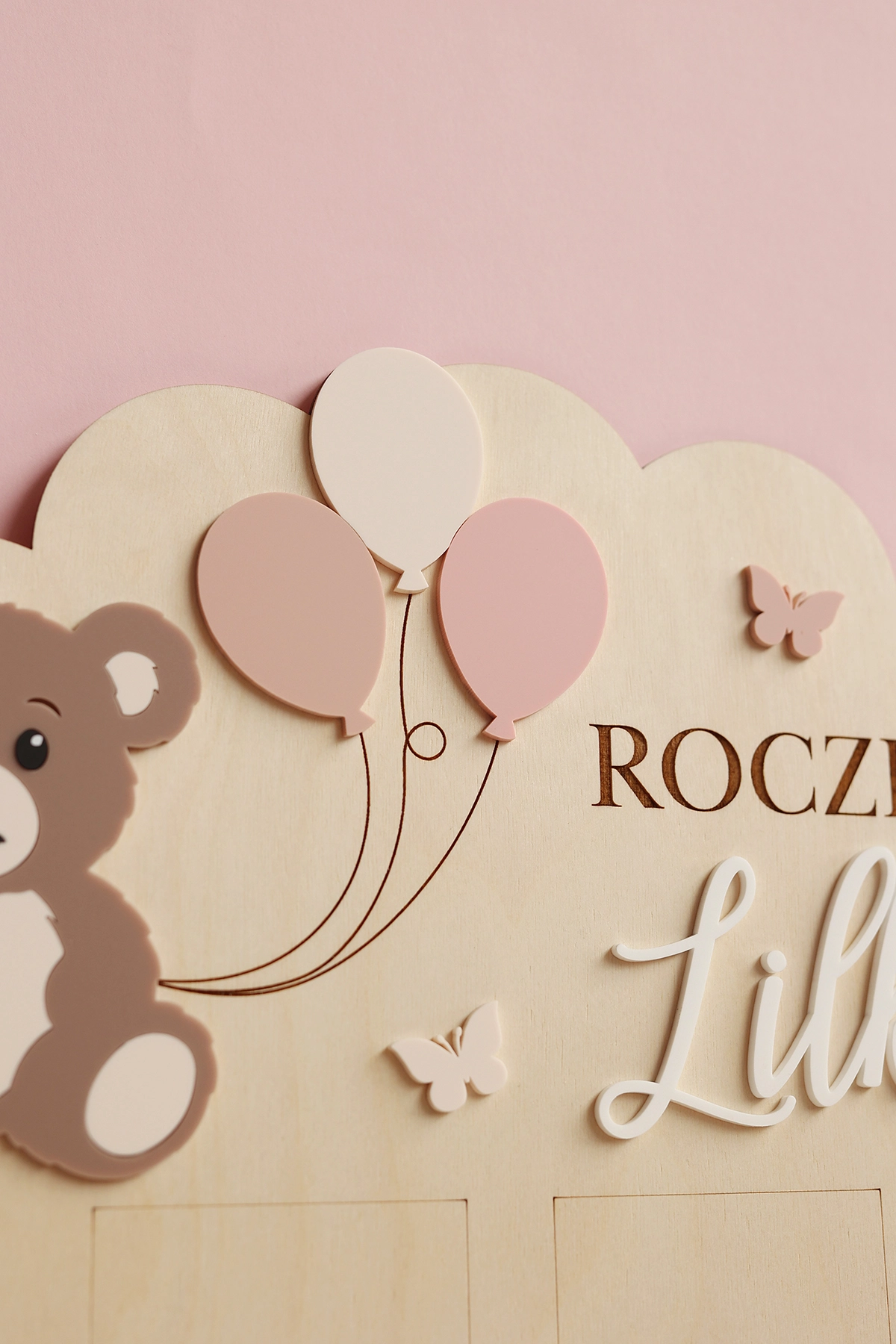 Tablica ozdobiona jest uroczym misiem, motylkami i urodzinowymi balonikami.