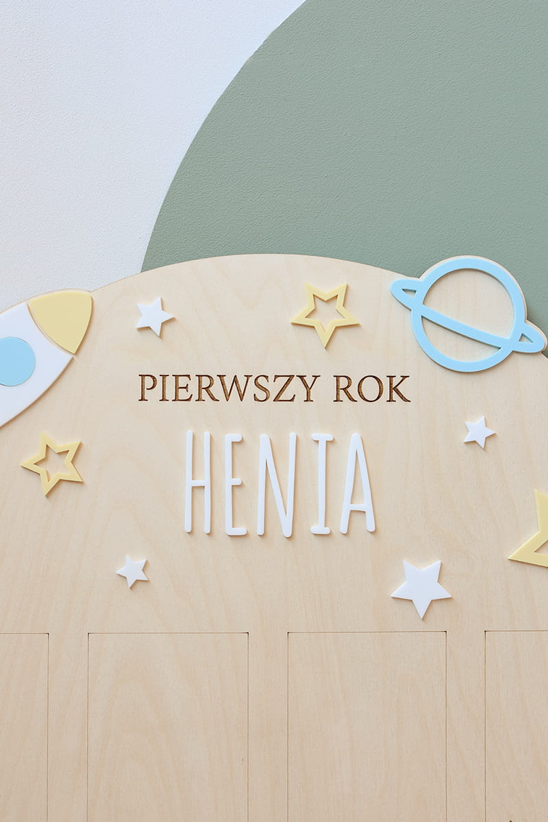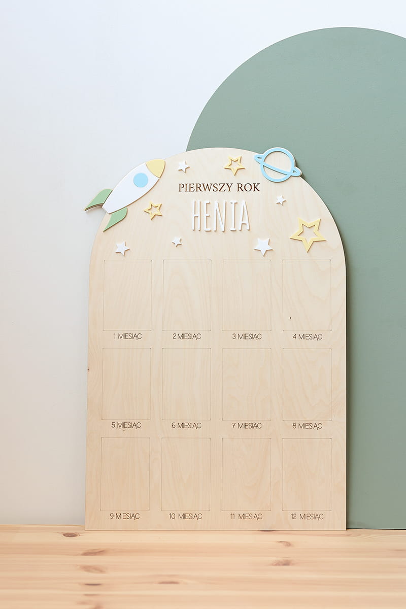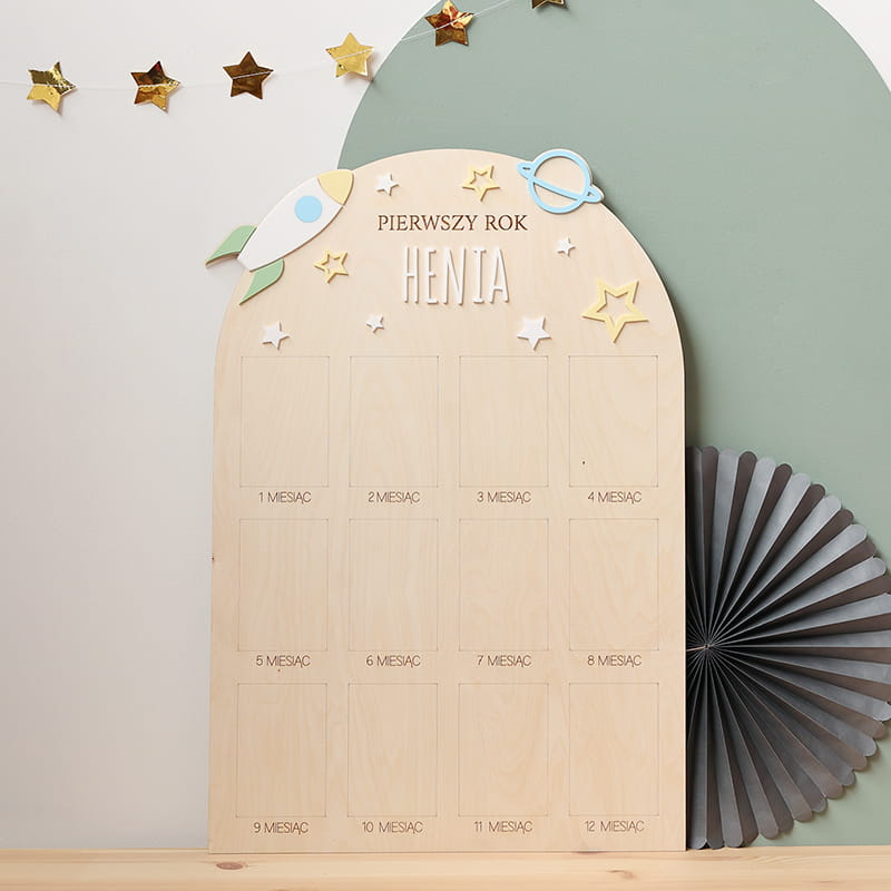 Zachowaj najpiękniejsze wspomnienia z pierwszego roku życia swojego dziecka dzięki wyjątkowej drewnianej tablicy. To doskonała pamiątka, która pozwala na wyeksponowanie 12 zdjęć podczas przyjęcia urodzinowego – po jednym z każdego miesiąca, by w piękny sposób uwiecznić niezwykłą podróż, jaką jest dorastanie maluszka.
