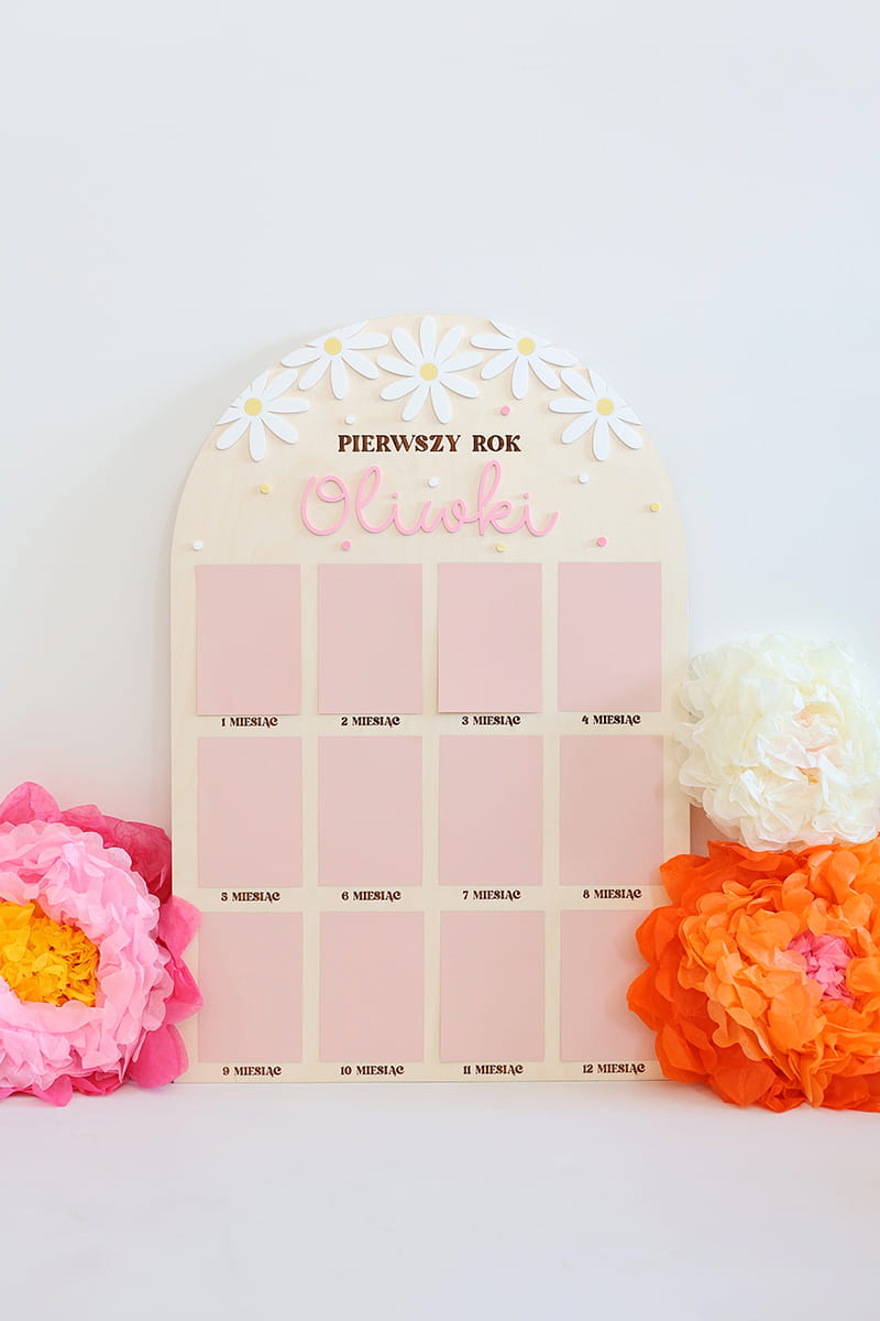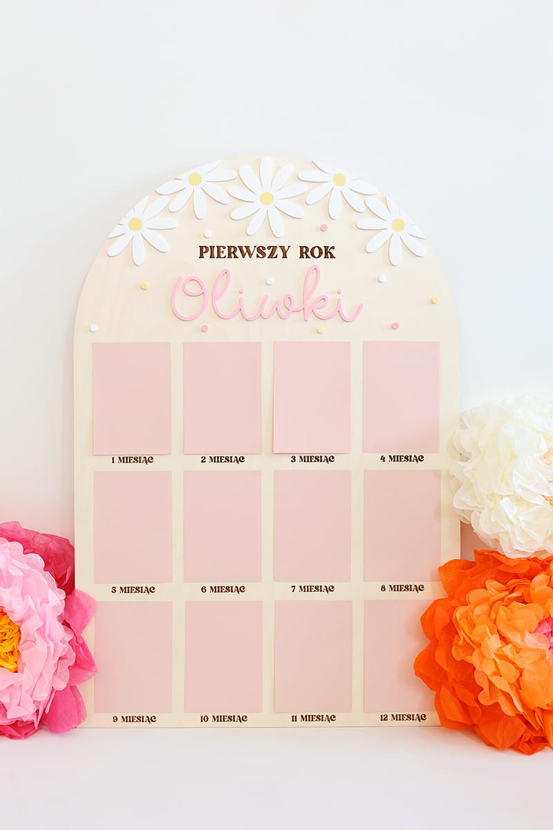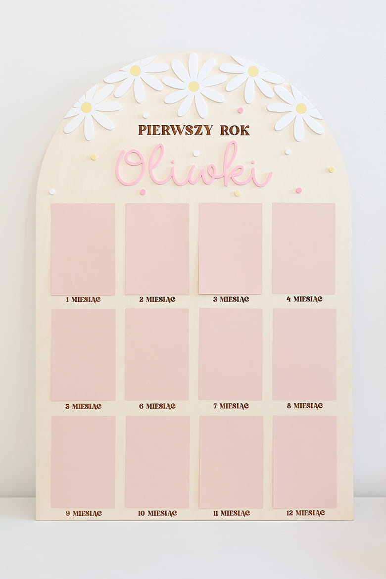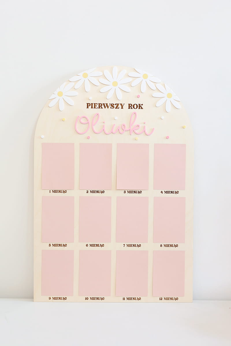 Zachowaj najpiękniejsze wspomnienia z pierwszego roku życia swojego dziecka dzięki wyjątkowej drewnianej tablicy. To doskonała pamiątka, która pozwala na wyeksponowanie 12 zdjęć podczas przyjęcia urodzinowego – po jednym z każdego miesiąca, by w piękny sposób uwiecznić niezwykłą podróż, jaką jest dorastanie maluszka.