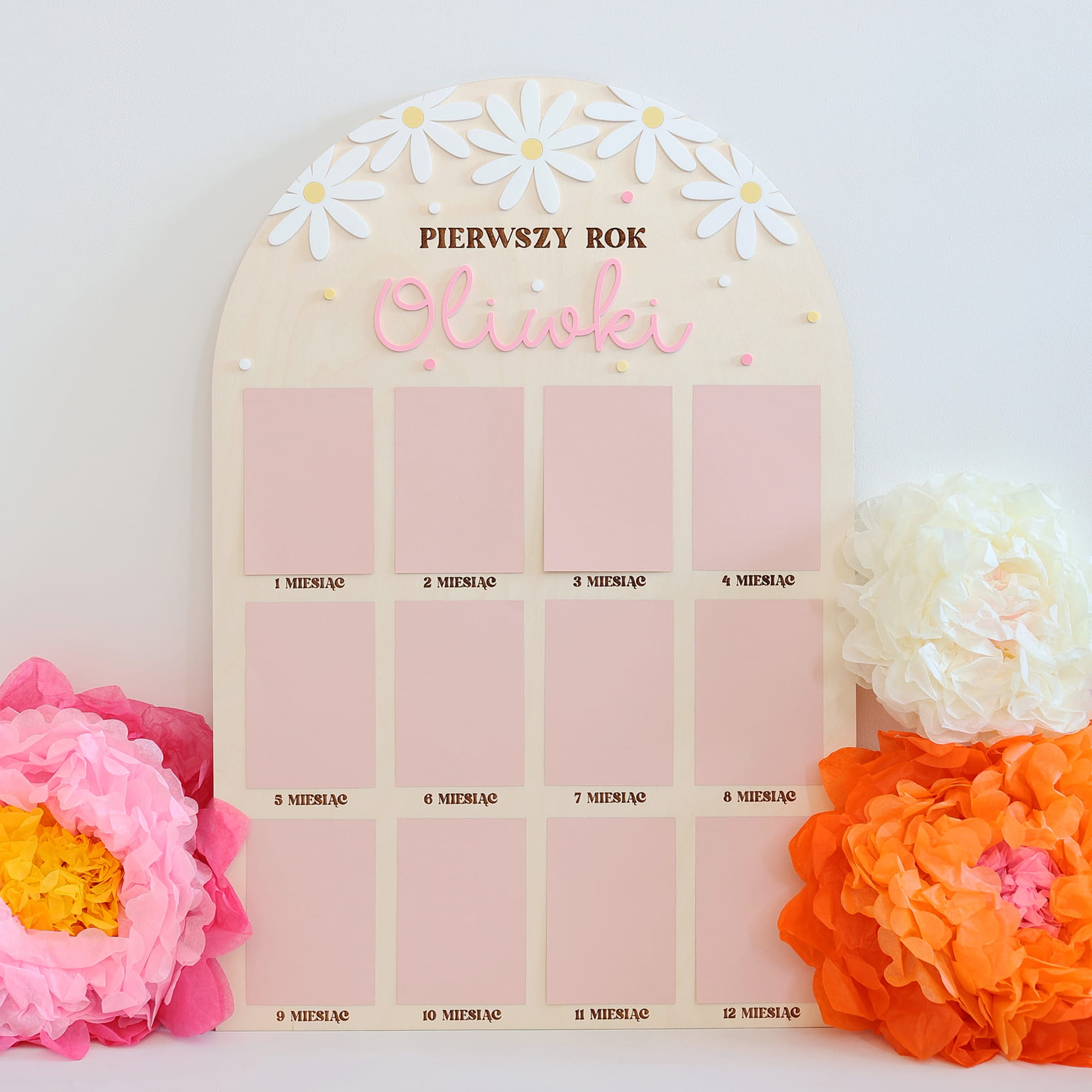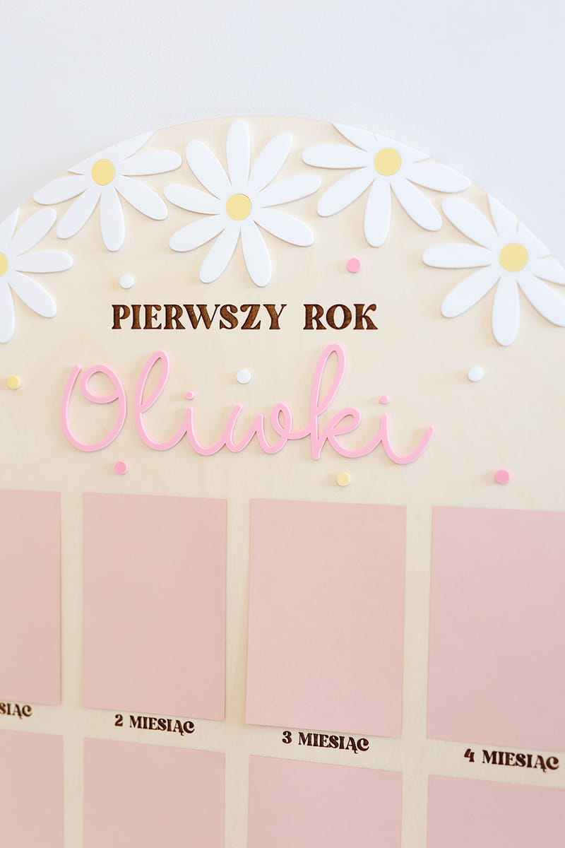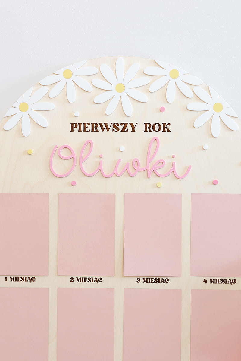 Zachowaj najpiękniejsze wspomnienia z pierwszego roku życia swojego dziecka dzięki wyjątkowej drewnianej tablicy. To doskonała pamiątka, która pozwala na wyeksponowanie 12 zdjęć podczas przyjęcia urodzinowego – po jednym z każdego miesiąca, by w piękny sposób uwiecznić niezwykłą podróż, jaką jest dorastanie maluszka.