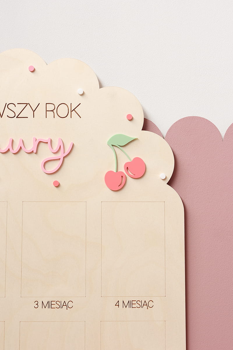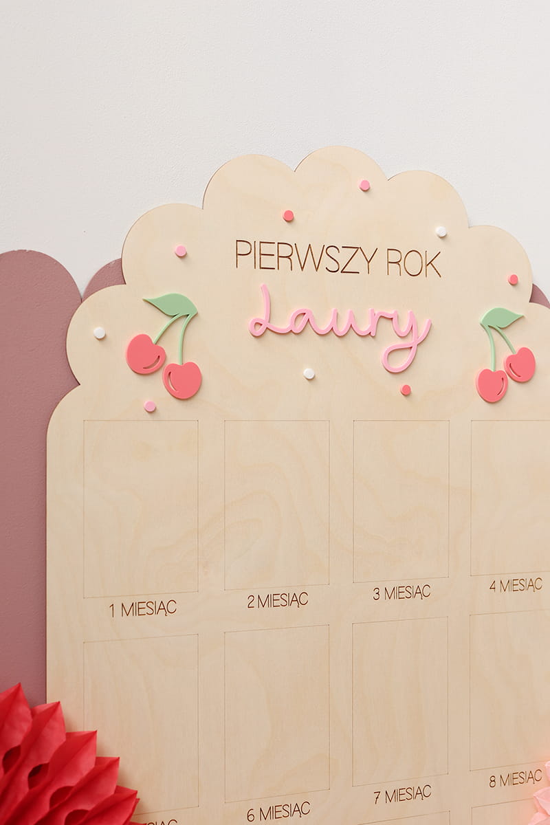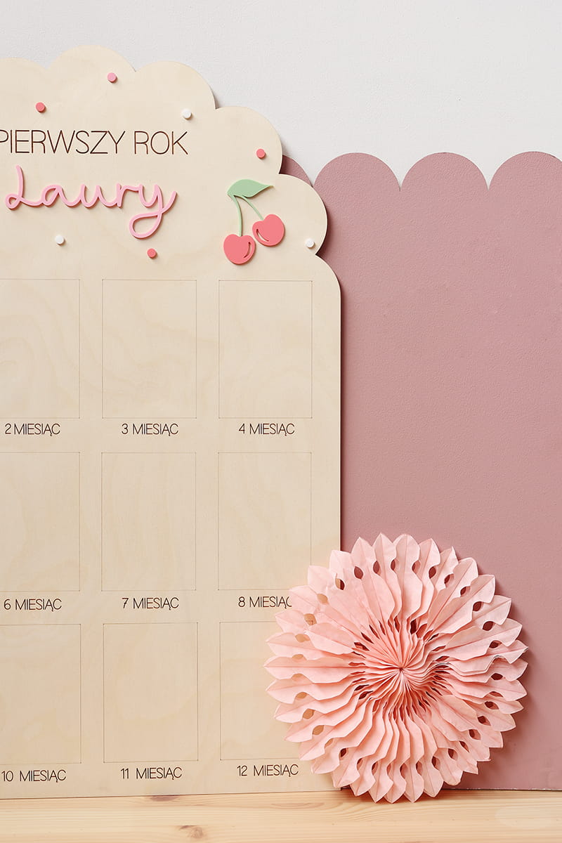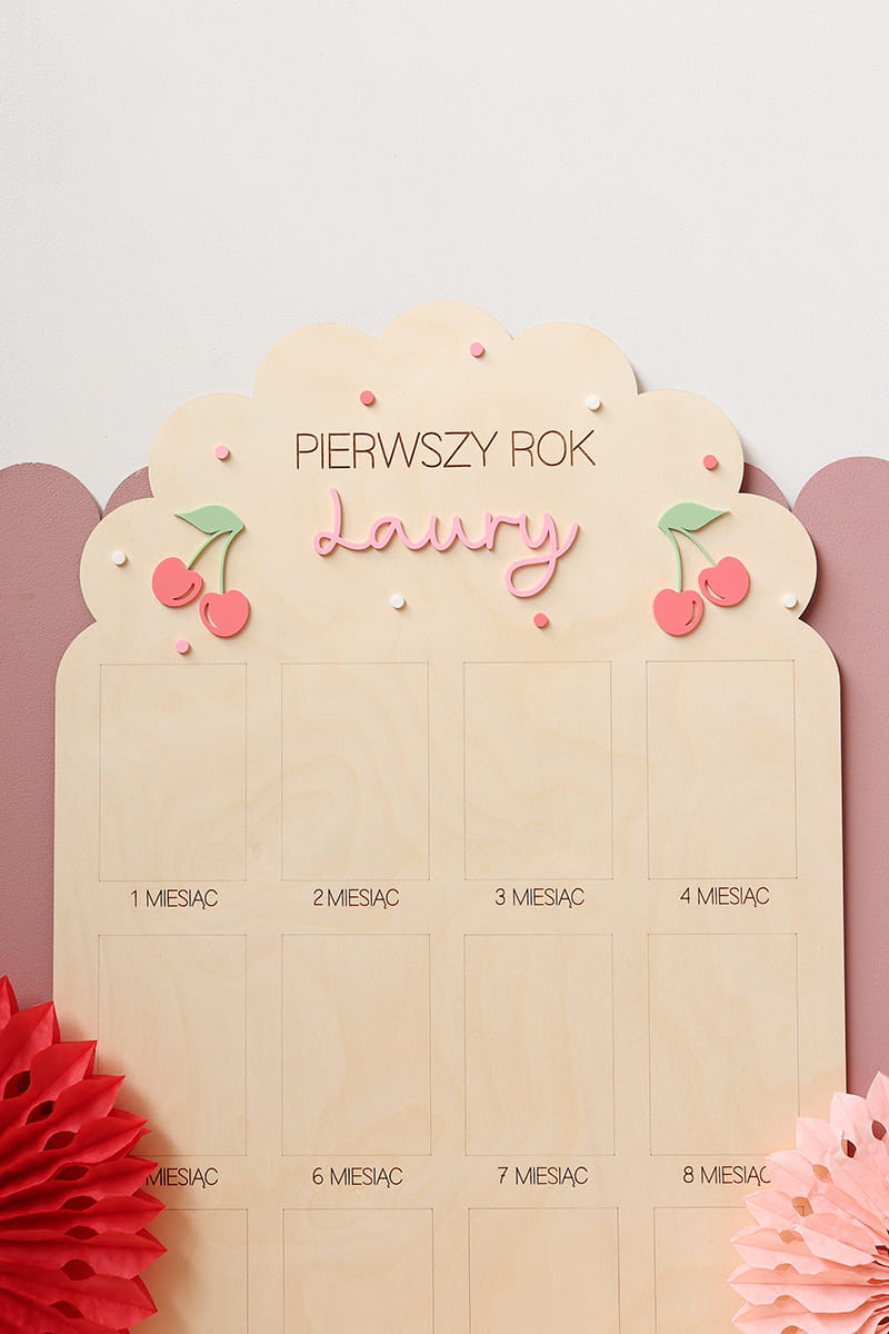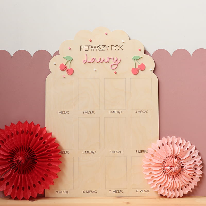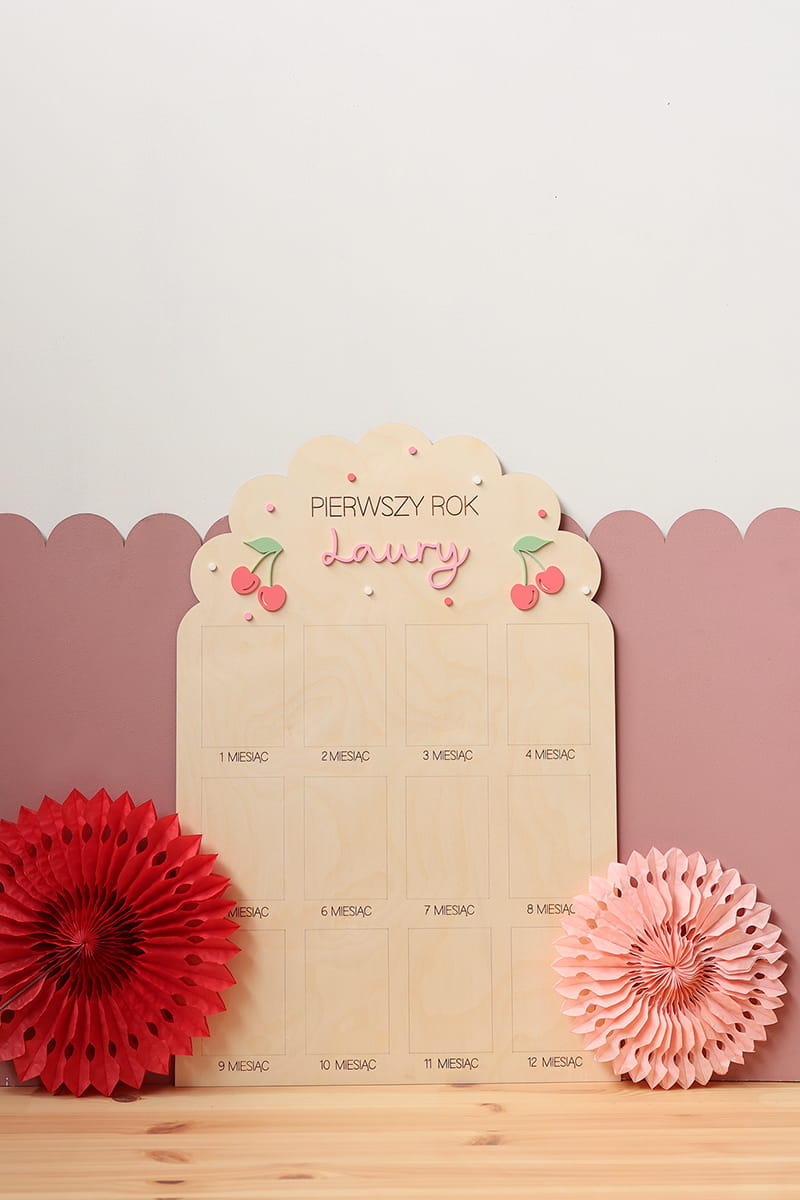Zachowaj najpiękniejsze wspomnienia z pierwszego roku życia swojego dziecka dzięki wyjątkowej drewnianej tablicy. To doskonała pamiątka, która pozwala na wyeksponowanie 12 zdjęć podczas przyjęcia urodzinowego – po jednym z każdego miesiąca, by w piękny sposób uwiecznić niezwykłą podróż, jaką jest dorastanie maluszka.